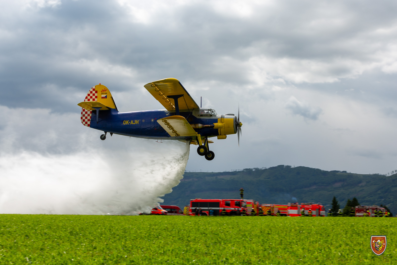 Po instruktáži pilotů a obsluhy “Anduly” hasiči prováděli po jednotlivých skupinách opakovaně naplnění letounu vodou, kterou pilot následně shazoval na předem dohodnuté místo.