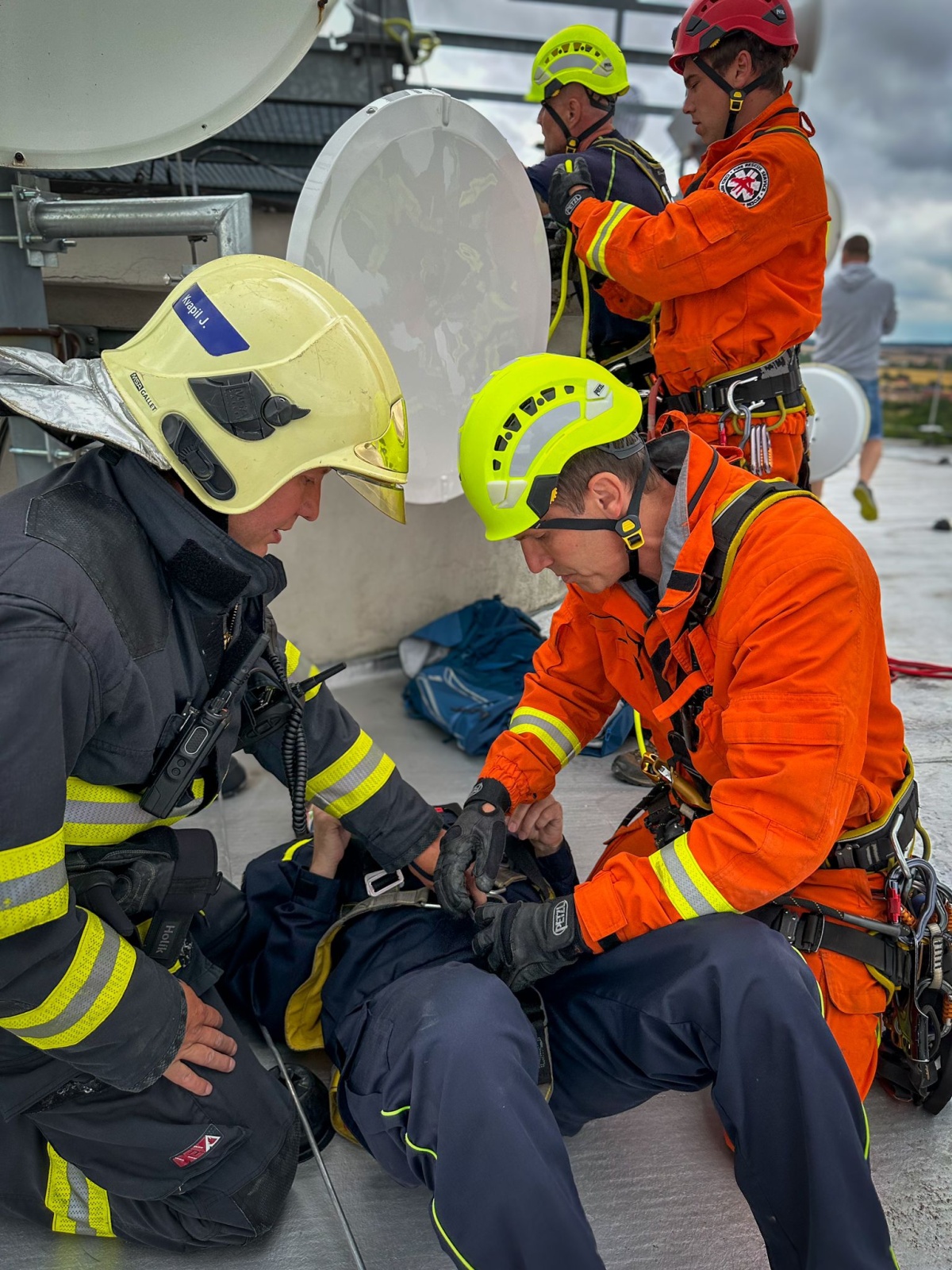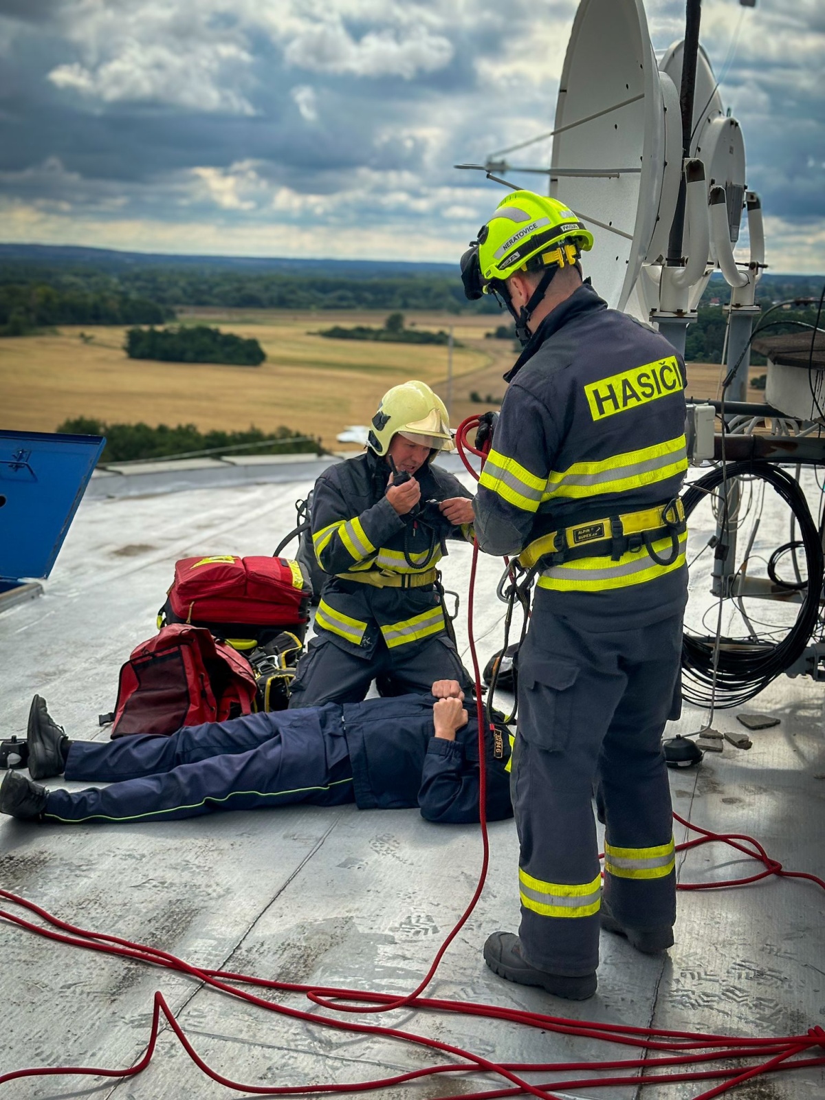 Při údržbě věžového vodojemu v blízkosti obce Kojetice se jednomu z techniků udělalo nevolno – to byl námět prověřovacího cvičení, které se ve středu 3. července v dopoledních hodinách uskutečnilo na Mělnicku.