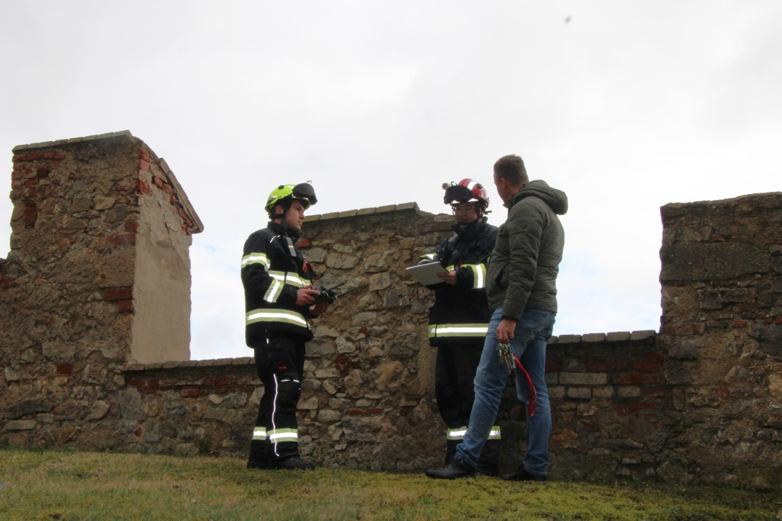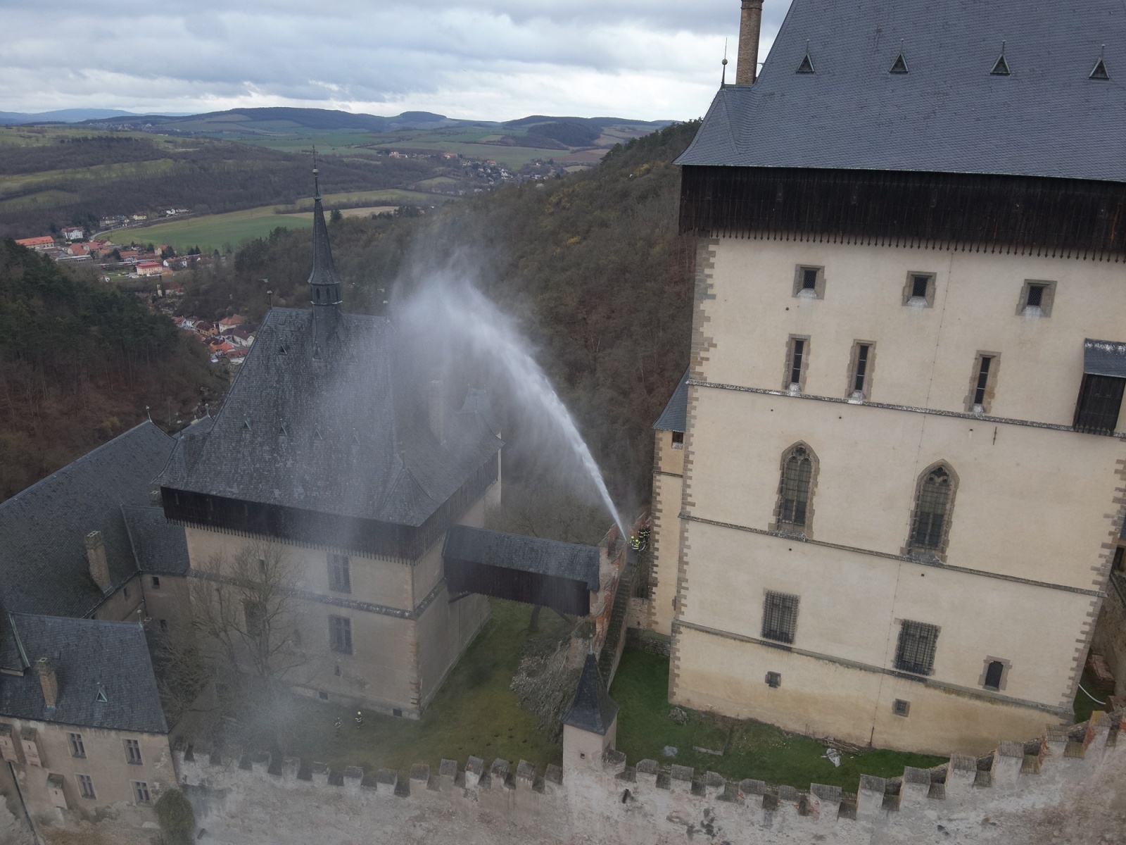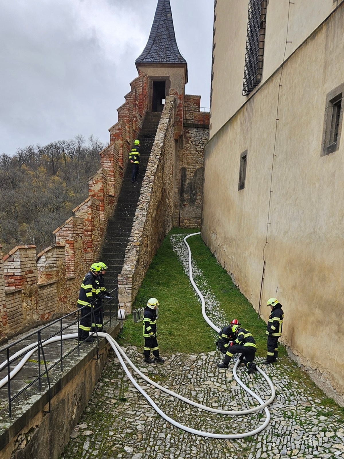 Hasiči z Berouna, Řevnic, Karlštejna a speciální dronová jednotka z Mělníka se v pondělí ráno sjeli k první hradní bráně. V plánu bylo nejen prověřit funkčnost systému, ale také nacvičit dva krizové scénáře simulující skutečný požár.