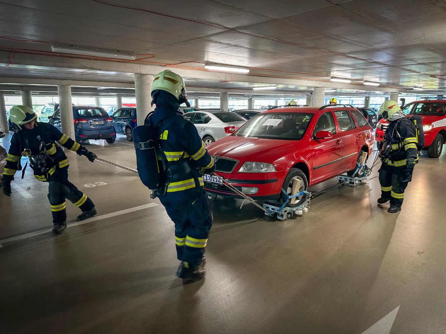 Hasiči trénovali zásah u požáru hybridního vozu v parkovacím domě