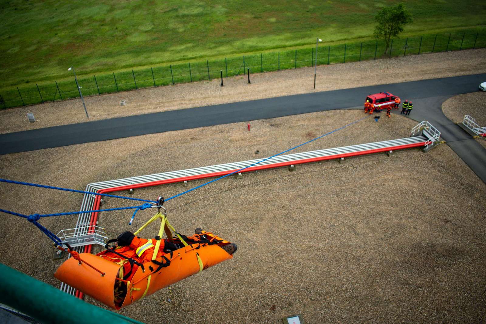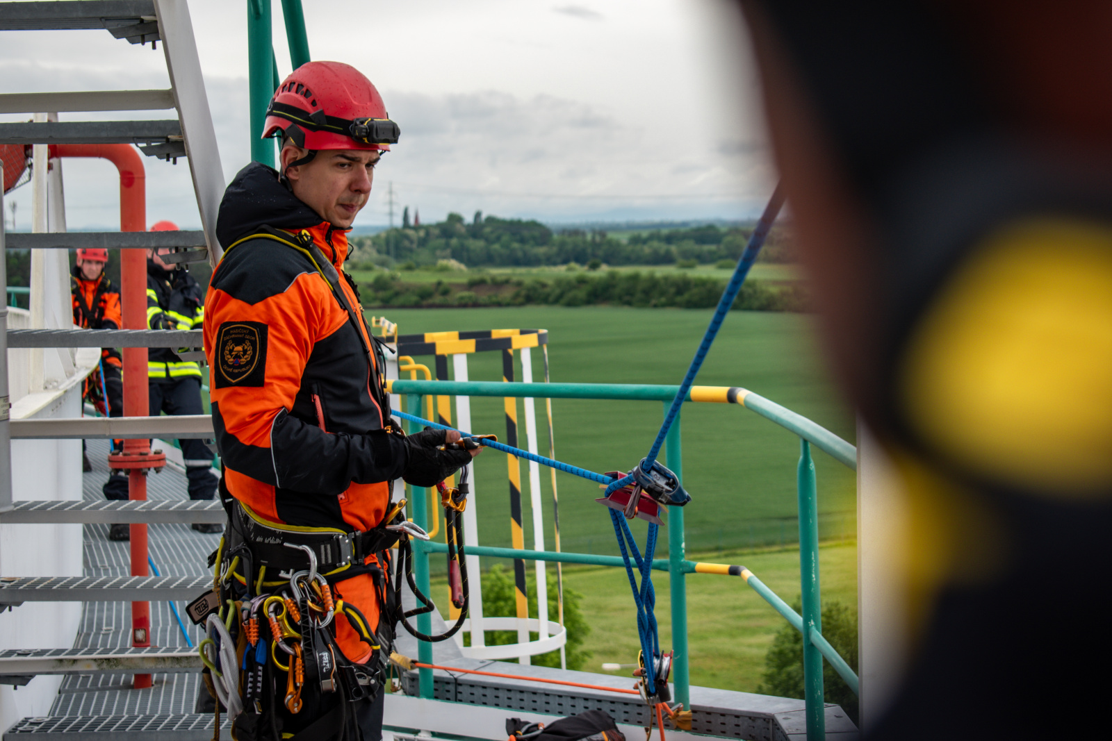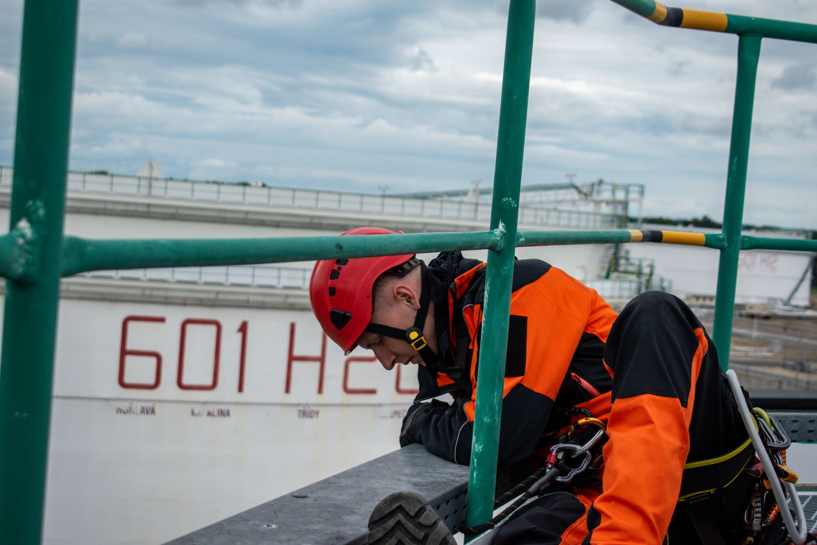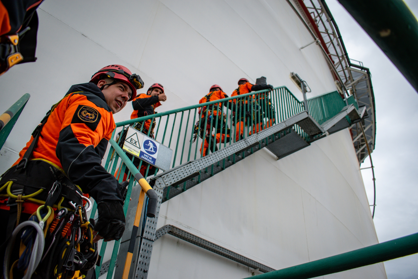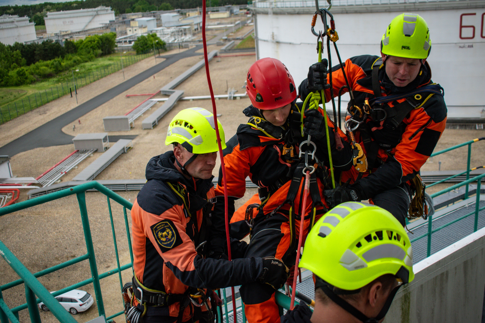 První část výcviku odstartovala ve středu 28. května v netradičním, ale o to náročnějším prostředí – v areálu centrálního tankoviště ropy společnosti MERO ČR, a.s. Lezci zde čelili simulované krizové situaci: v prázdné velkoobjemové nádrži na ropu zůstal zraněný pracovník údržby. Cíl byl jasný – dostat se k němu pomocí lezecké techniky, zhodnotit jeho stav, poskytnout první pomoc a následně jej transportovat do bezpečí.