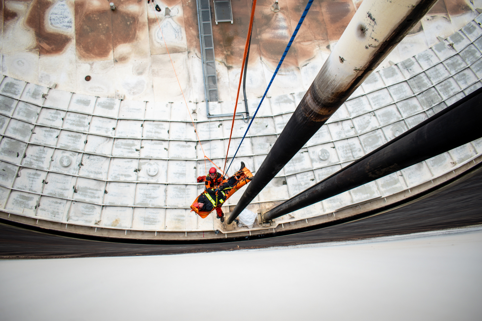 Záchrana probíhala pomocí protiváhy – techniky, která umožňuje plynulé spuštění a vytažení osoby z hloubky. Lezci pak pracovníka stabilizovali v nosítkách, vyzvedli ho na ochoz nádrže a odtud bezpečně spustili mimo prostor nádrže. Nechybělo ani následné vyhodnocení celé akce a analýza možných alternativních metod, jako například použití kladkostroje nebo traverzy.