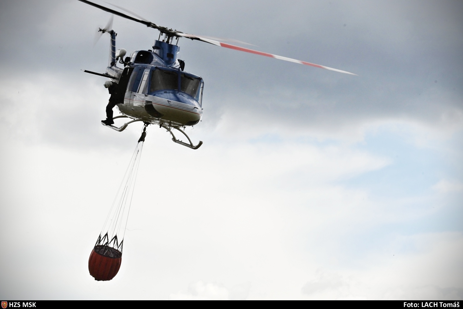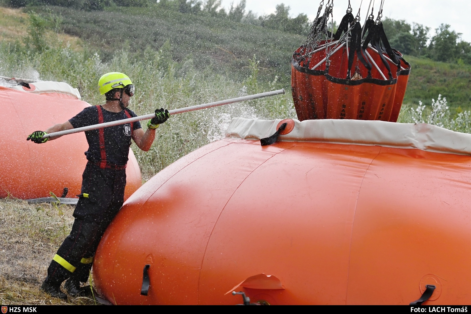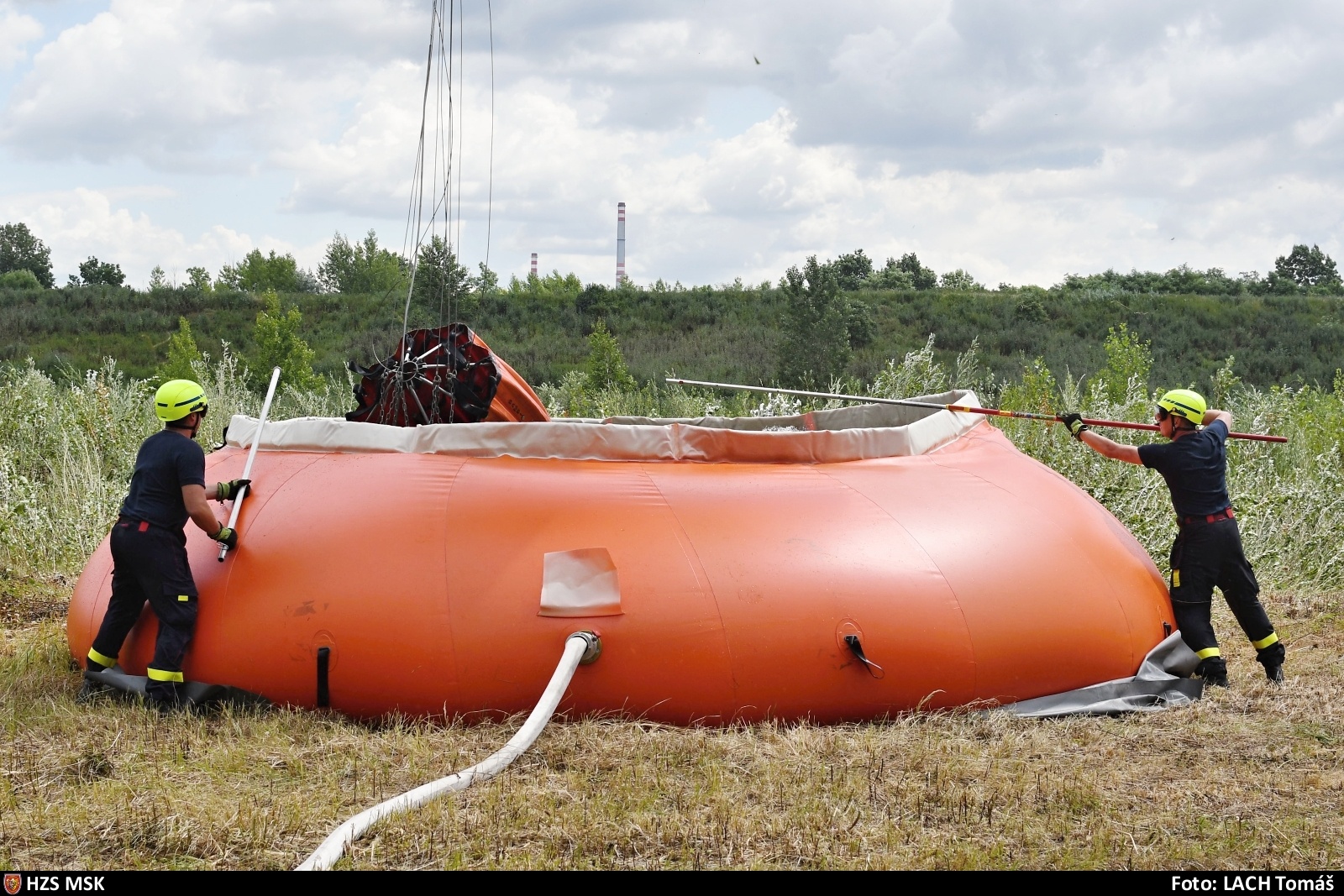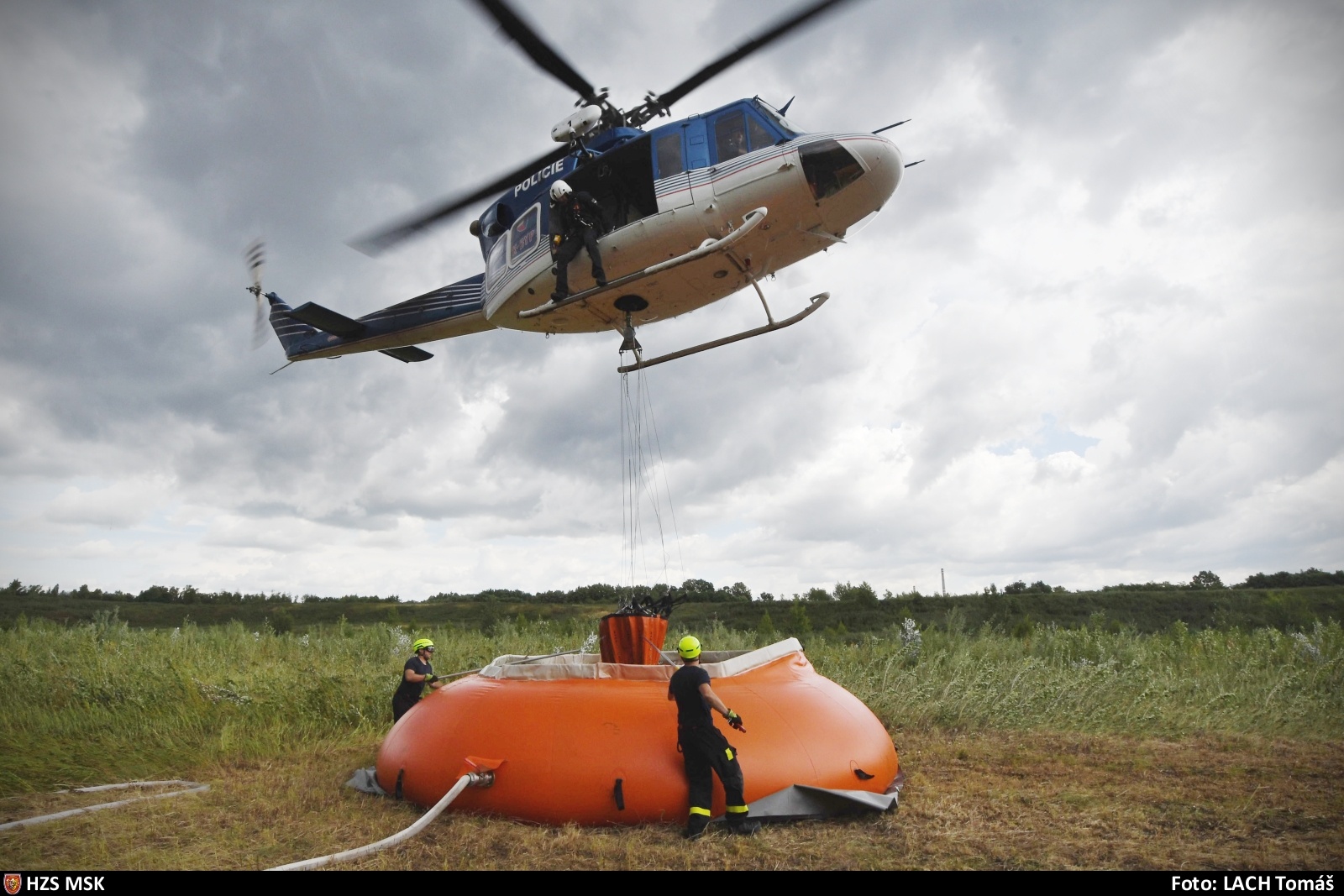 Hasiči v Ostravě nacvičovali plnění bambivaku vrtulníku z velkoobjemových nádrží na vodu