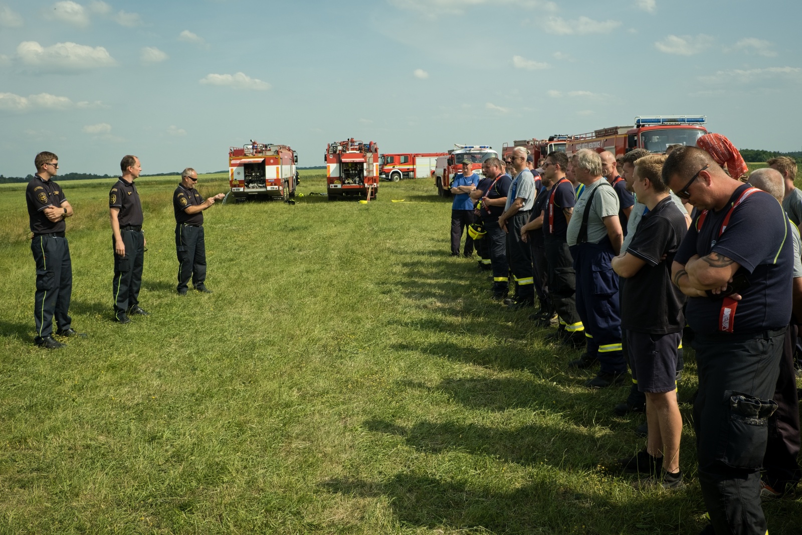 Na úvodním společném nástupu byli účastníci výcviku seznámeni se základními informacemi o letecké hasičské službě i o aktuálním stavu a možnostech nasazování letecké pomoci při hašení požárů. Současně si všichni hasiči mohli pomocí QR kódů stáhnout do svých mobilních telefonů veškerou dostupnou dokumentaci. Velitel stanice Mělník následně provedl se všemi zúčastněnými podrobný bezpečnostní pohovor, který vycházel z konspektu požární taktiky 1-3-03 „Využití letecké techniky k leteckému hašení požárů lesních a travnatých porostů“. Na závěr teoretické části byli hasiči rozděleni do 15 družstev po pěti hasičích.