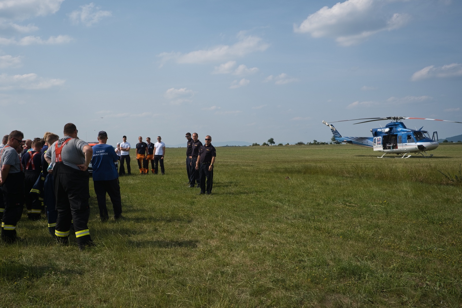 Pak už všichni očekávali přiblížení helikoptéry Letecké služby Policie ČR, která přelétla nad vzletovou a přistávací dráhou letiště. Po přistání proběhl pohovor kapitána vrtulníku s koordinátorem letového provozu na letišti. Poté byl do podvěsu stroje instalován závěsný vak a letečtí záchranáři HZS Středočeského kraje, kteří přiletěli na palubě vrtulníku, upřesnili poslední detaily.