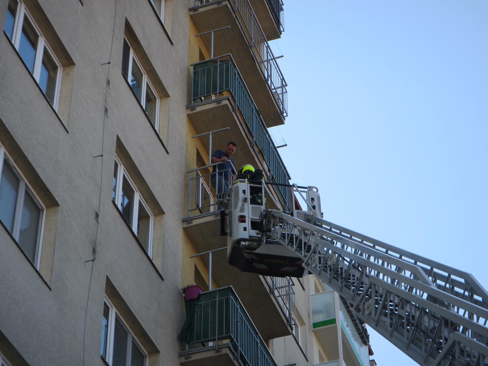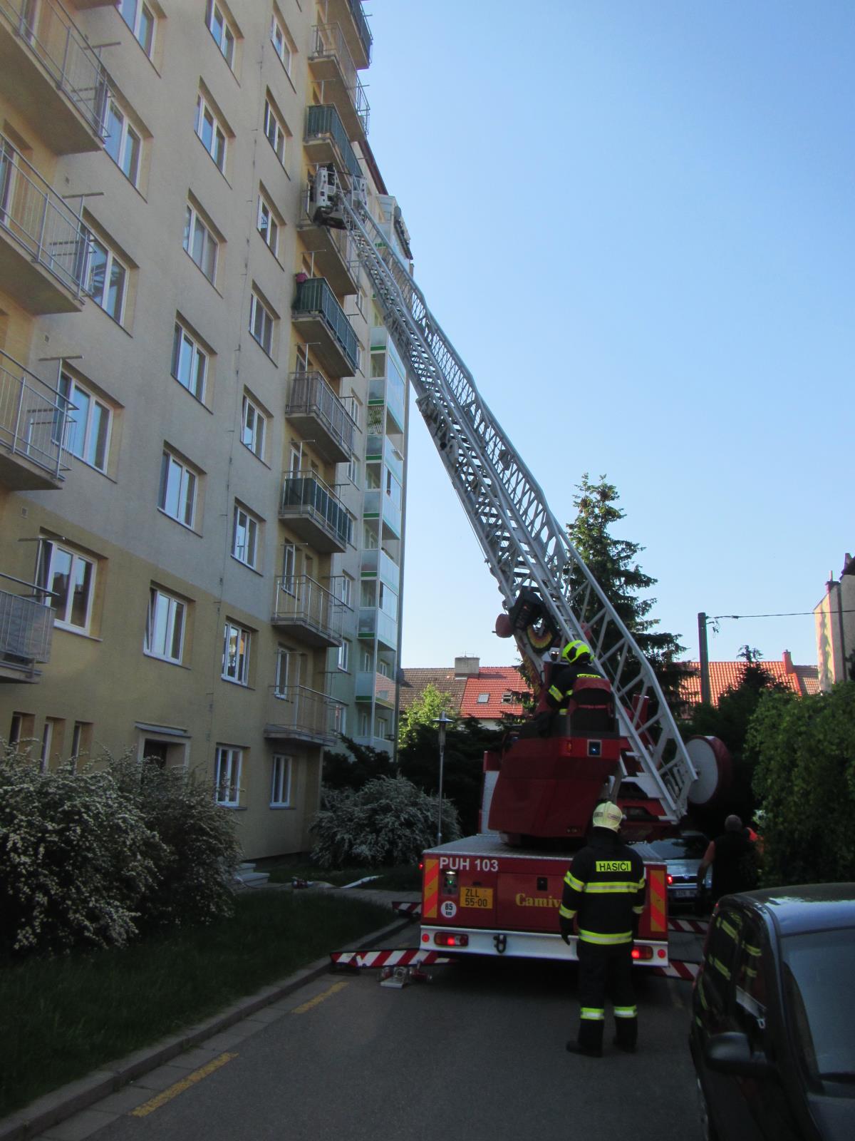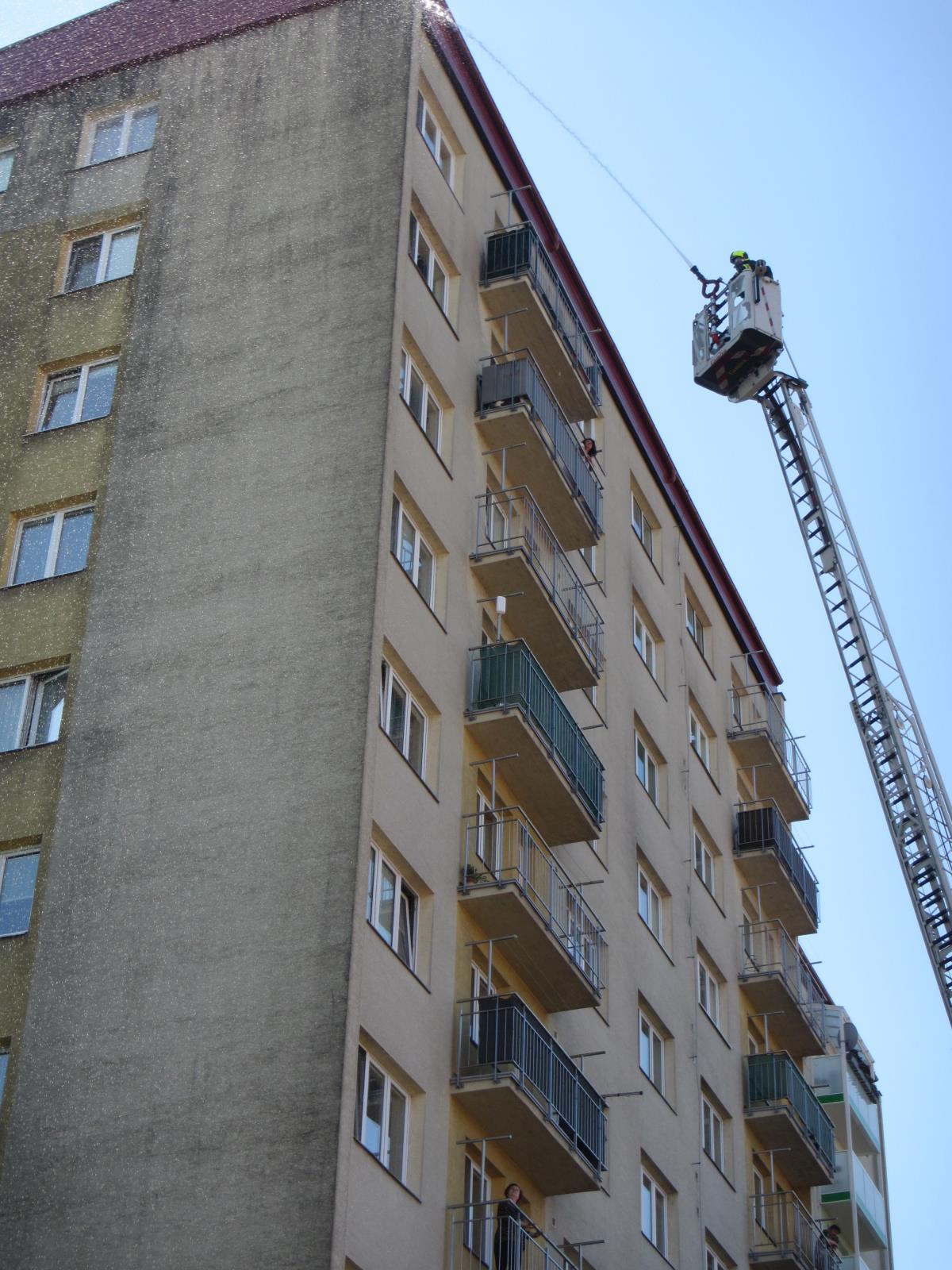 Při opravě střechy na bytovém domě došlo k požáru střešního pláště. Kouř ze střechy se následně dostal na vnitřní schodiště. Všichni obyvatelé stihli včas vyběhnout ven do bezpečí, až na jednoho muže. Ten se ve svém bytě v 7. patře zamkl, zabarikádoval dveře a o pomoc volal z balkónu. Toto byl námět dnešního cvičení.