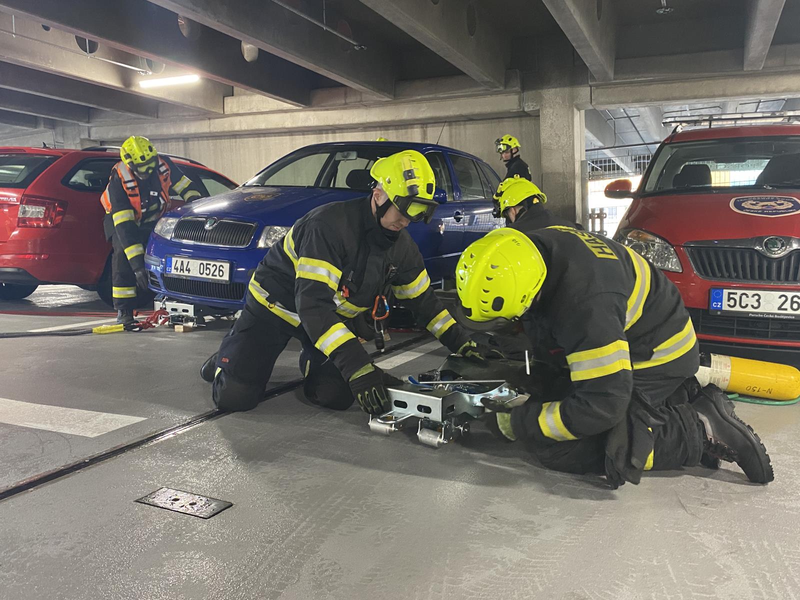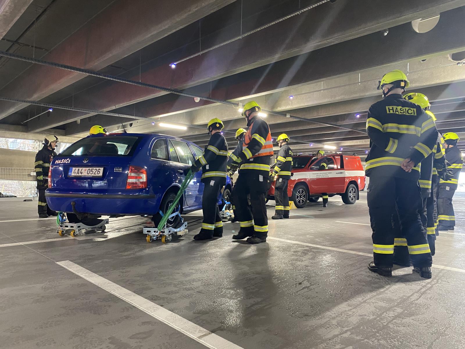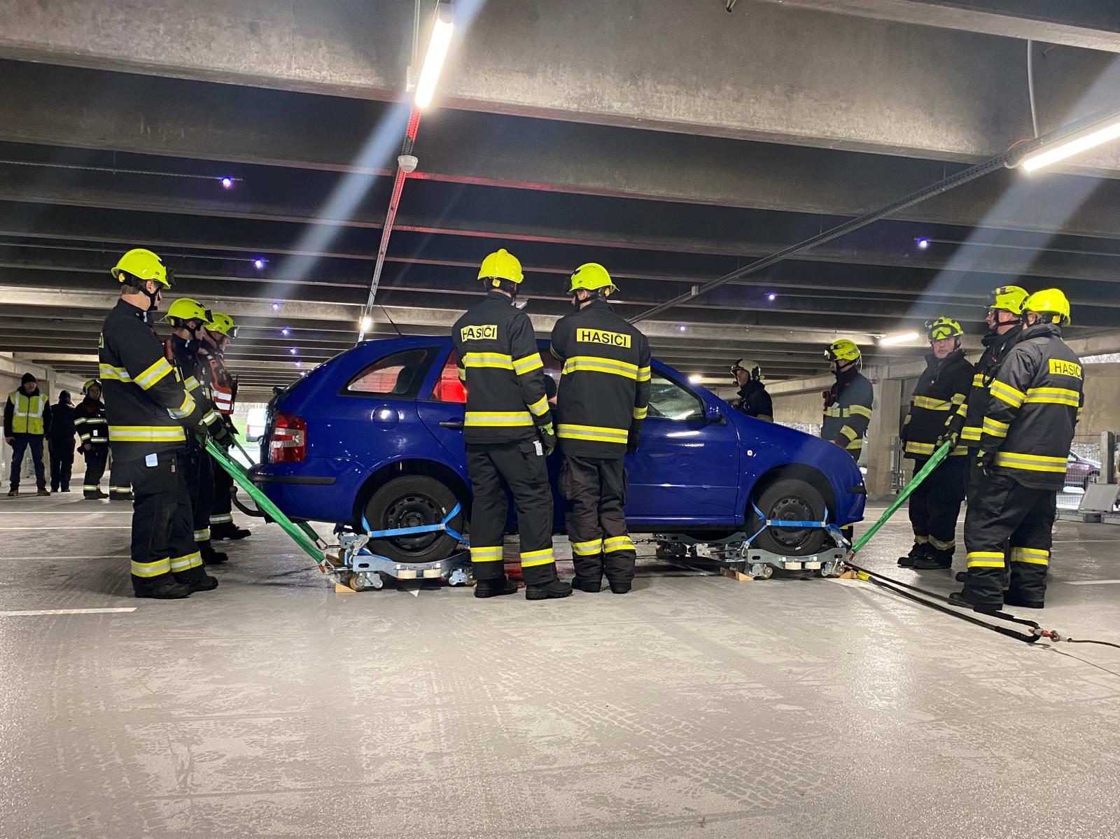 Vyzkoušeli jsme si věcné prostředky a vybavení, které u požáru v podobných objektech používáme. Jedná se především o tzv. vozíčky, jež instalujeme pod kola nepojízdného auta. Dále pak využijeme znalosti lanové techniky a navijáky na zásahových vozidlech, pomocí kterých spouštíme auto z garáží ven. Velkou pomocí při zajištění a následném spouštění nepojízdného vozu jsou kotevní body, na které bylo myšleno již v při projektování a stavbě nového parkovacího domu. Umožňují nám bezpečné korigování pohybu auta na vozíčkách.