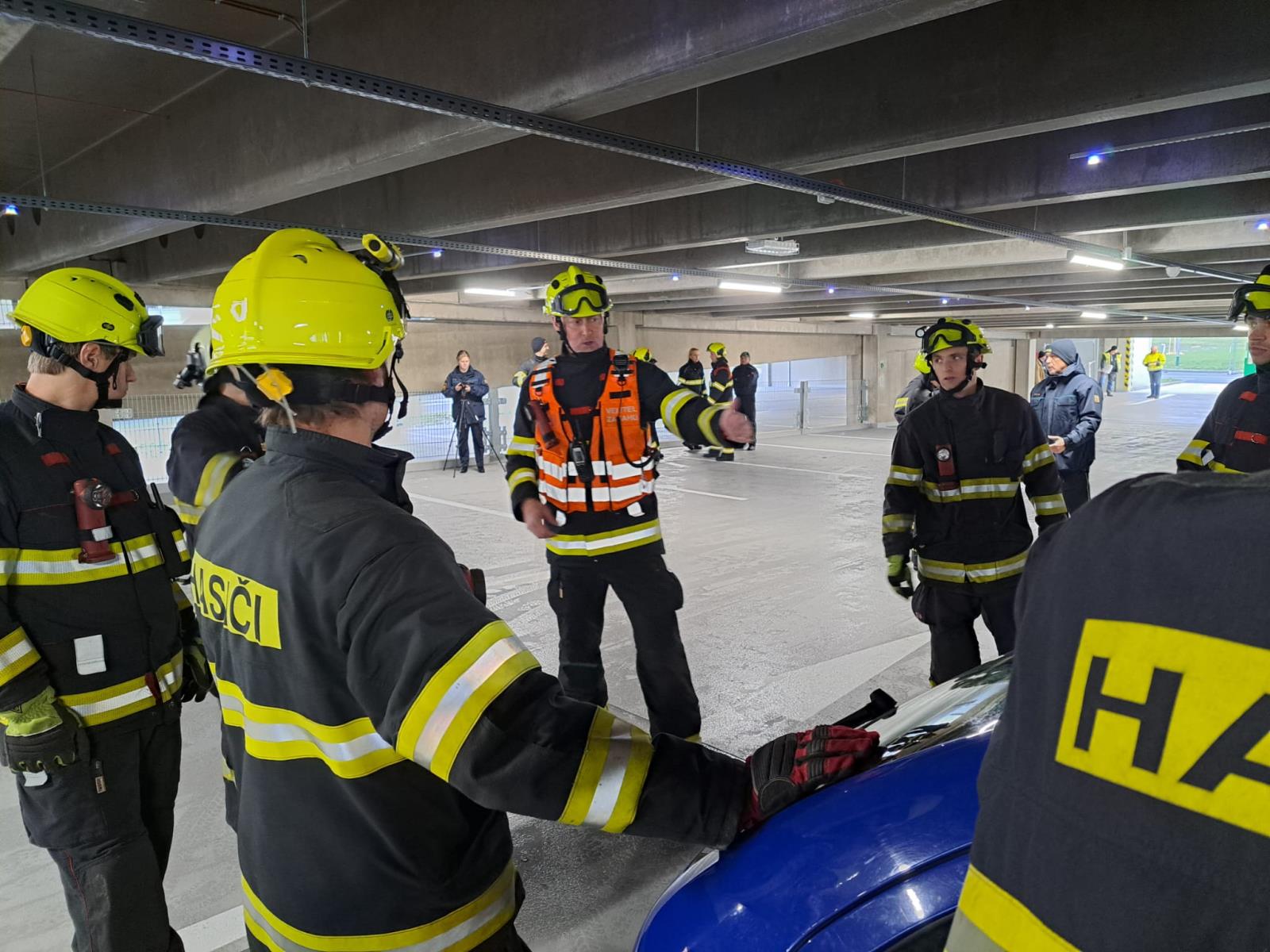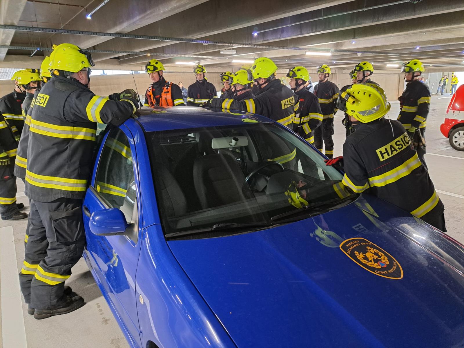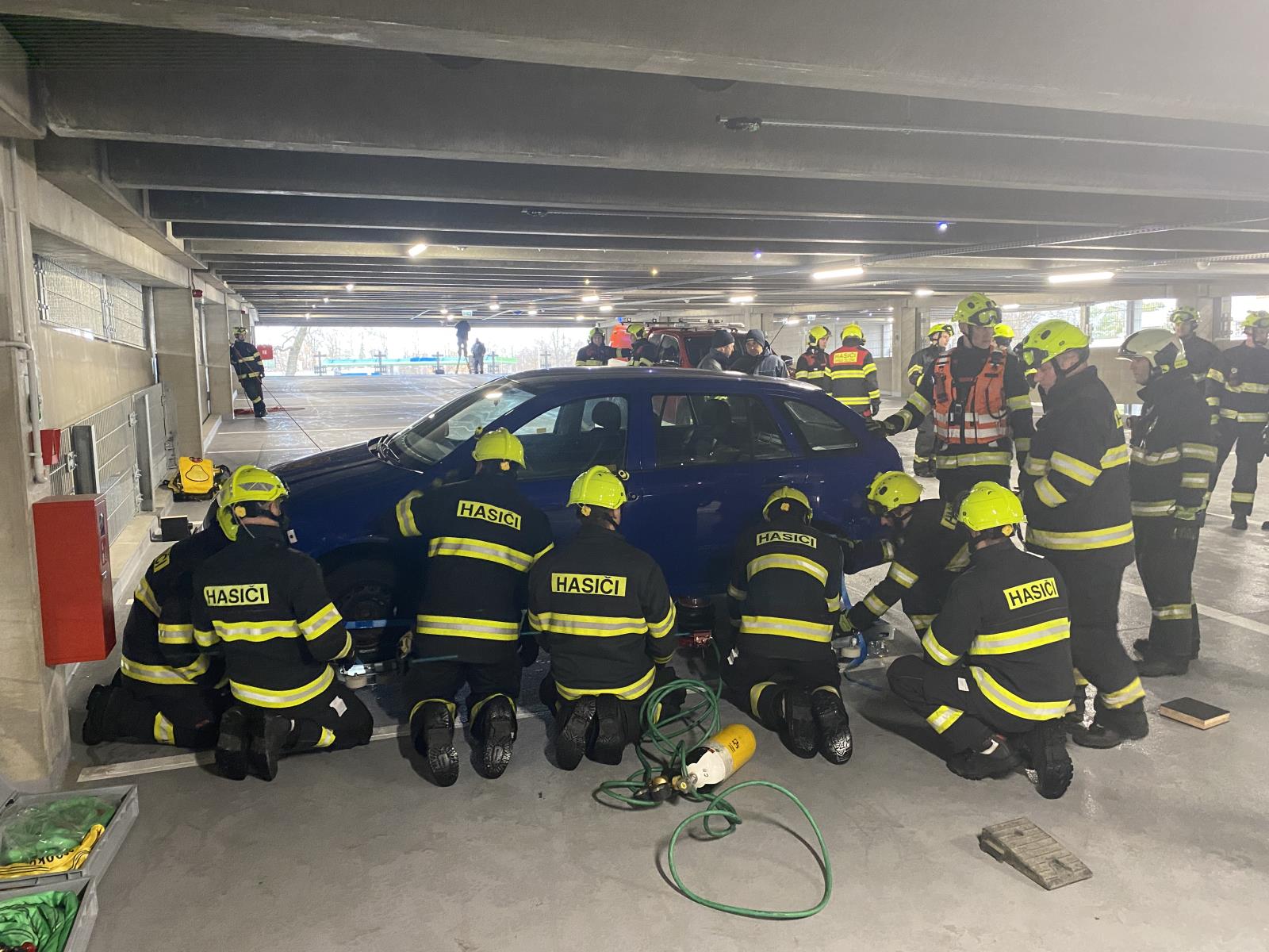 Vyzkoušeli jsme si věcné prostředky a vybavení, které u požáru v podobných objektech používáme. Jedná se především o tzv. vozíčky, jež instalujeme pod kola nepojízdného auta. Dále pak využijeme znalosti lanové techniky a navijáky na zásahových vozidlech, pomocí kterých spouštíme auto z garáží ven. Velkou pomocí při zajištění a následném spouštění nepojízdného vozu jsou kotevní body, na které bylo myšleno již v při projektování a stavbě nového parkovacího domu. Umožňují nám bezpečné korigování pohybu auta na vozíčkách.