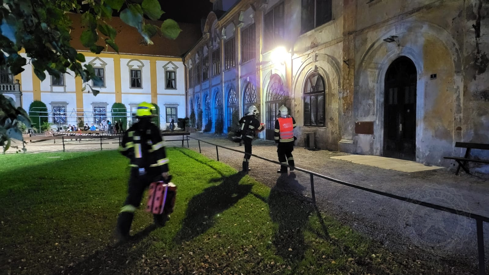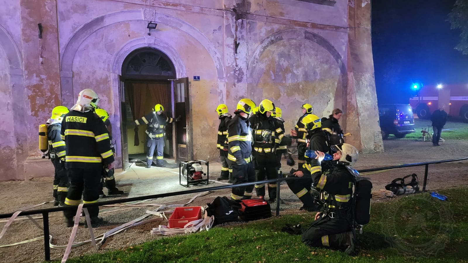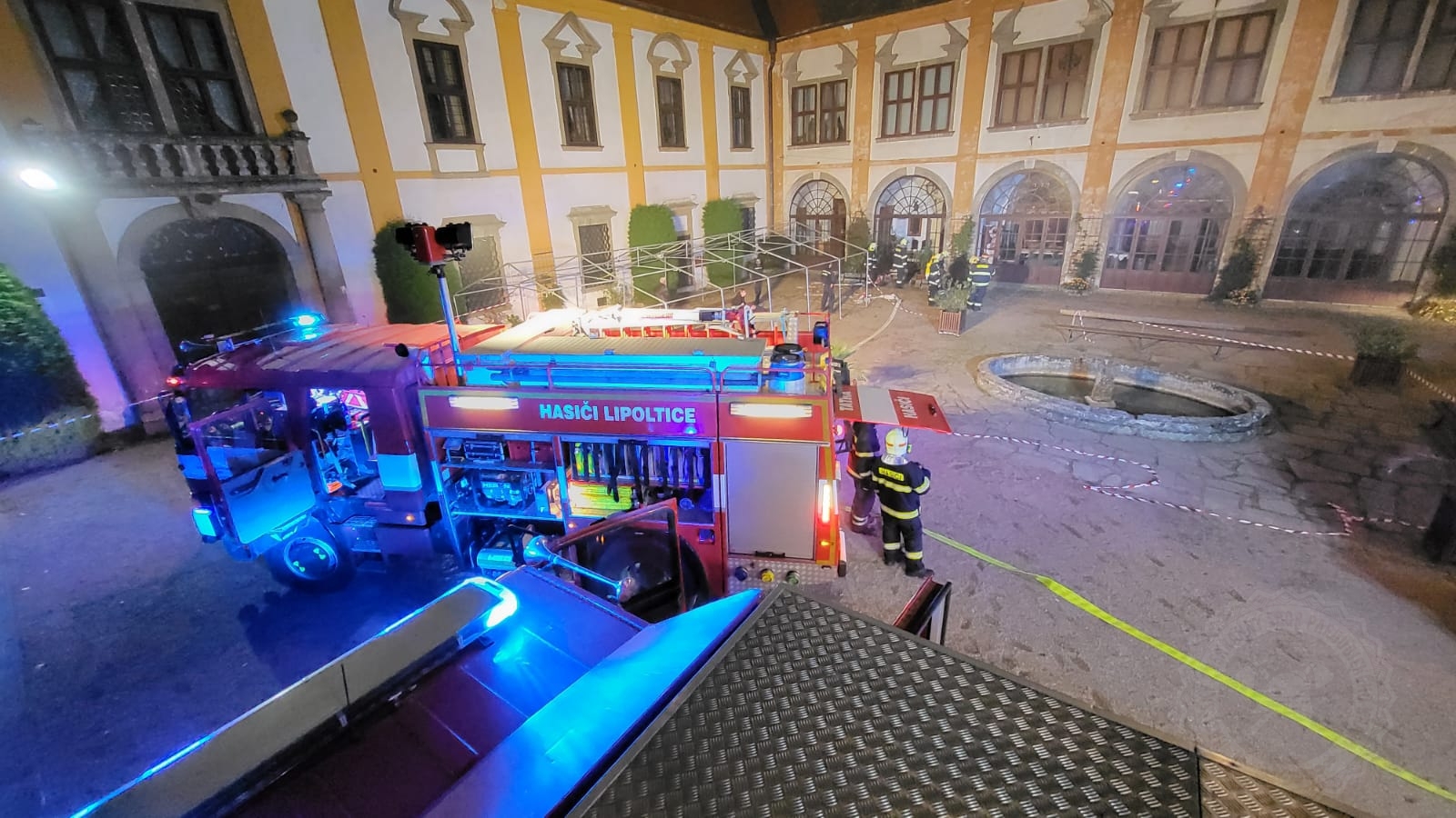 Hasiči tedy po samotném příjezdu provedli průzkum sálu, jehož kapacita je 265 osob, a nalezli zde celkem 5 osob. Některé byly evakuovány ještě před příjezdem jednotek na místo, další osoby museli hasiči co nejdříve evakuovat a dostat mimo nebezpečně zadýmený prostor. Další hasiči prováděli likvidaci požáru a ochlazování střechy tak, aby nedošlo k rozšíření požáru na střechu zámku. Nasazena byla také přetlaková ventilace k odvětrání zakouřených prostor.