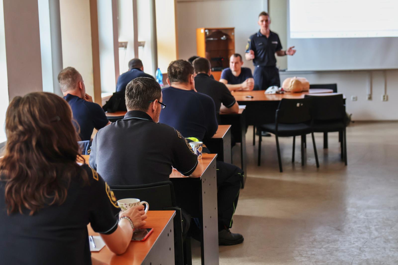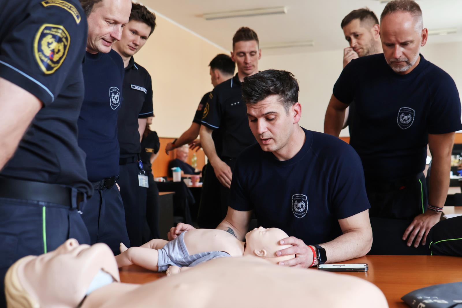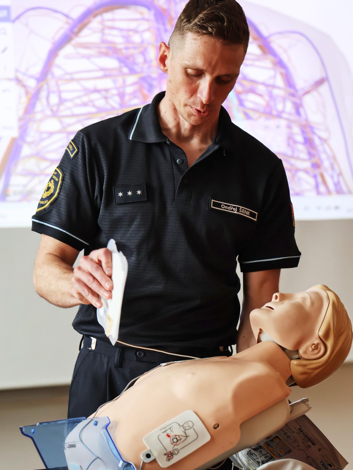 Školení zahájila teoretická část, kde instruktoři zdravotníci kolegům připomněli nejdůležitější zásady první pomoci. Každý z účastníků si zopakoval, jak rozpoznat život ohrožující stav, jak správně postupovat při zástavě srdce, jak zastavit masivní krvácení nebo jak se zachovat u člověka s podezřením na cévní mozkovou příhodu.