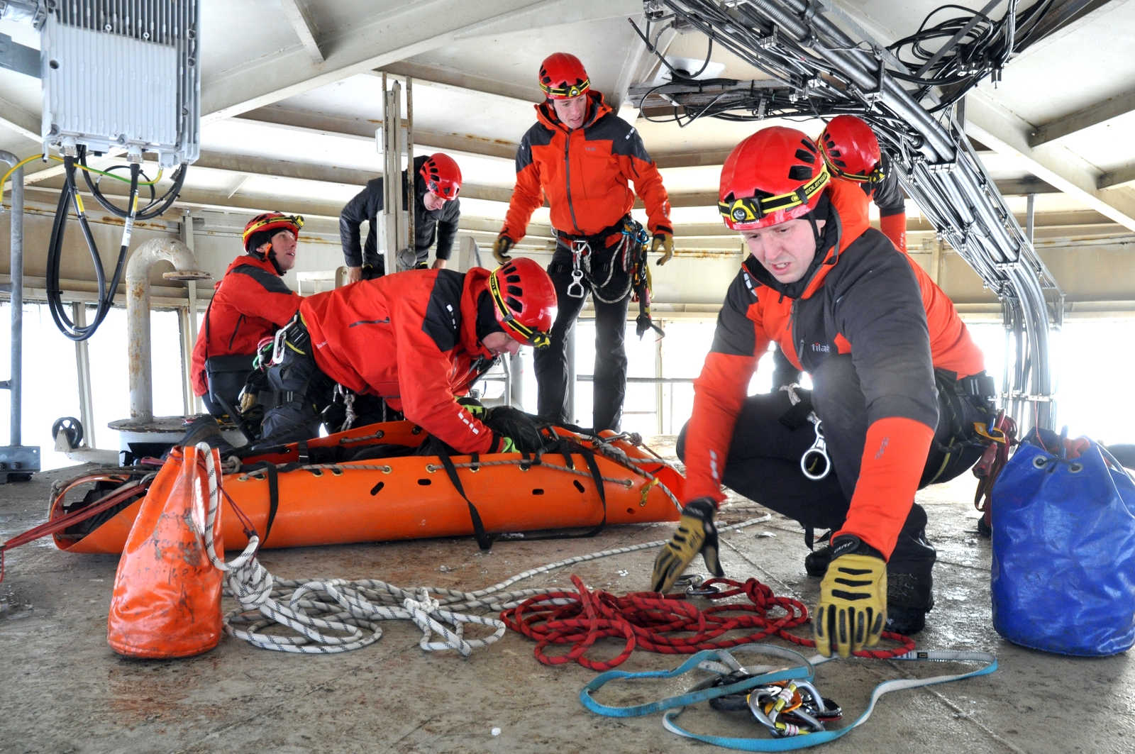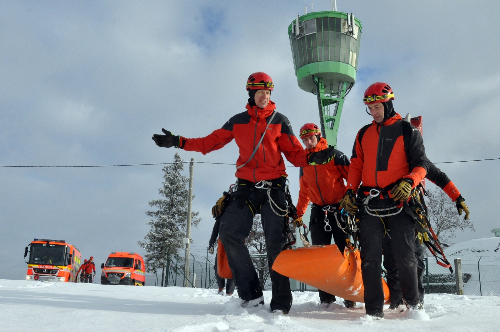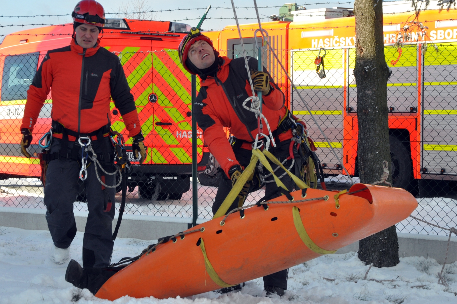 Mezi cvičené úkoly patřilo i vytahování osob protiváhou, spouštění s doprovodem lezce i samostatně a rovněž transport osob po zemi na delší vzdálenosti. Hasiči si vyzkoušeli zraněného připravit i na transport policejním vrtulníkem.