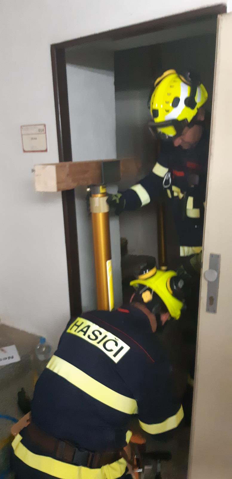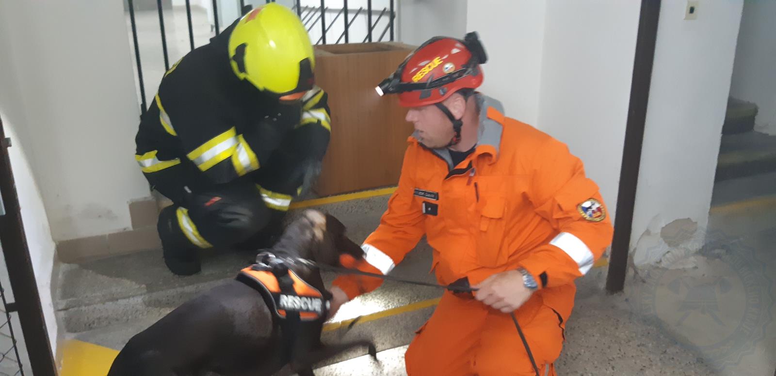 Průzkumem je zjištěn nestabilní strop a nemožnost dalšího průzkumu. VZ na místo povolává kontejner k zajištění stability stropu. Jistící skupina provádí zajištění nestabilní konstrukce budovy. Velitel zásahu určuje další vyhledávací skupinu na dokončení průzkumu zajištěné budovy. Zřízen je štáb velitele zásahu a povolán je velitelsko-spojový vůz. Postupně jsou vyproštěny všechny zraněné osoby, třídění osob je prováděno metodou START*) ve spolupráci se zdravotnickou záchrannou službou. Pomáháme s ošetřením i transportem zraněných do nemocnice (fiktivní). Současně je na místo povolána skupina pro statické zajištění poškozené budovy z Pardubic. Závěrečný průzkum provedl pes se speciálním výcvikem na vyhledávání osob ze sutin.