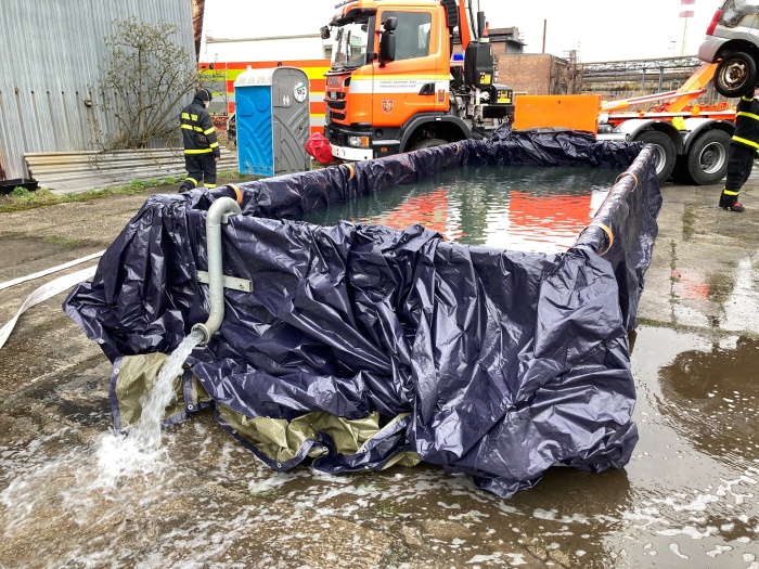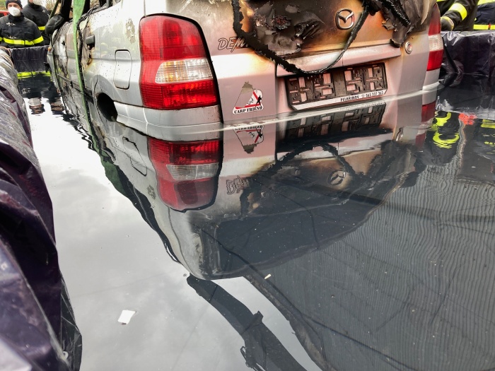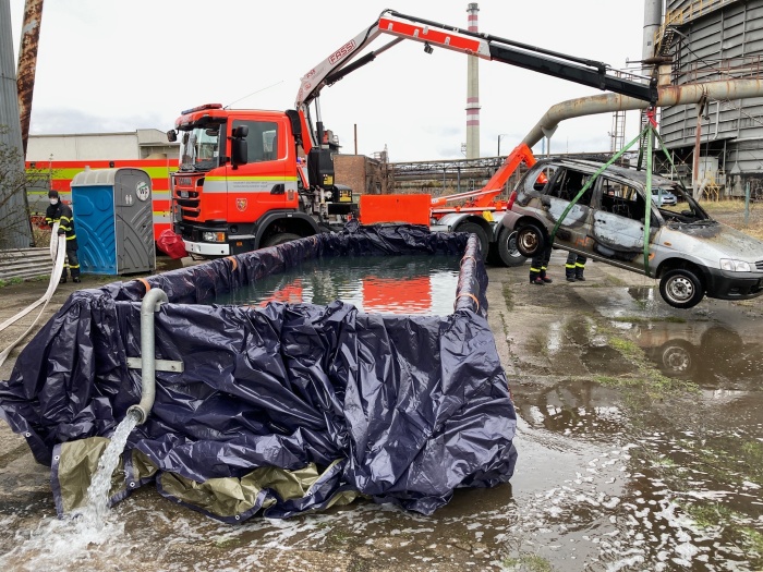 I to si hasiči vyzkoušeli – využili k tomu kontejnerový nosič a plechový kontejner, který vyložili fólií a zaplnili vodou z velkoobjemové cisterny. Poté do takto připravené lázně hydraulickým nakládacím jeřábem automobil položili – voda takto může průběžně chladit palivové články v podlaze elektromobilů.