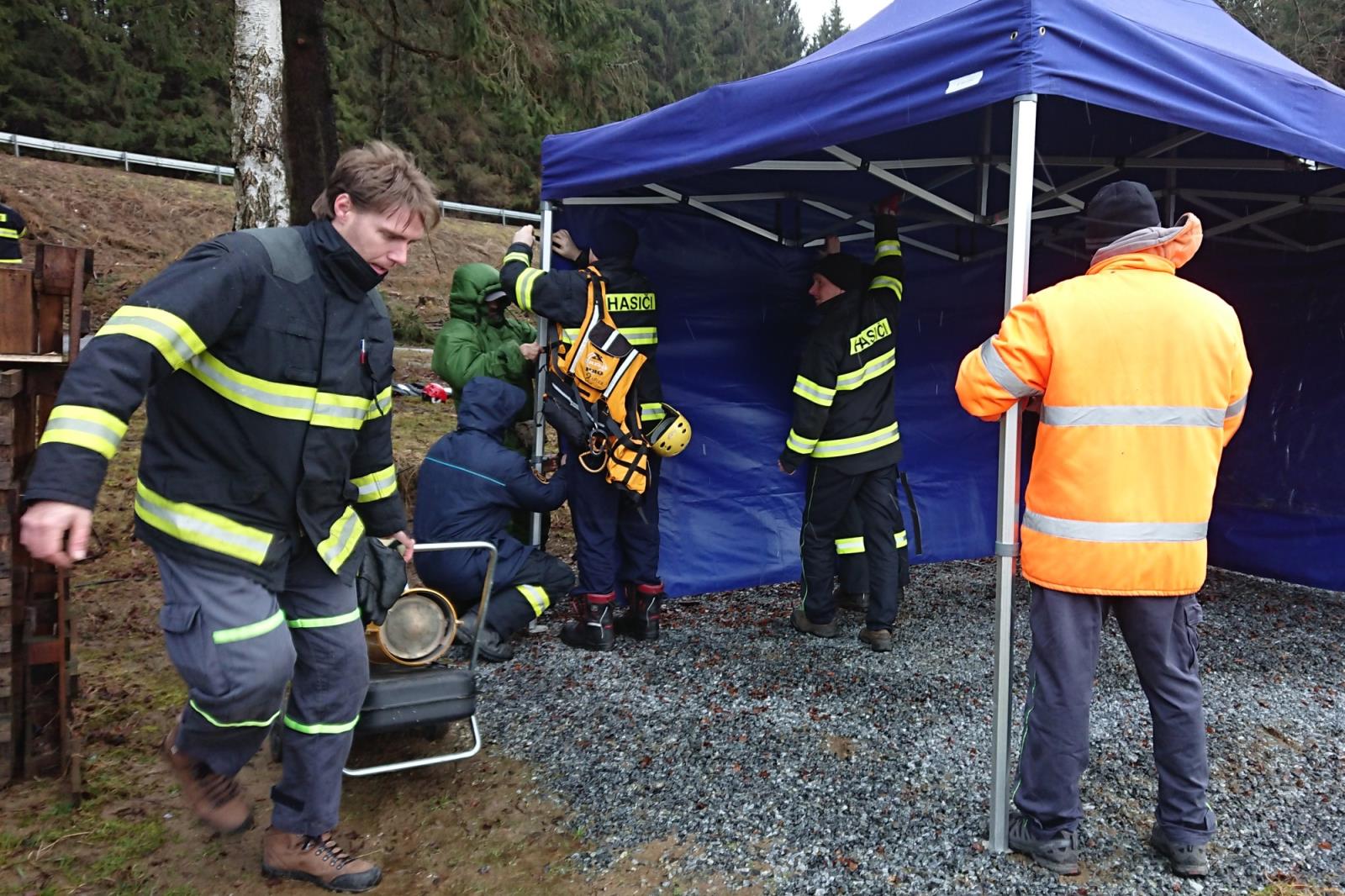 Součástí výcviku bylo také vytvoření potřebného zázemí pro práci v nepříznivých povětrnostních podmínkách. jako jsou vítr, déšť, sněžení či mráz. Hasiči postavili stan a zprovoznili vyhřívání pro převlékání na místě výcviku.