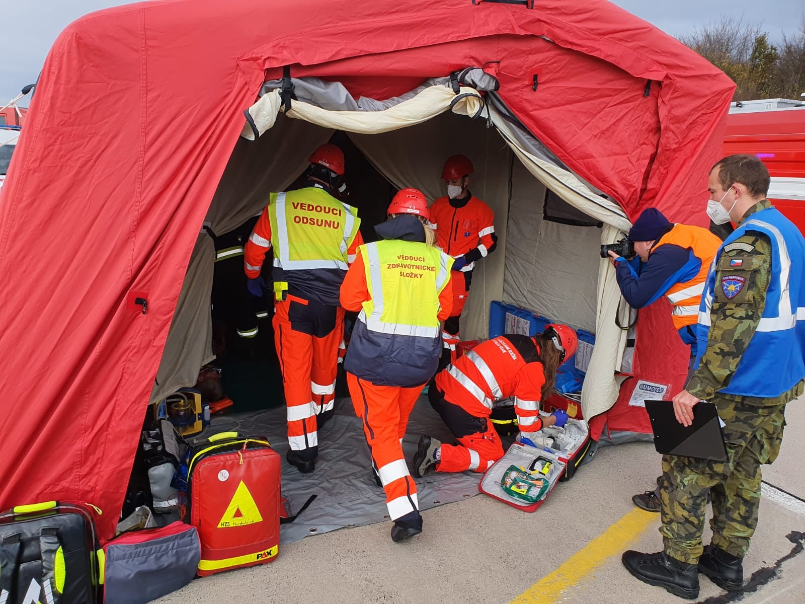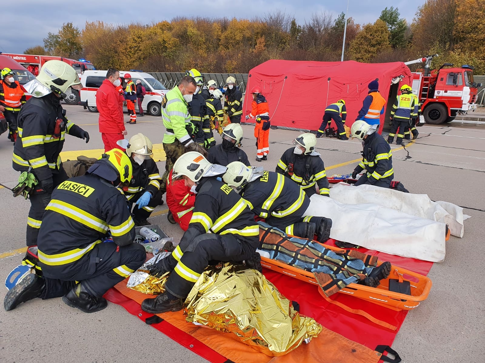 *) Při cvičení byla využívána metoda třídění obětí START (S – snadná, T – terapie, A – a, R – rychlé, T – třídění), která se používá pro třídění osob postižených mimořádnou událostí v případě většího počtu obětí (zpravidla nad 10 obětí), kdy je nedostatek zdravotnického personálu vzhledem k počtu obětí. Cílem je vždy stanovit prioritu transportu obětí na stanoviště třídění raněných v prostoru pro poskytnutí zdravotní péče, kde je jim poskytována odborná zdravotnická péče zpravidla záchranáři zdravotnické záchranné služby.