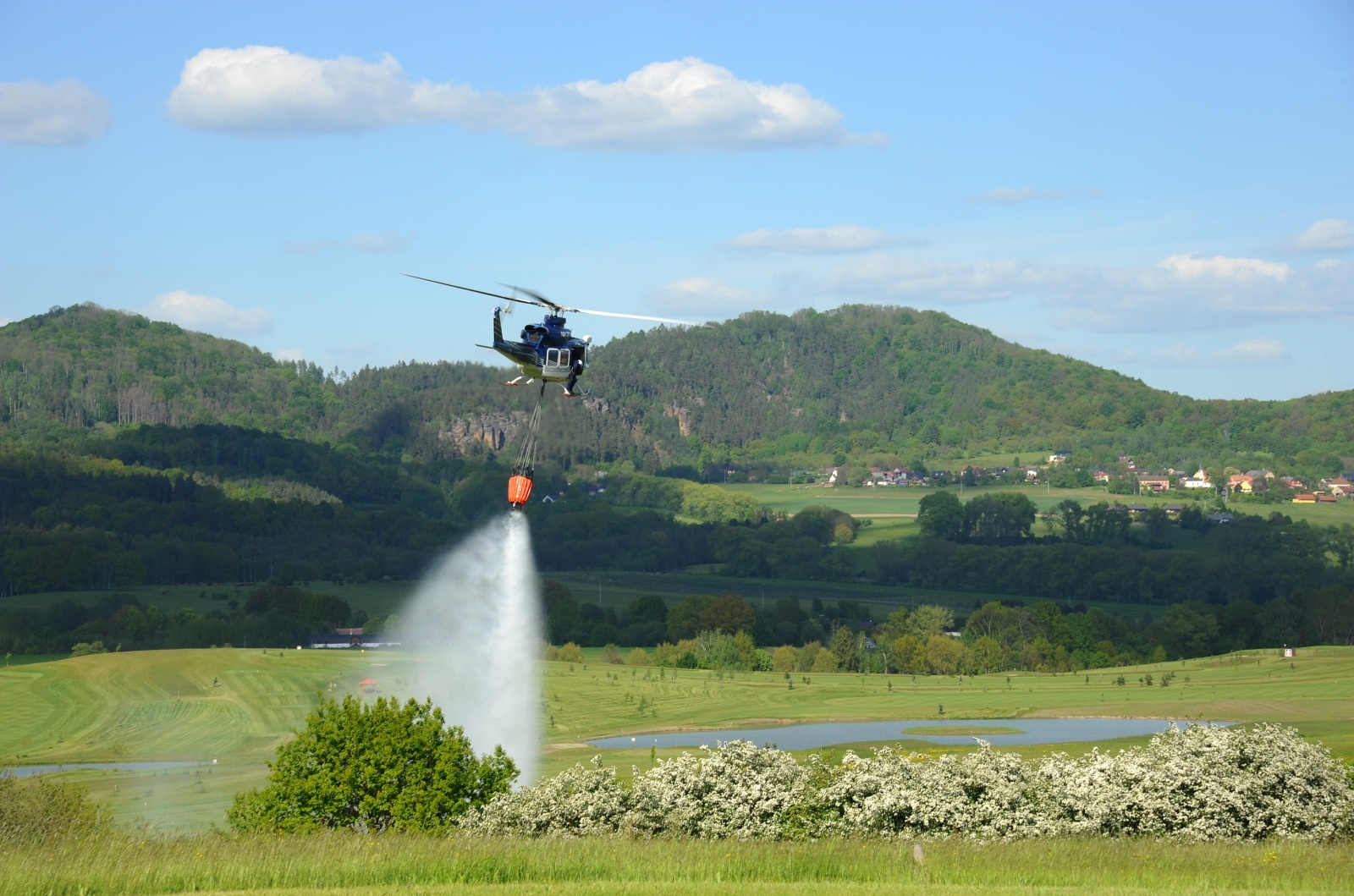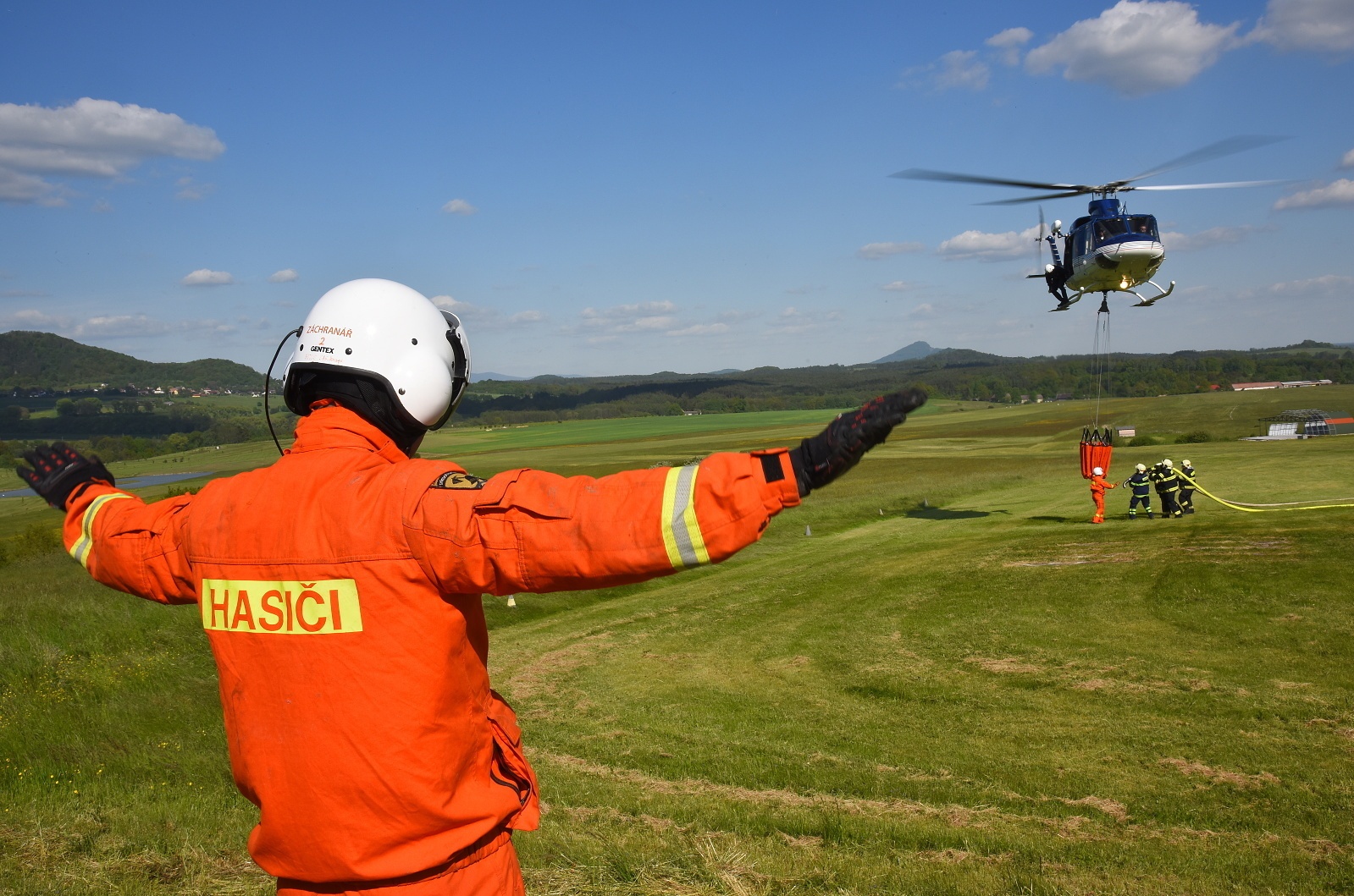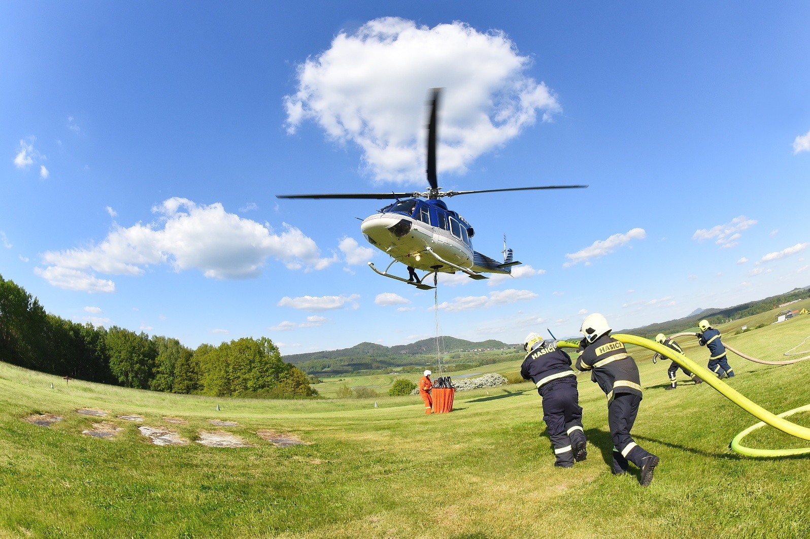 Osmnáct jednotek požární ochrany předurčených k plnění závěsného vaku pod vrtulníkem spolu s Leteckou službou Policie České republiky cvičilo na Letišti Lada v České Lípě.