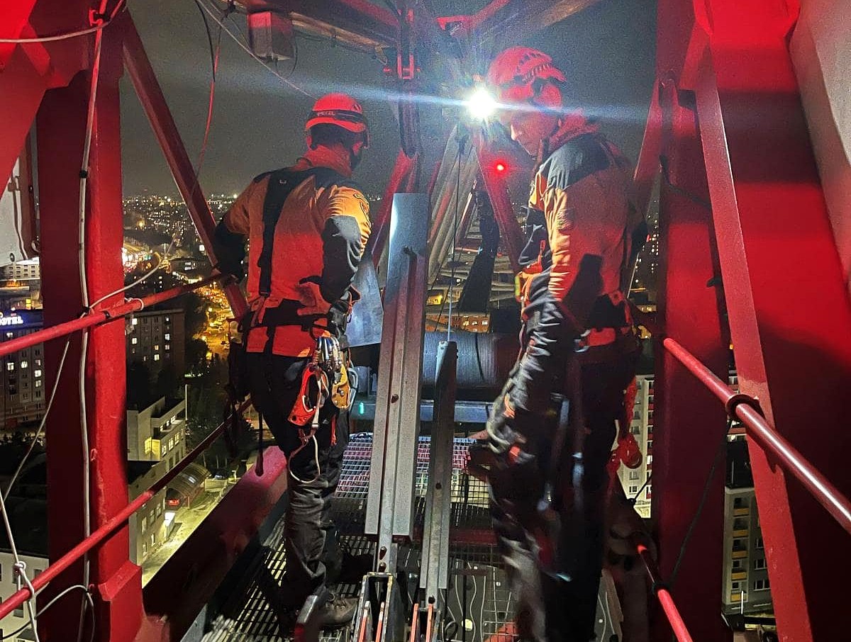 Hasiči lezci v Olomouci absolvovali extrémně náročný výcvik na pětapadesátimetrovém jeřábu v areálu fakultní nemocnice. Cvičili dva realistické scénáře: záchranu zkolabovaného jeřábníka z kabiny a přístup k muži, který vylezl na příhradovou konstrukci a hrozil skokem. Oba zásahy vyžadovaly precizní lanové techniky i zvládnutí situace v nepříznivých podmínkách.