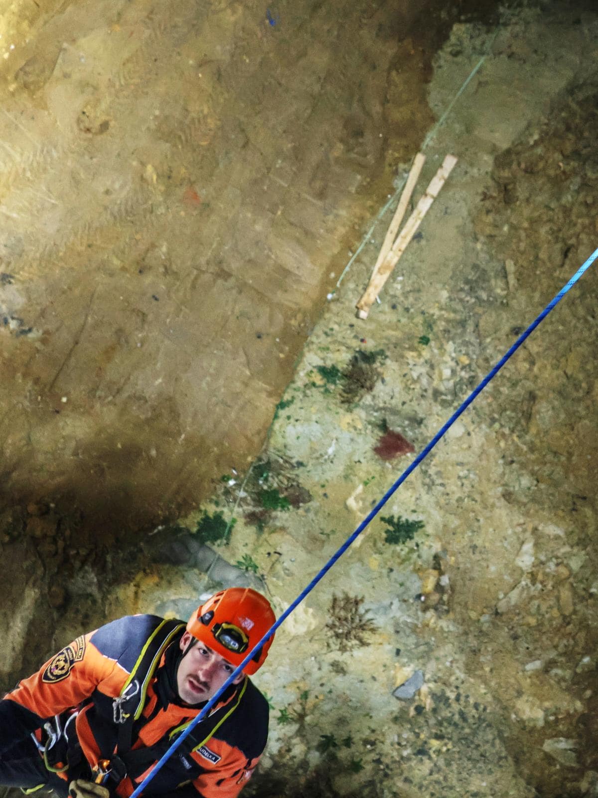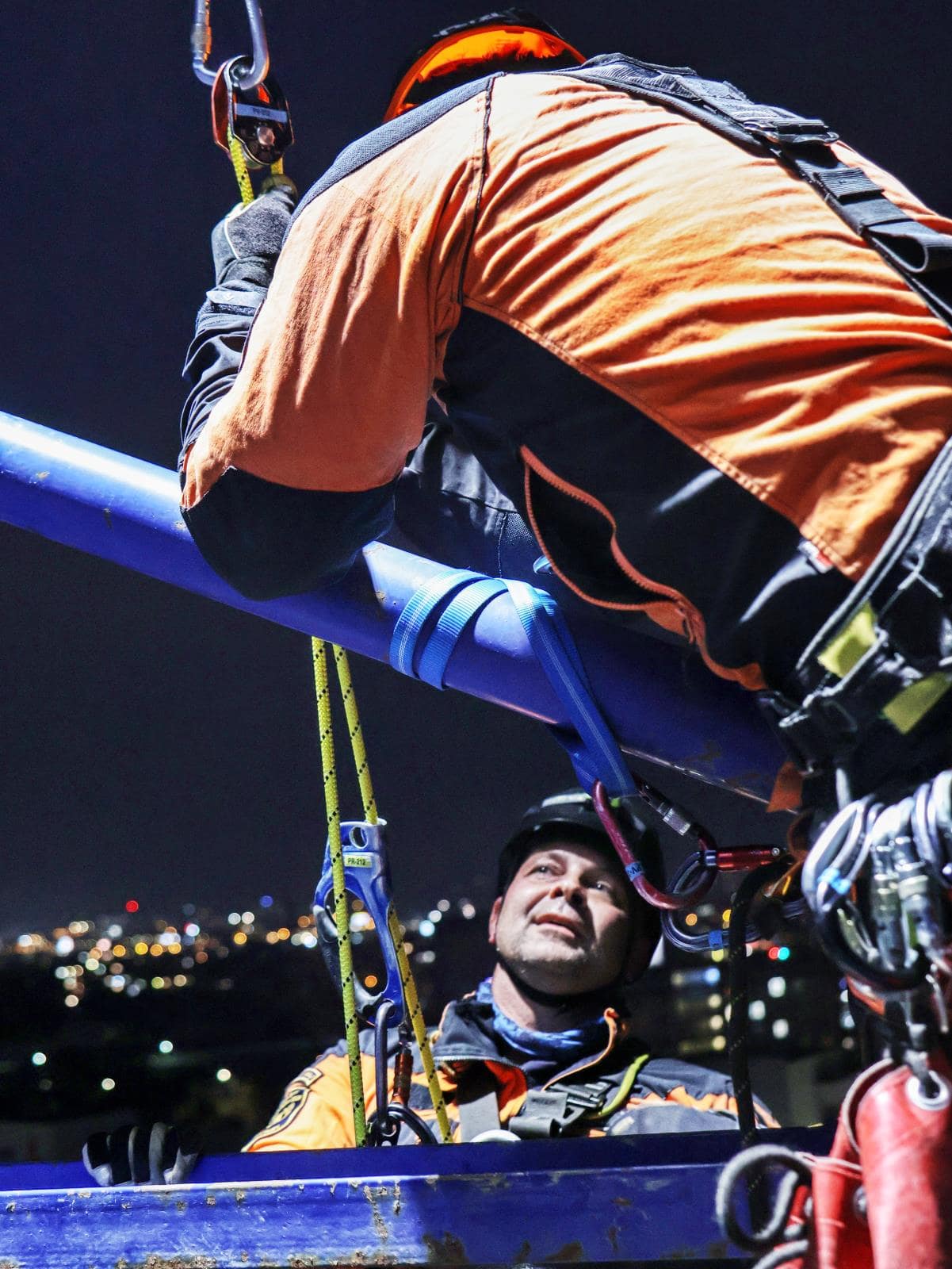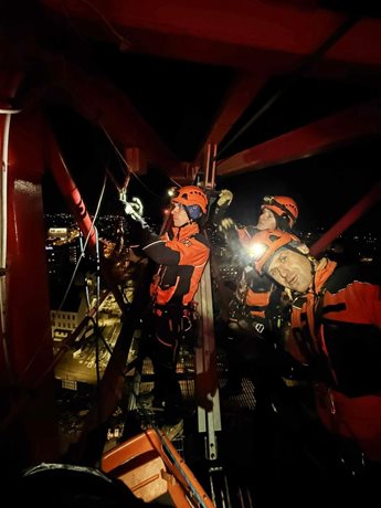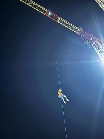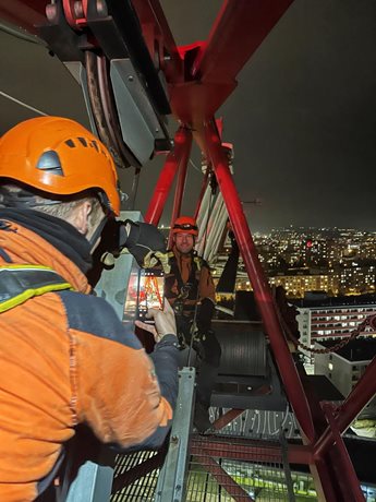 Druhý scénář byl psychicky náročnější. Muž vylezl na příhradovou konstrukci a dostal se až na rameno jeřábu. Podle scénáře nechtěl slézt zpět a zásah vyžadoval nejen technickou přípravu, ale také komunikaci, která by jej přesvědčila ke spolupráci. Hasiči připravili bezpečné zajištění a následně s ním provedli tandemové slanění.