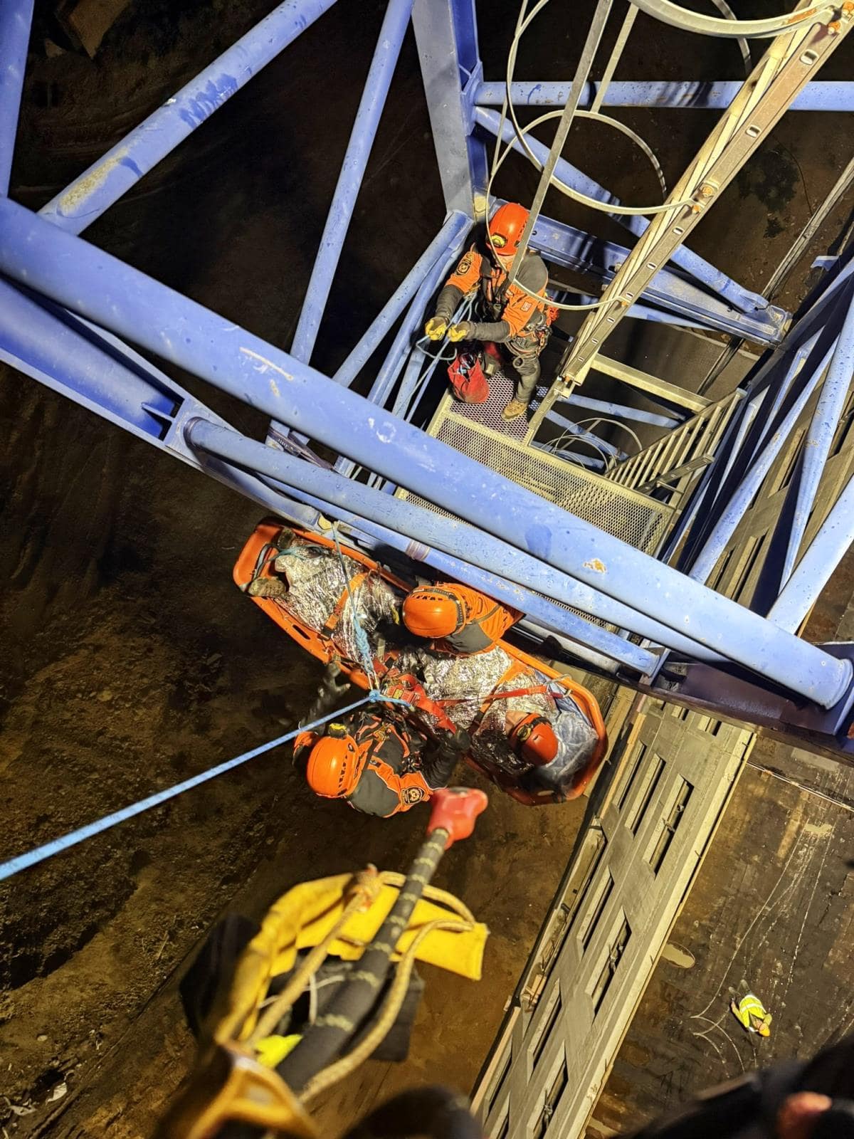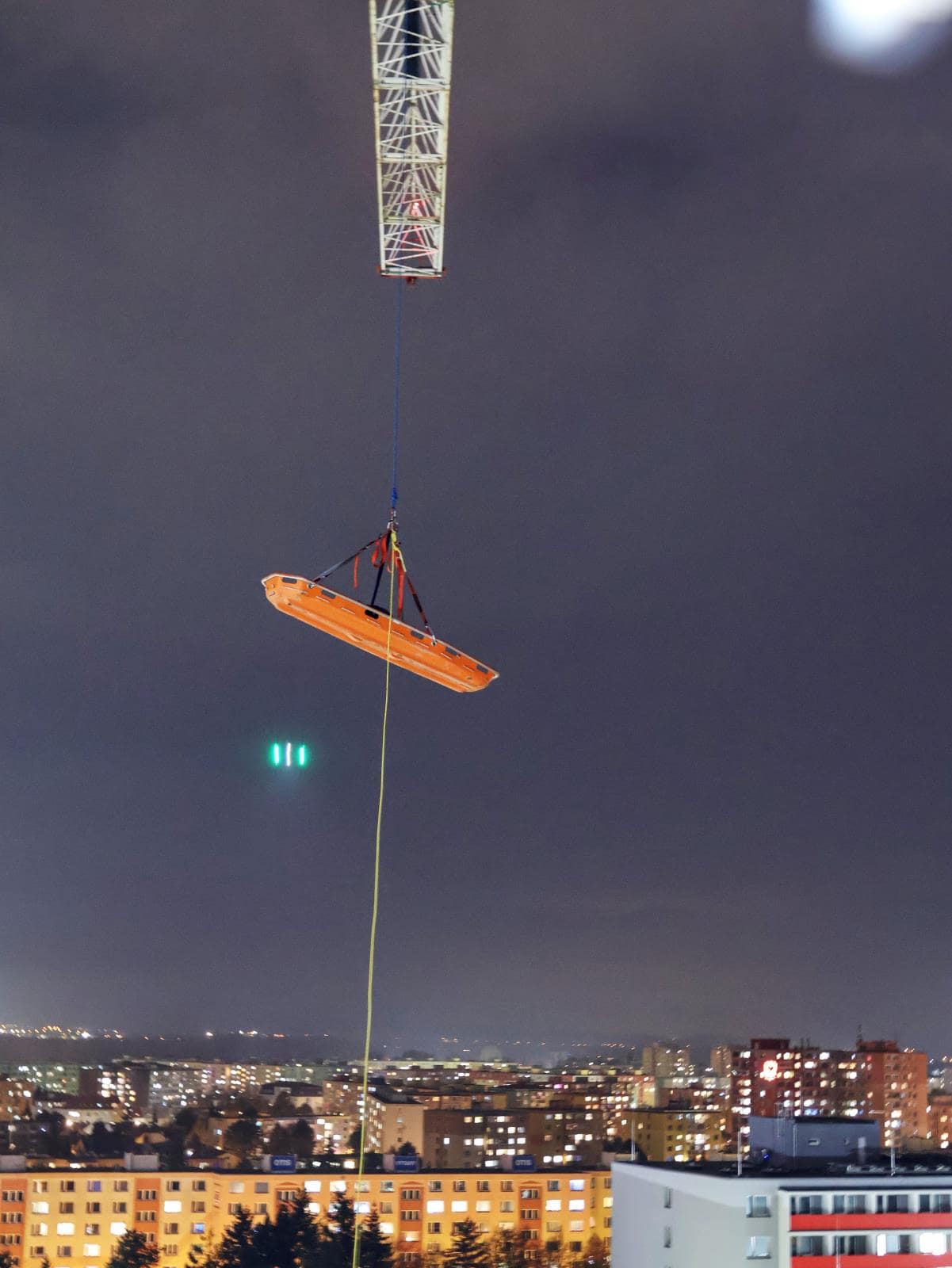 Prvním scénářem byla simulace zkolabovaného jeřábníka. Hasiči se museli dostat do kabiny, zajistit pacienta a pomocí speciálních nosítek jej bezpečně spustit až na zem. Celý zásah probíhal v úzkém prostoru a ve výšce, kde jakýkoliv chybný pohyb může zkomplikovat situaci.