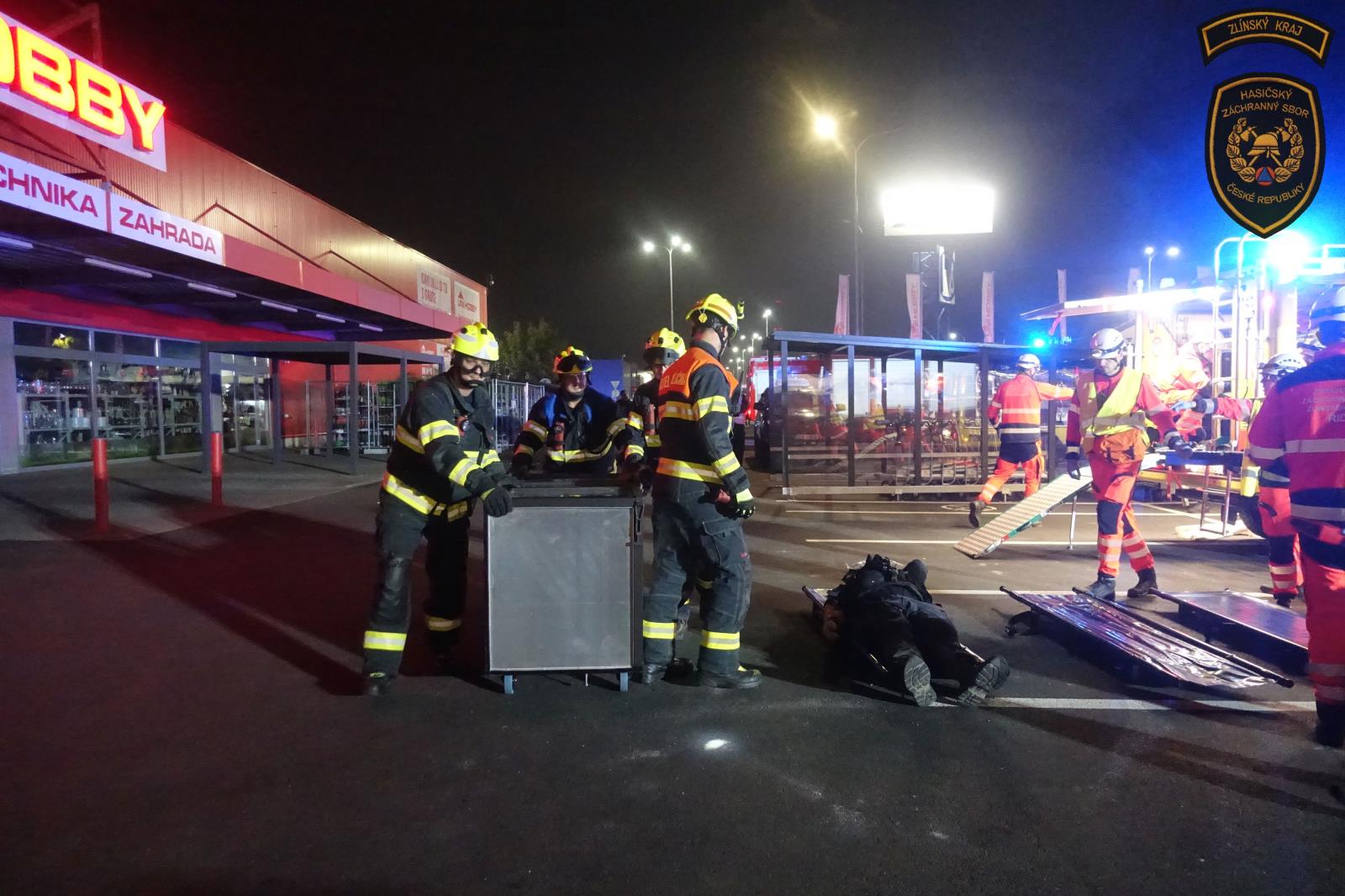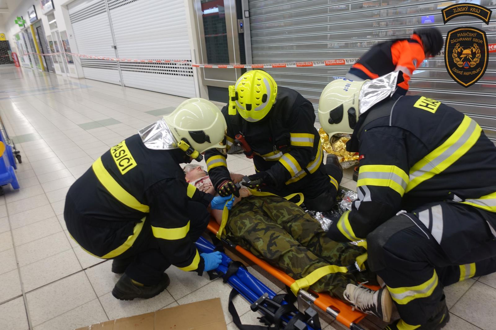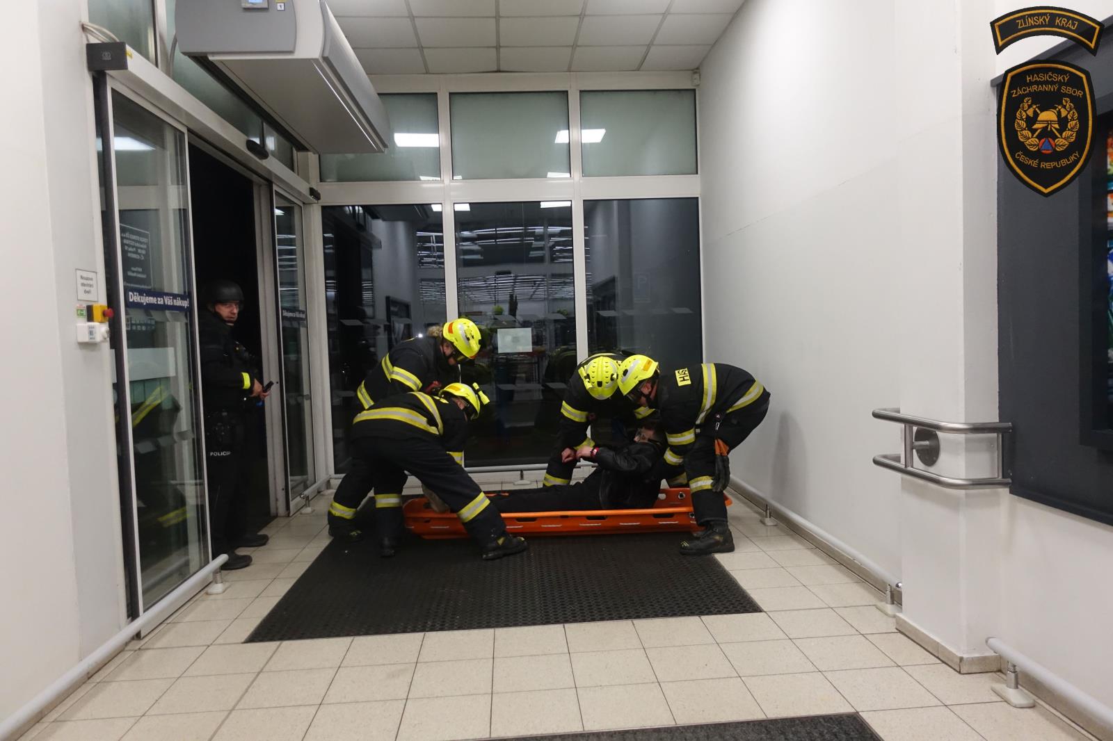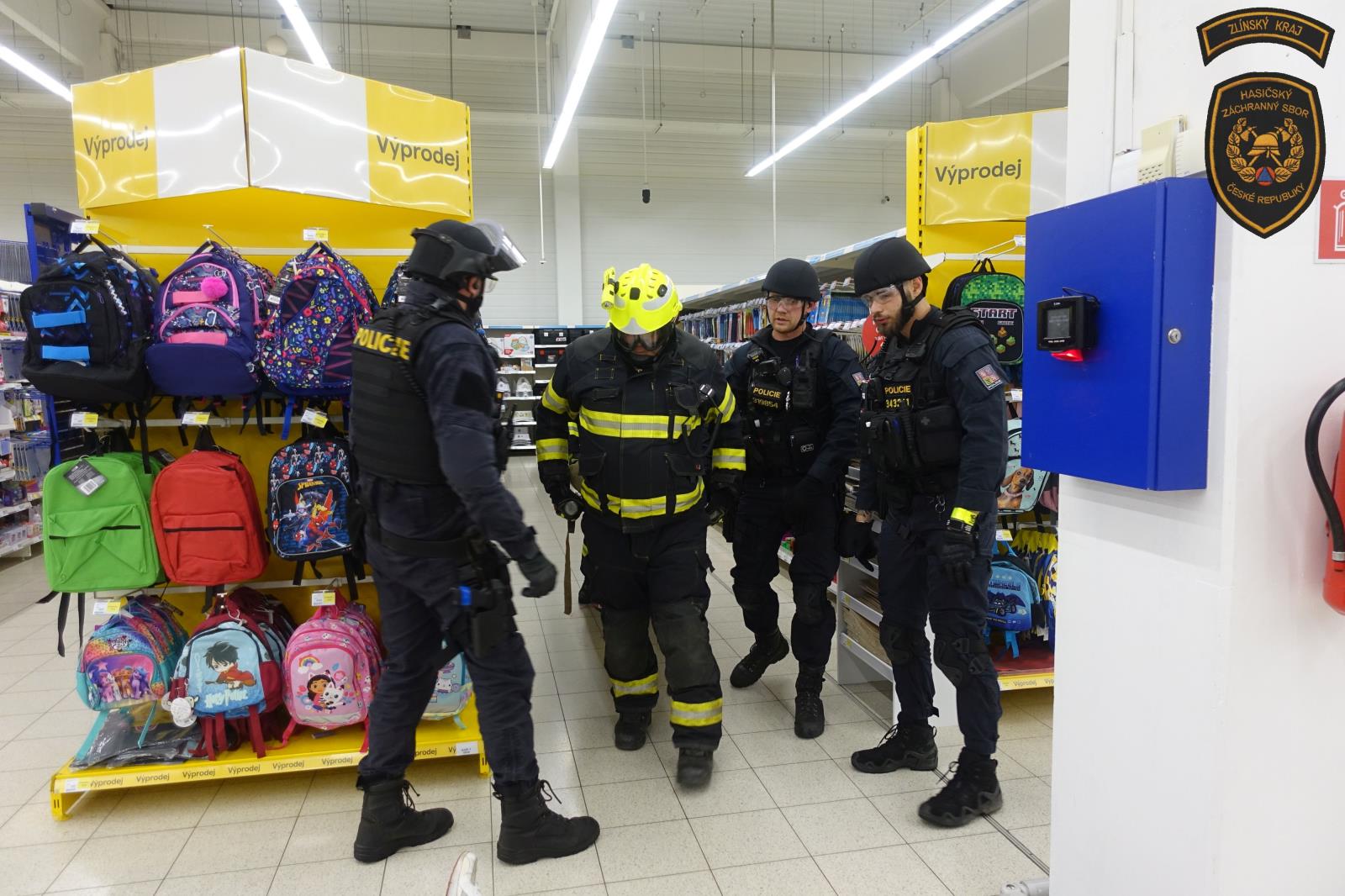 Modelová situace počítala s ozbrojeným útočníkem, který nejprve ohrozil lidi na parkovišti a poté vstoupil do prodejny. Policie okamžitě zajišťovala perimetr a vyhledávala pachatele. Po jeho zneškodnění nastoupili hasiči a zdravotníci – evakuovali zraněné, třídili je podle závažnosti a poskytovali první pomoc.