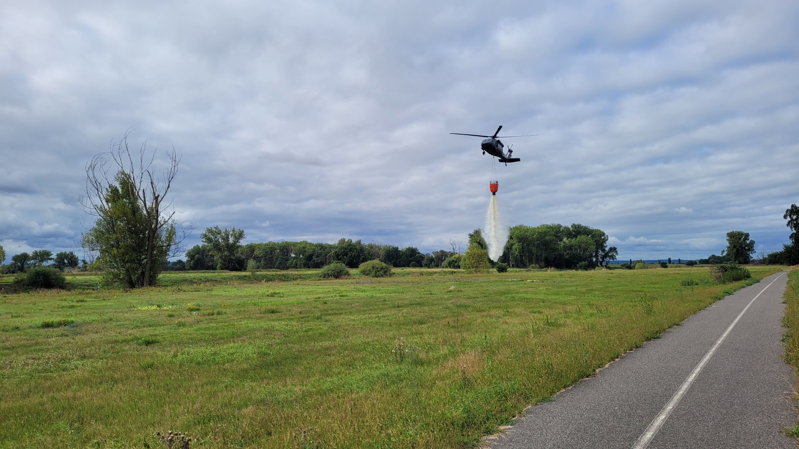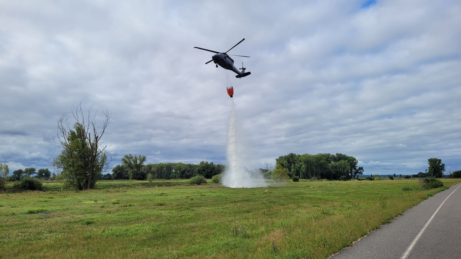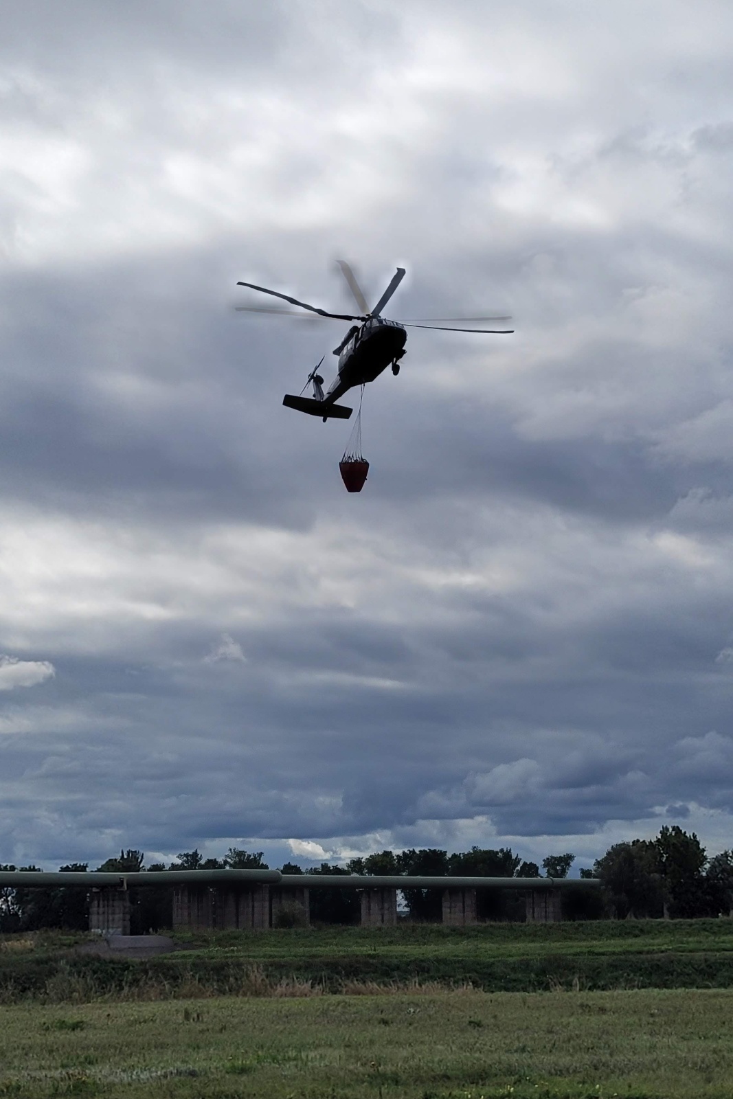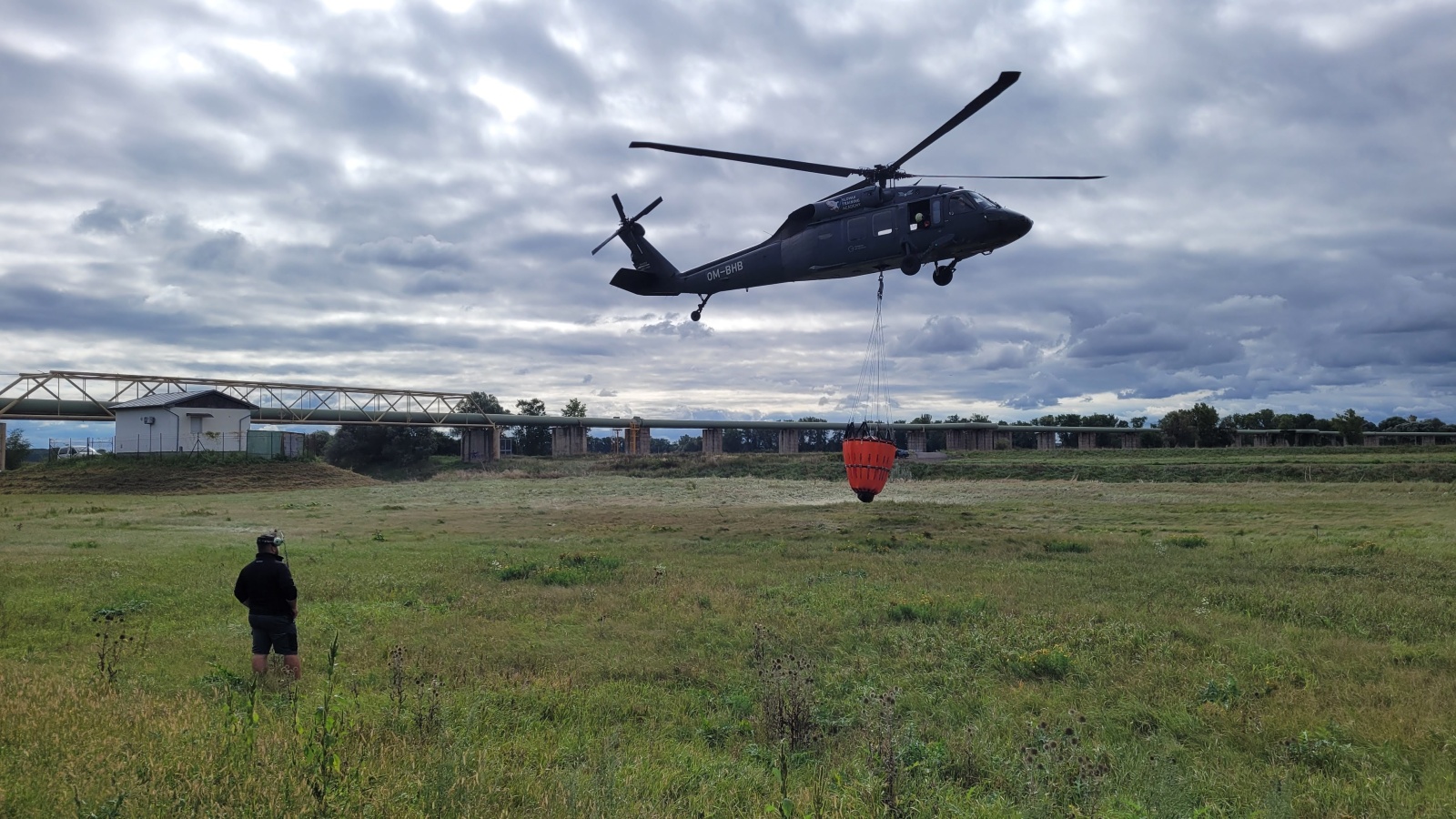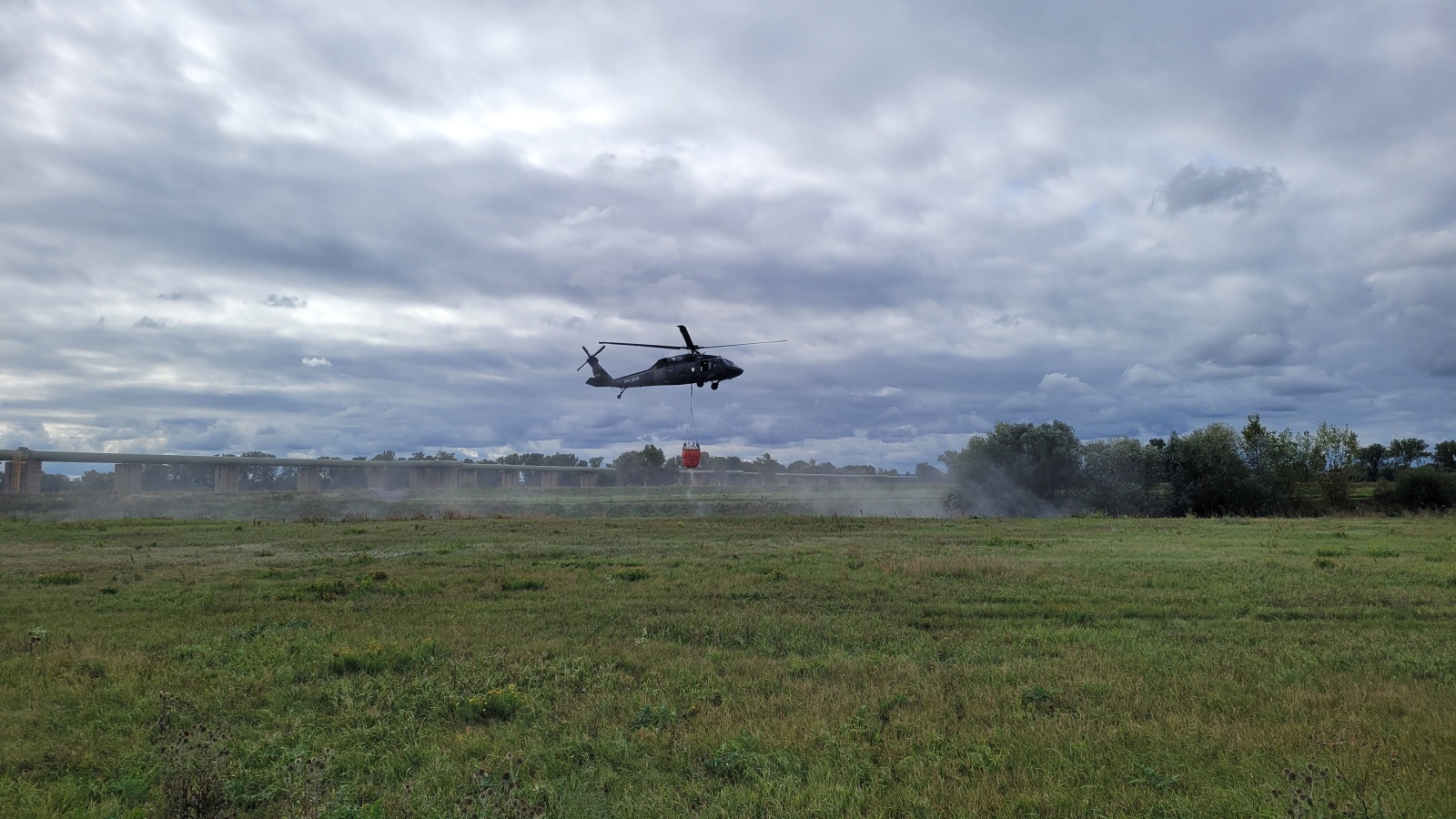 V katastru obce Hořín na Mělnicku proběhla ve čtvrtek 14. září krátká odborná příprava zaměřená na letecké hašení s využitím vrtulníku Sikorsky UH-60A Black Hawk.