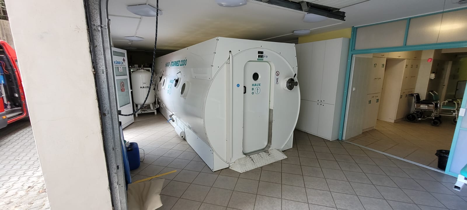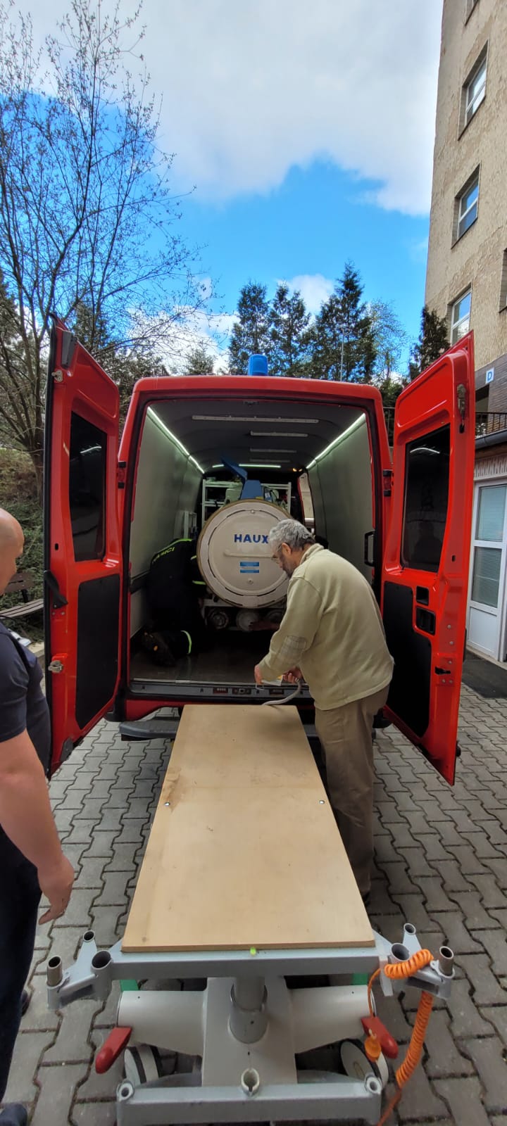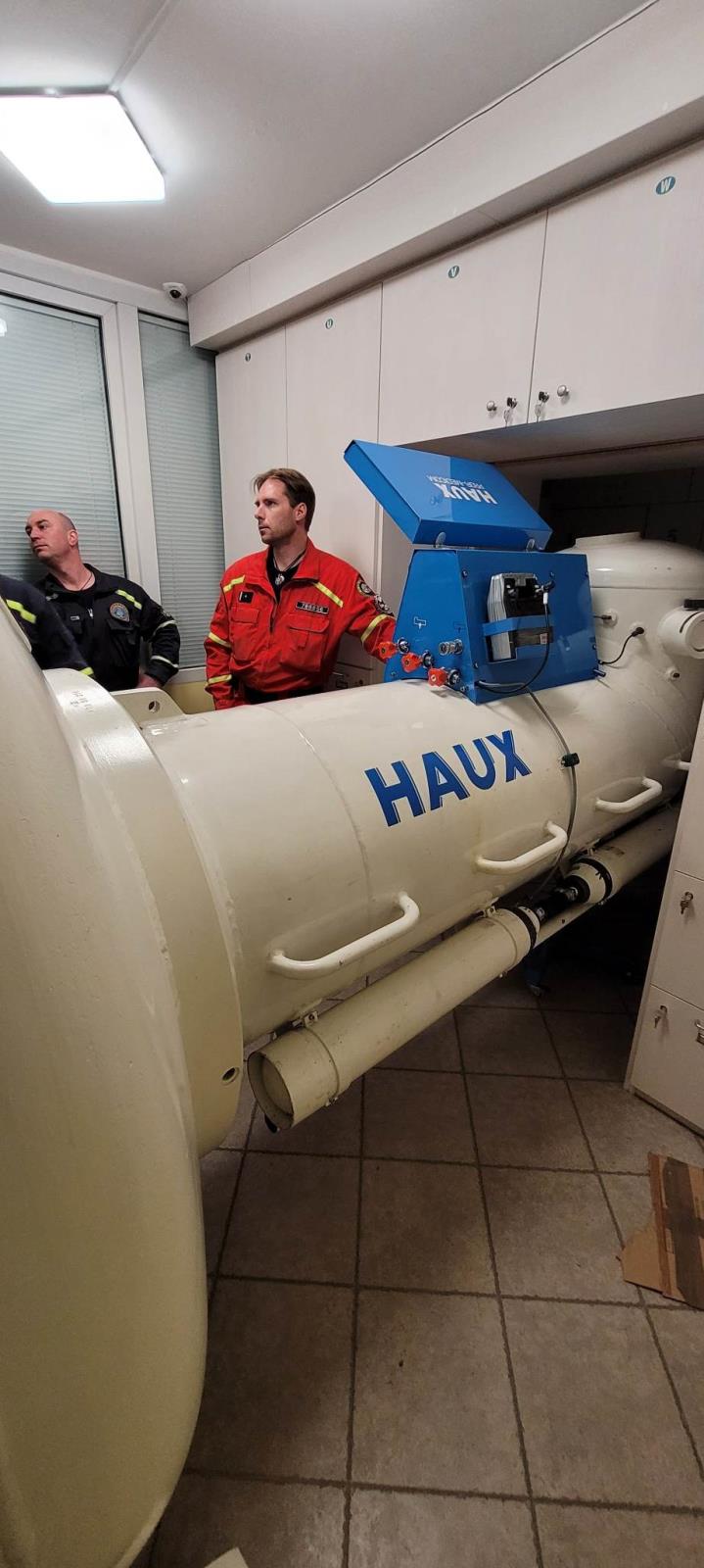 Ihned proto telefonicky kontaktovali na mobilní nonstop linku oddělení hyperbarické a potápěčské medicíny nemocnice Kladno. Po konzultaci s vedoucím lékařem a po prohlídce postiženého dle instrukcí lékaře byl potápěči podán kyslík a byl umístěn společně s dalším kolegou – dohledem do mobilní hyperbarické komory Haux Medition, která je umístěna na voze Iveco Daily a která je právě pro tyto případy vždy u výcviků a zásahů přítomna.