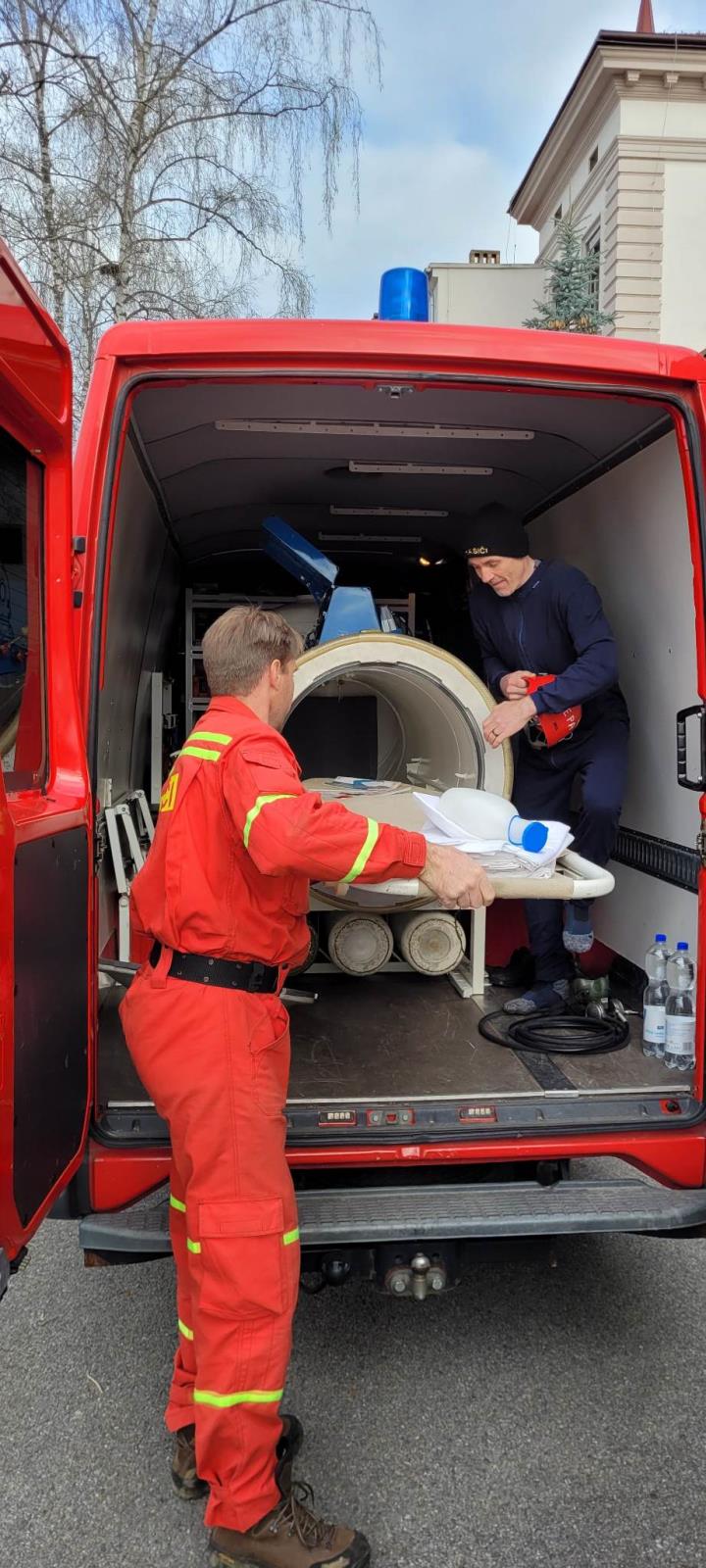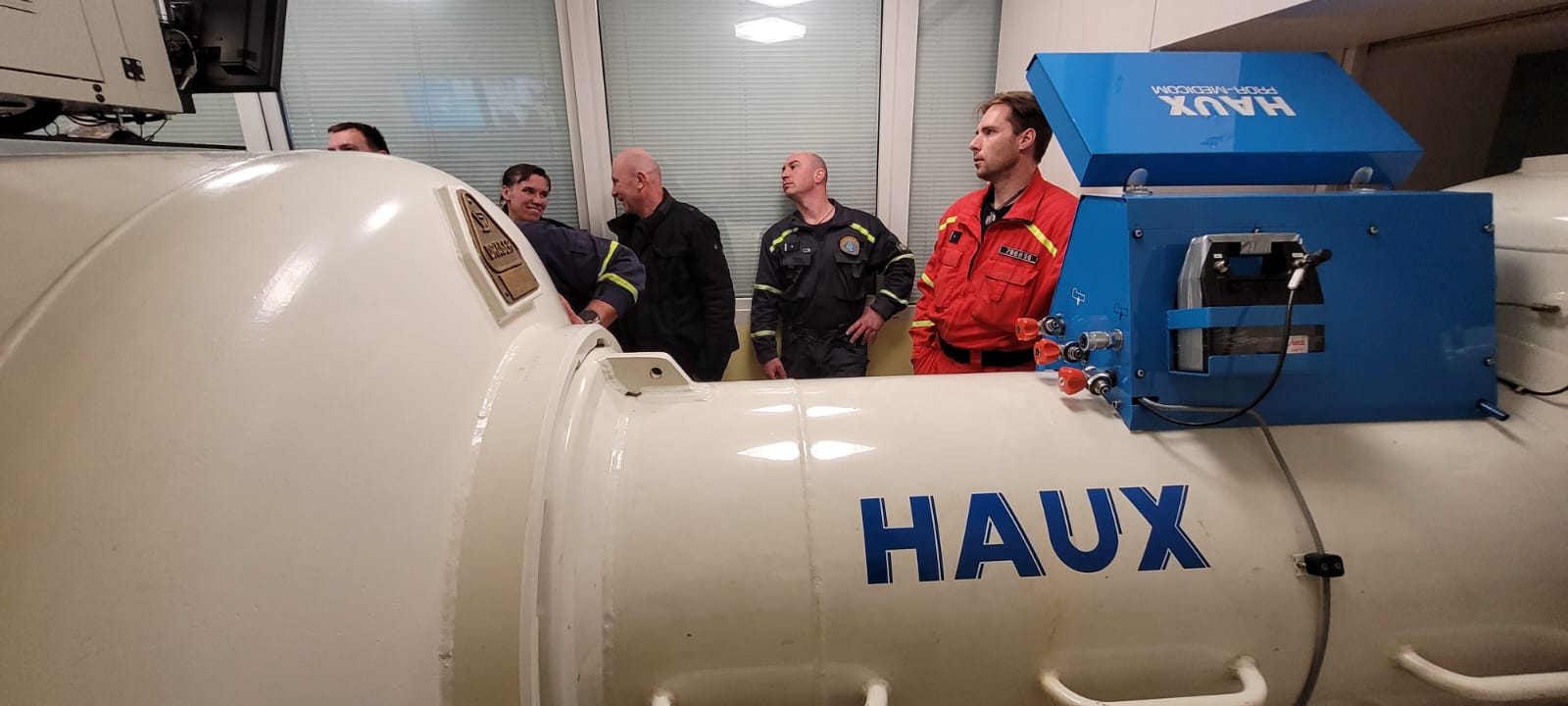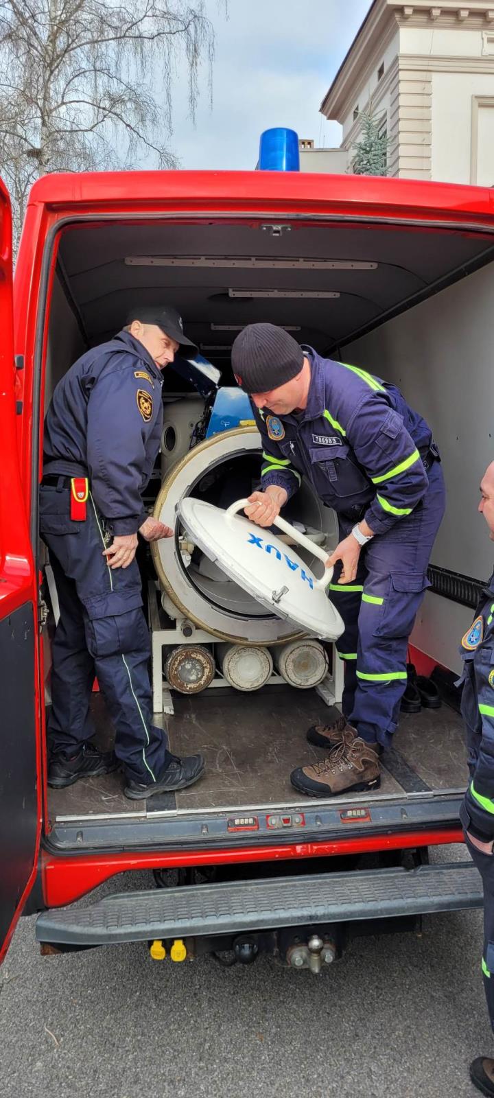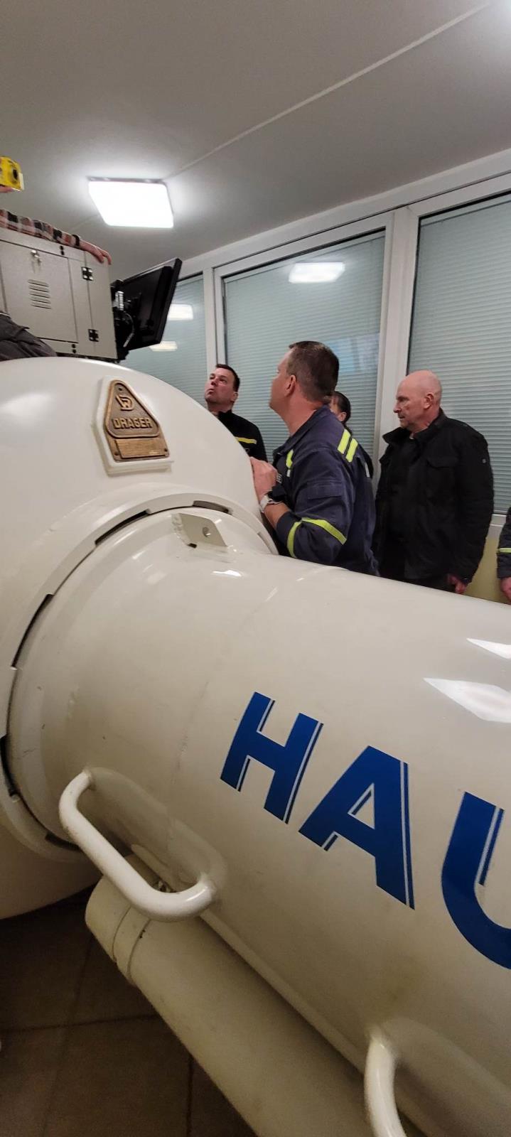 Jedním ze cvičení, které potápěčská skupina HZS Jihočeského kraje absolvovala na začátku dubna, bylo prověření jihočeských potápěčů, zda dokážou umístit do mobilní barokomory HZS Jihočeského kraje kolegu potápěče po potápěčské nehodě, transportovat ho na oddělení hyperbarické a potápěčské medicíny v nemocnici Kladno, tam mobilní barokomoru připojit na nemocniční stabilní barokomoru a pacienta do stabilní barokomory přesunout k následné léčbě.