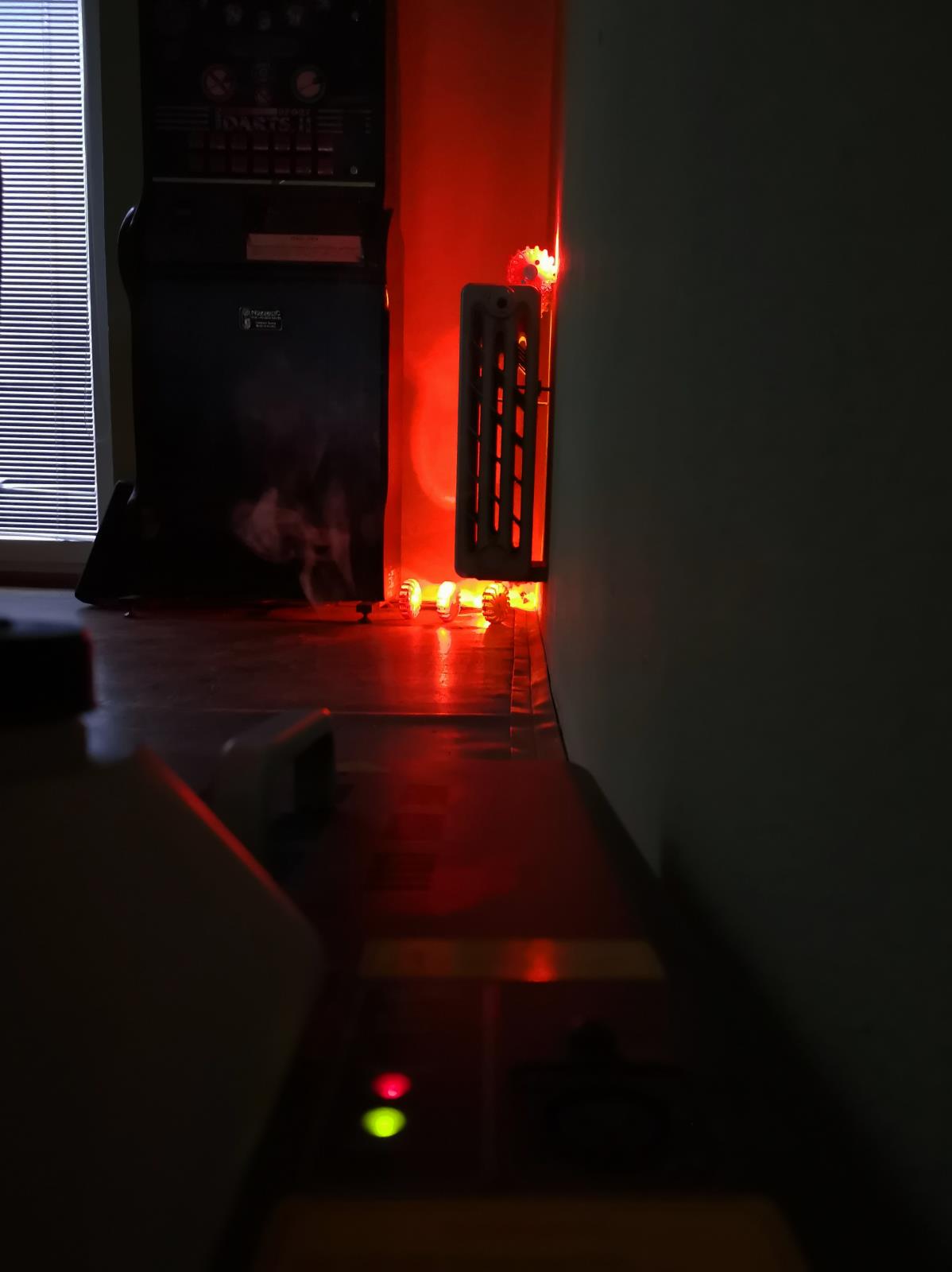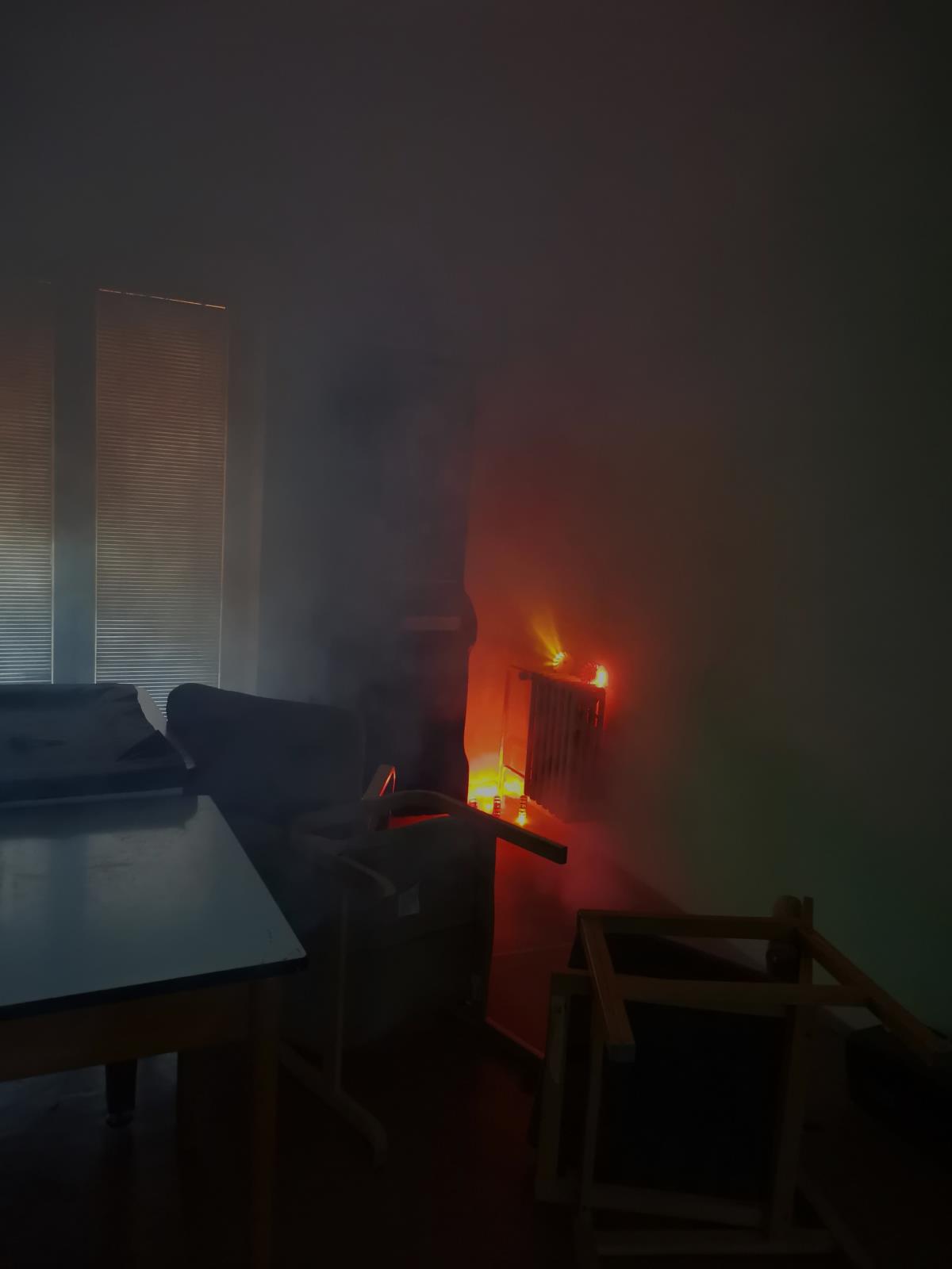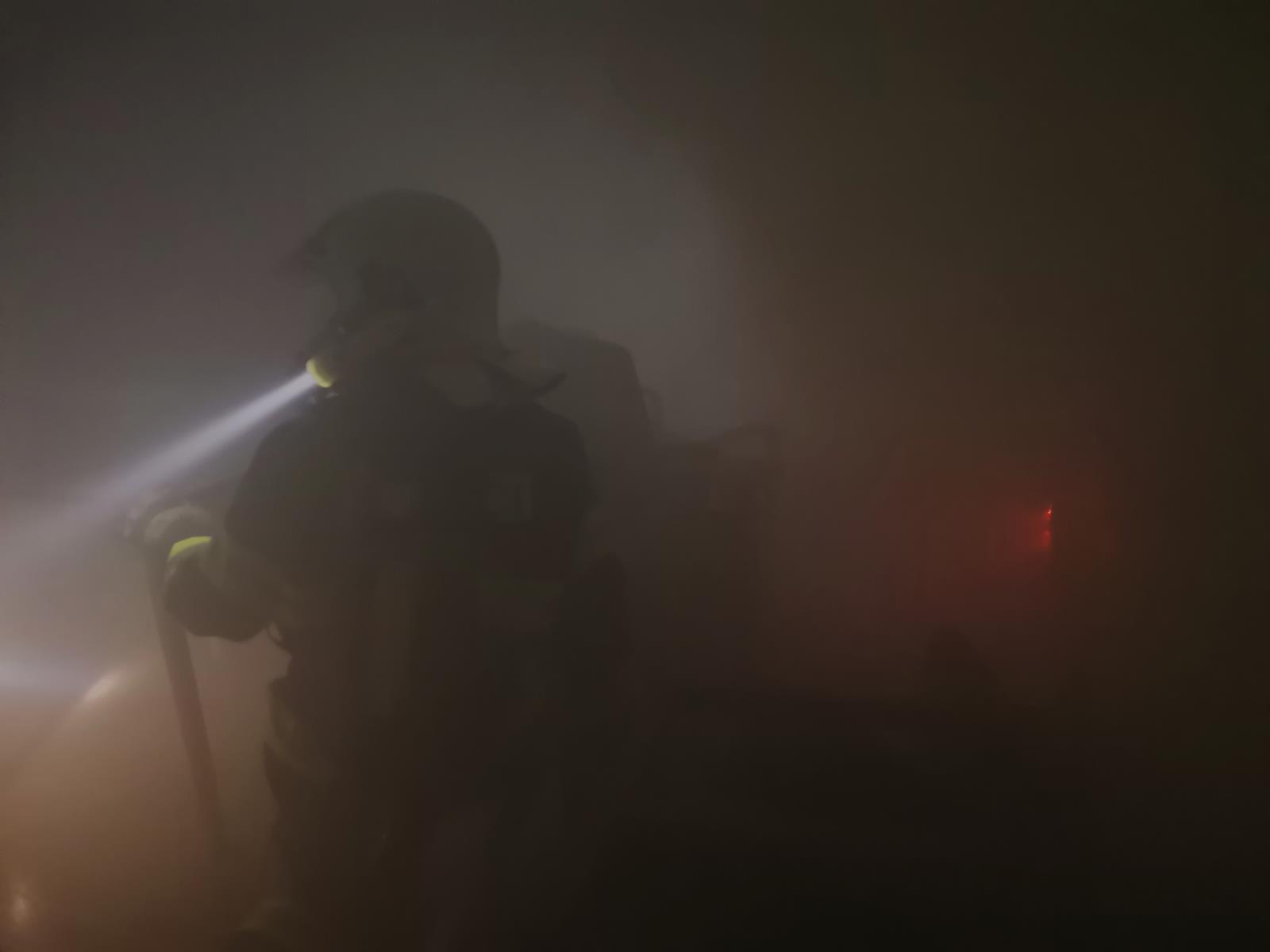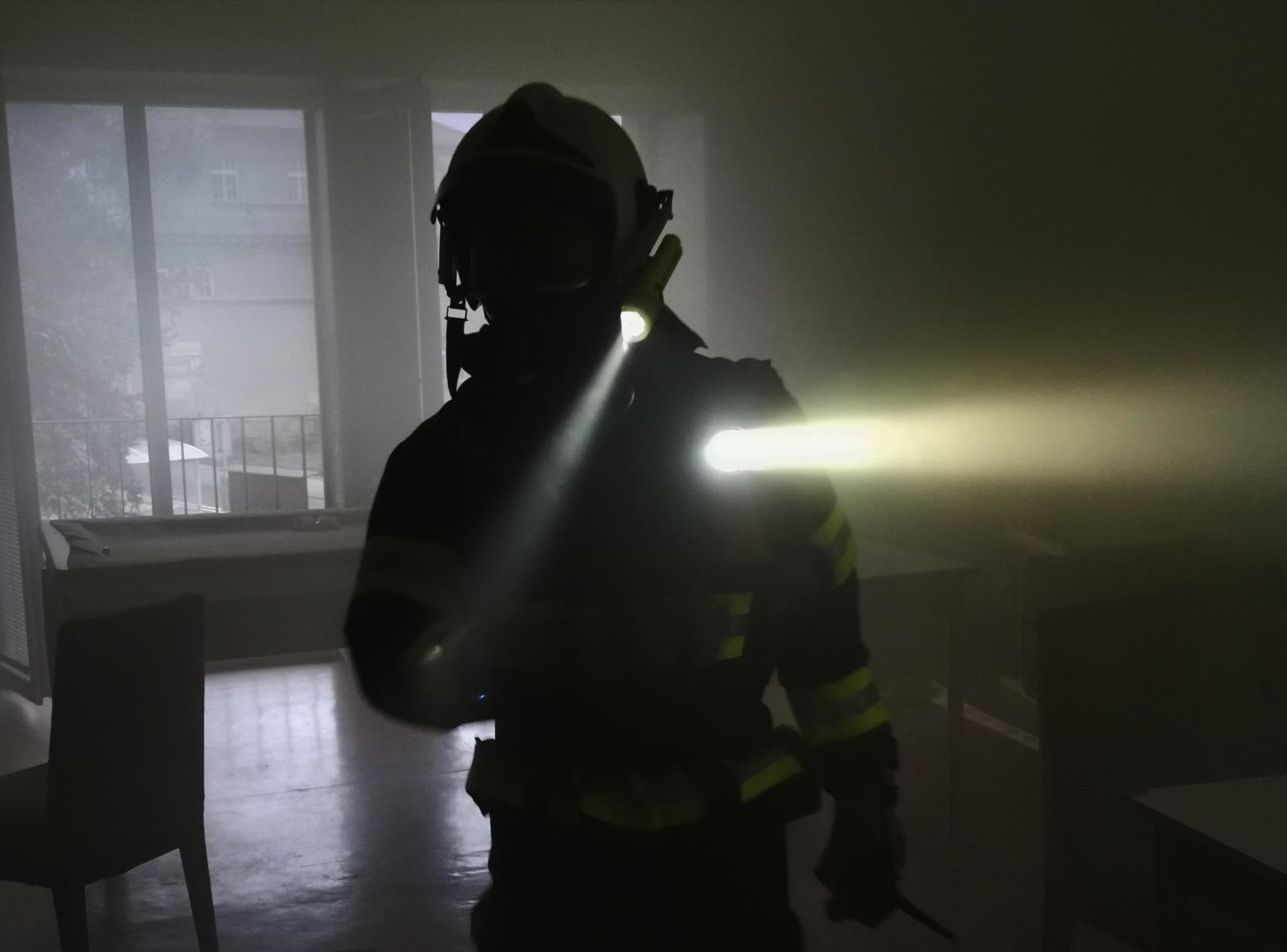 Sníženou viditelnost, obtížný pohyb při zemi v hořícím bytě a nezřetelnou komunikaci v družstvu mezi sebou je dnes již možné cvičit i v prostorách našich stanic poměrně rozmanitou formou. Požár s vývinem kouře (jako jedním z produktů hoření) umíme v obytné místnosti beze škody simulovat světelnými puky oranžové barvy a diskotékovým vyvíječem kouře, tzv. dýmostrojem, který vytvoří ze speciální kapaliny skutečný kouř bez zápachu a škodlivých látek. V kouři je možné se pohybovat i bez dýchacího přístroje, což oceňují zejména figuranti a hodnotící velitelé. Posuďte sami reálnou simulaci našeho prostředí z fotek.