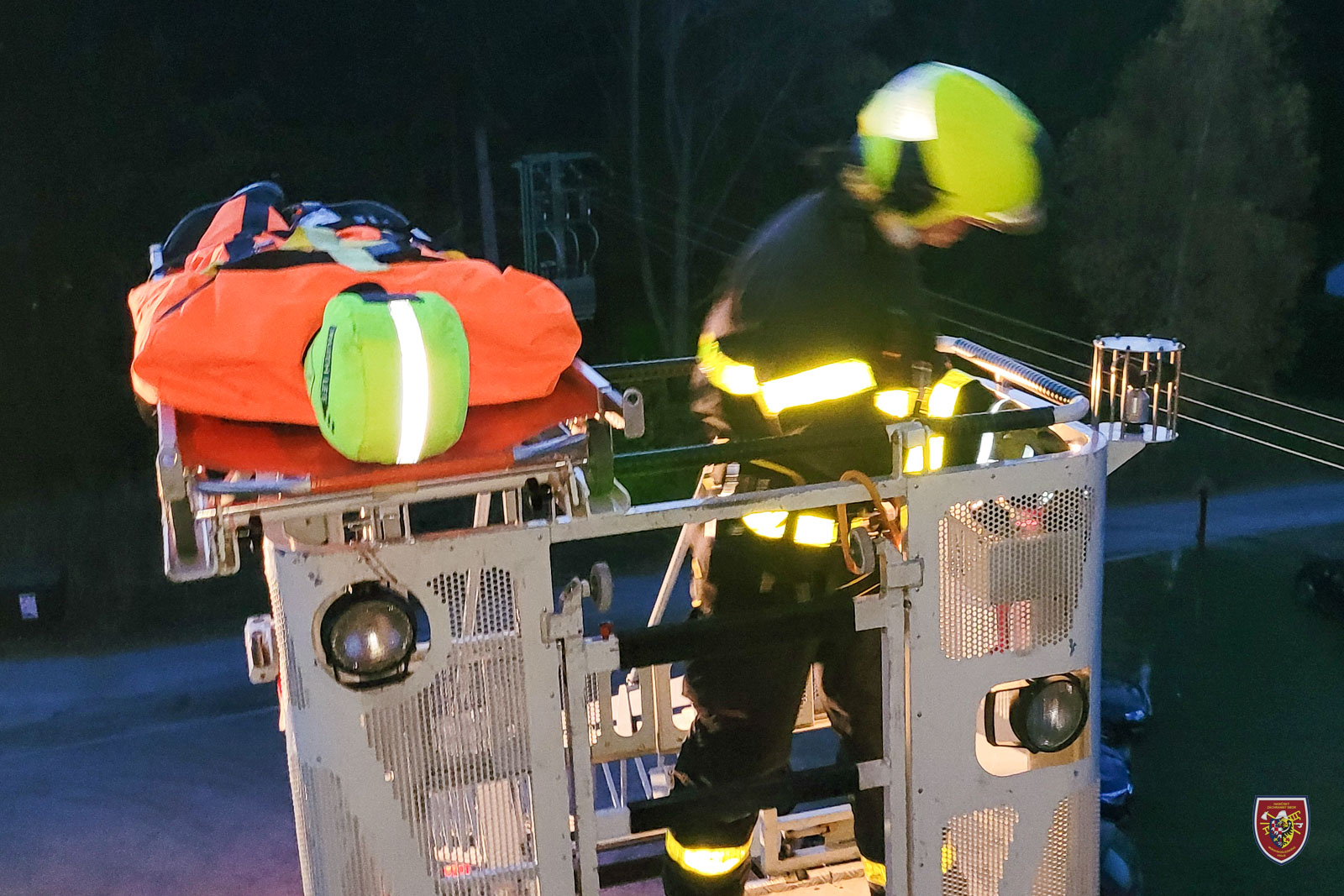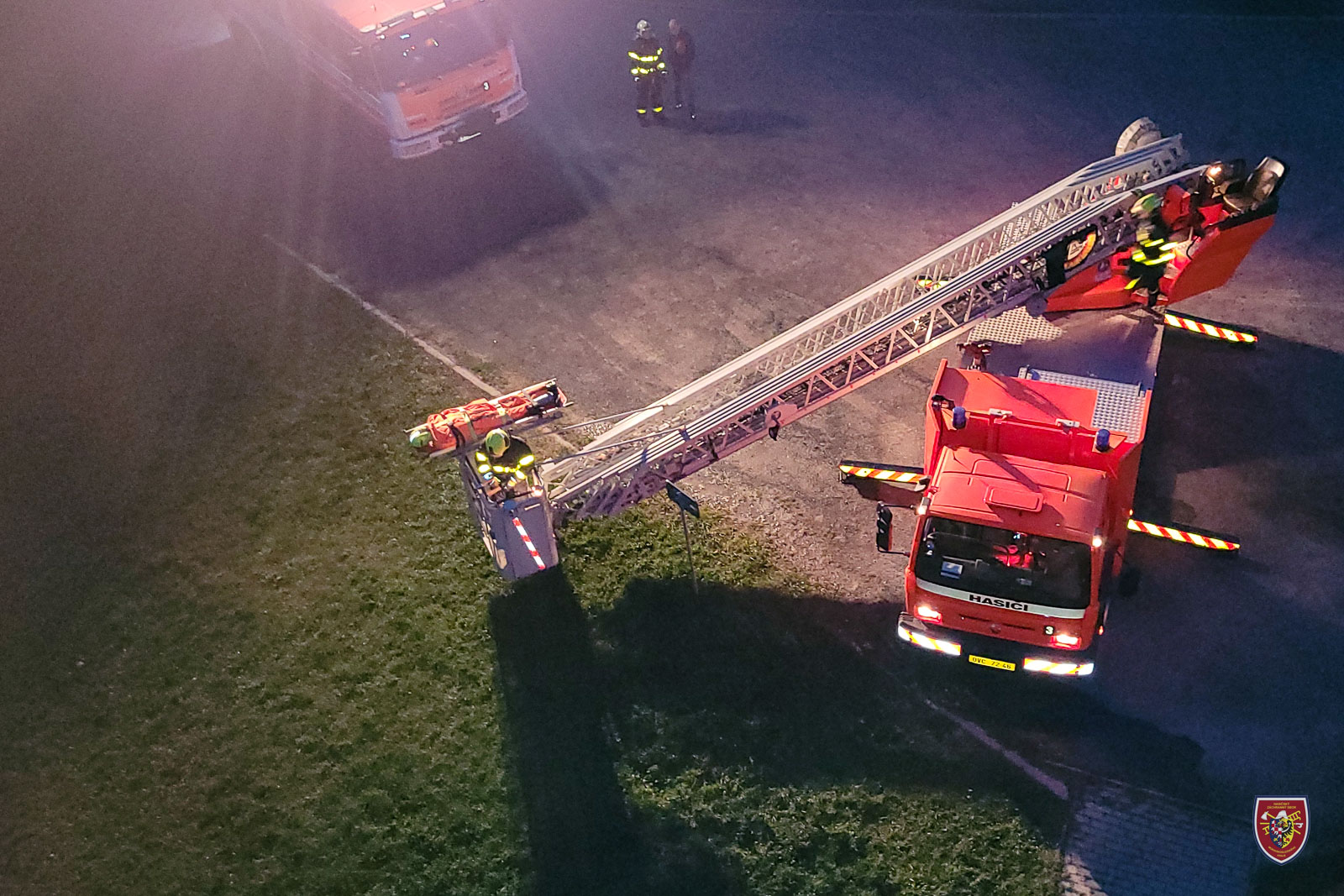 Zraněného dělníka po poskytnutí základní předlékařské první pomoci snesli k nejbližšímu volnému oknu, kde ho naložili na nosítka v záchranném koši automobilového žebříku.