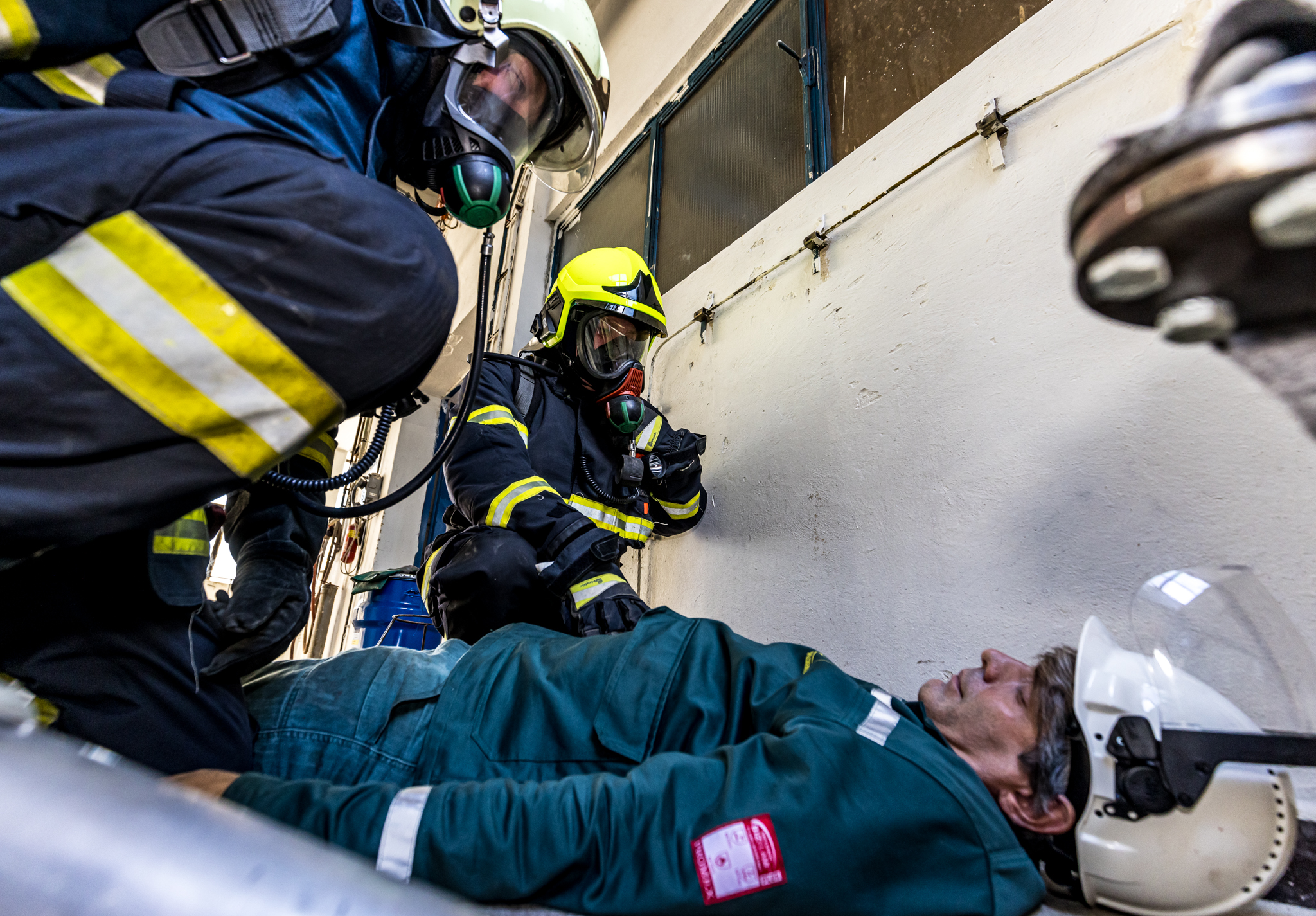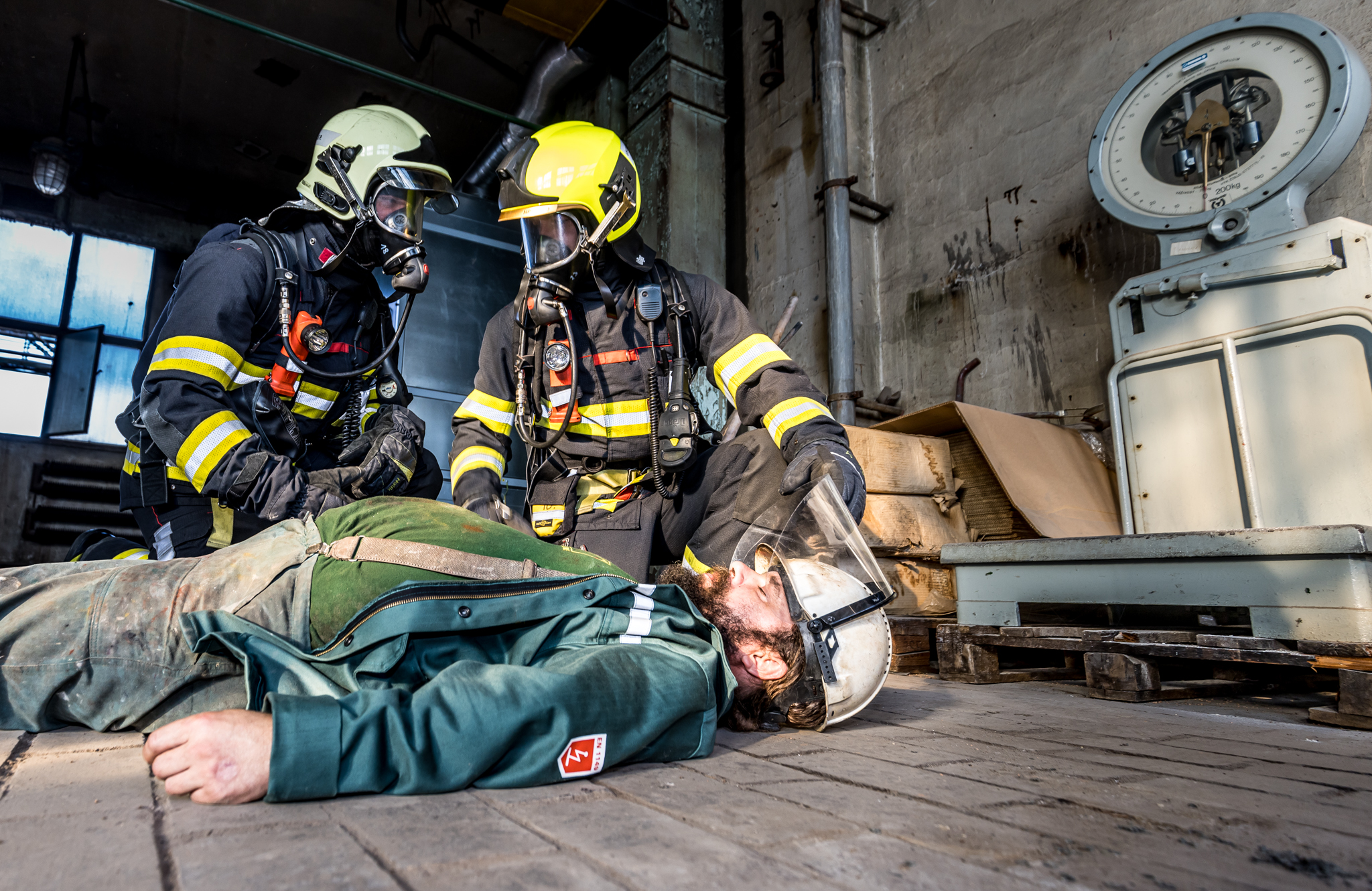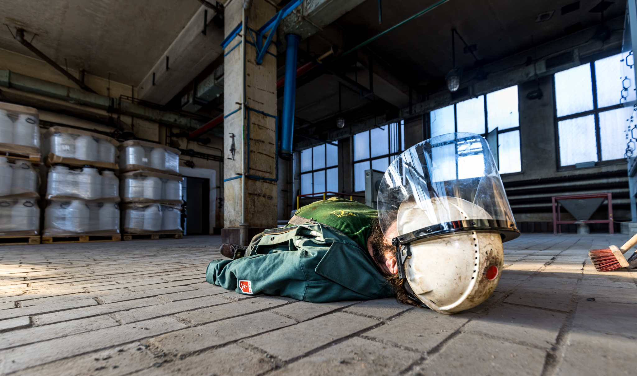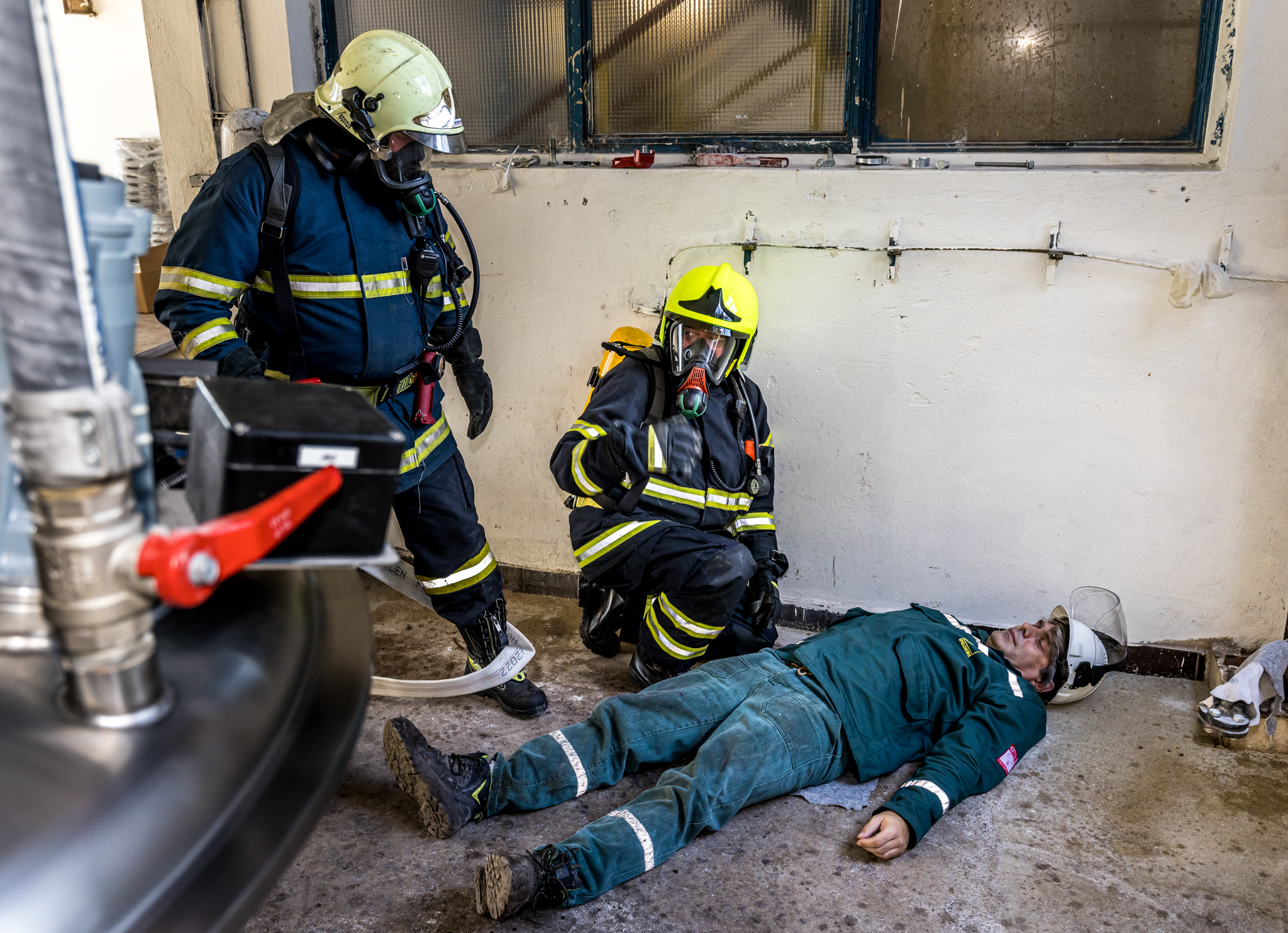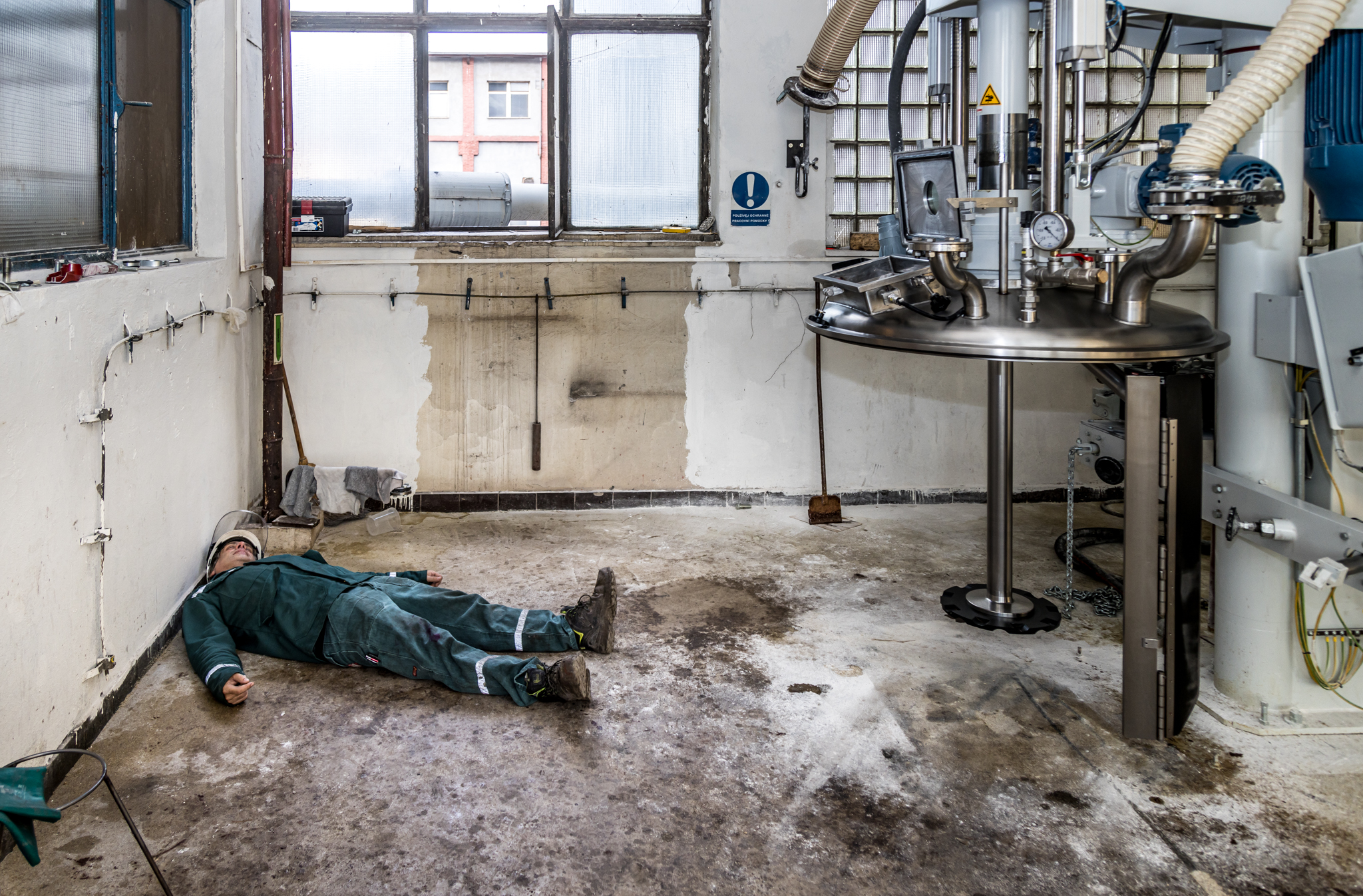 Jeden pracovník se nachází poblíž dissolveru v 2.NP a další pracovník se zraní při kontrole filtrační jednotky ventilace v 3.NP.
