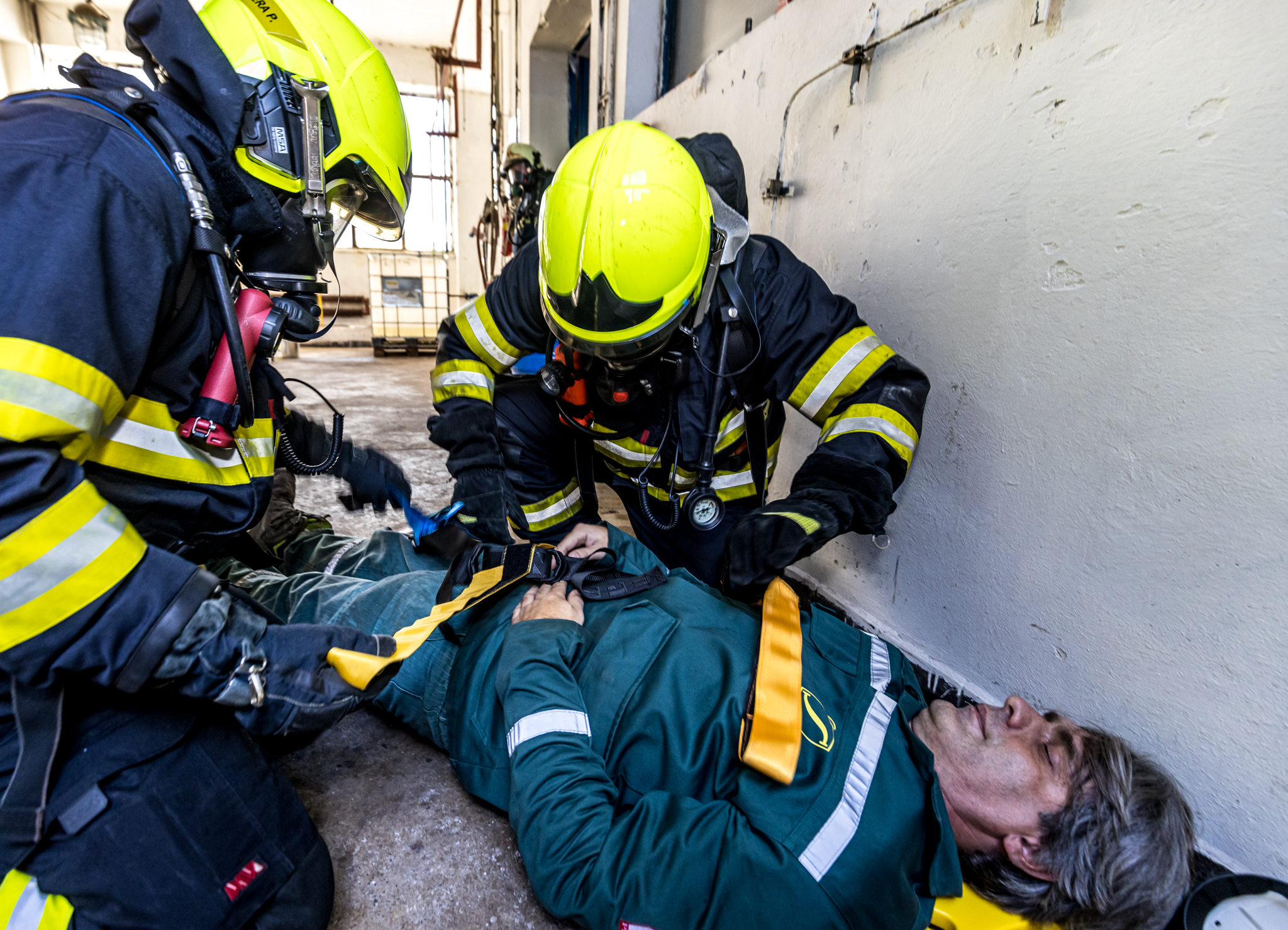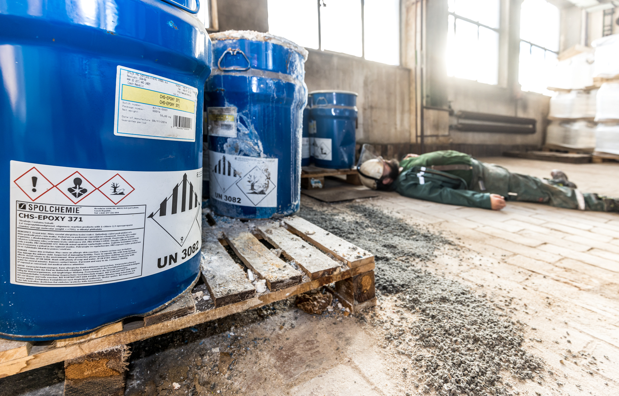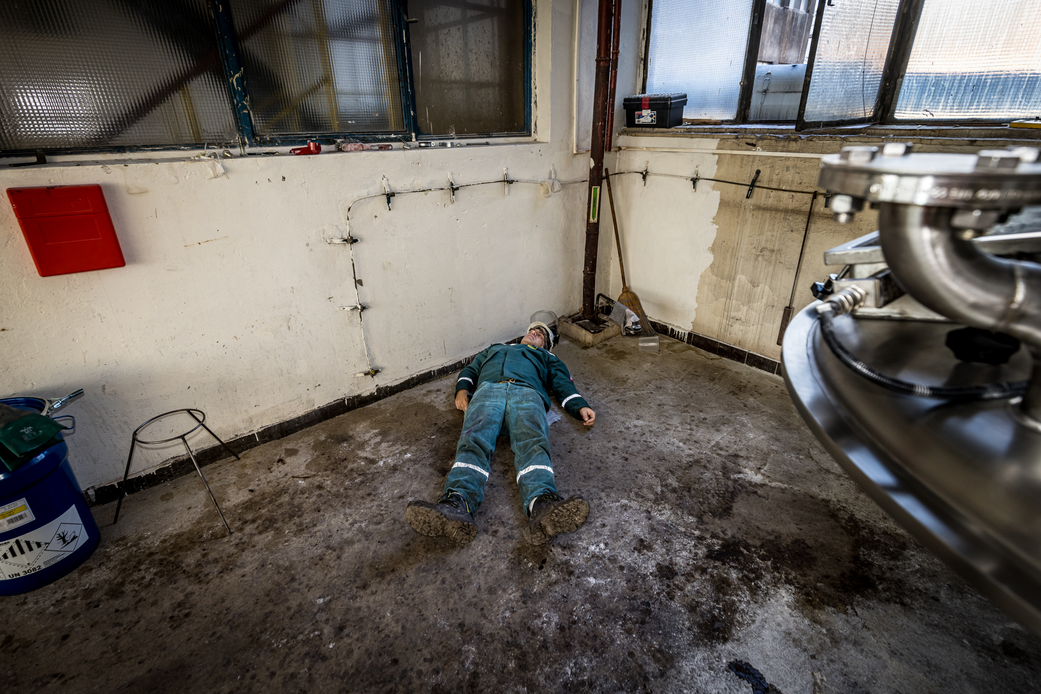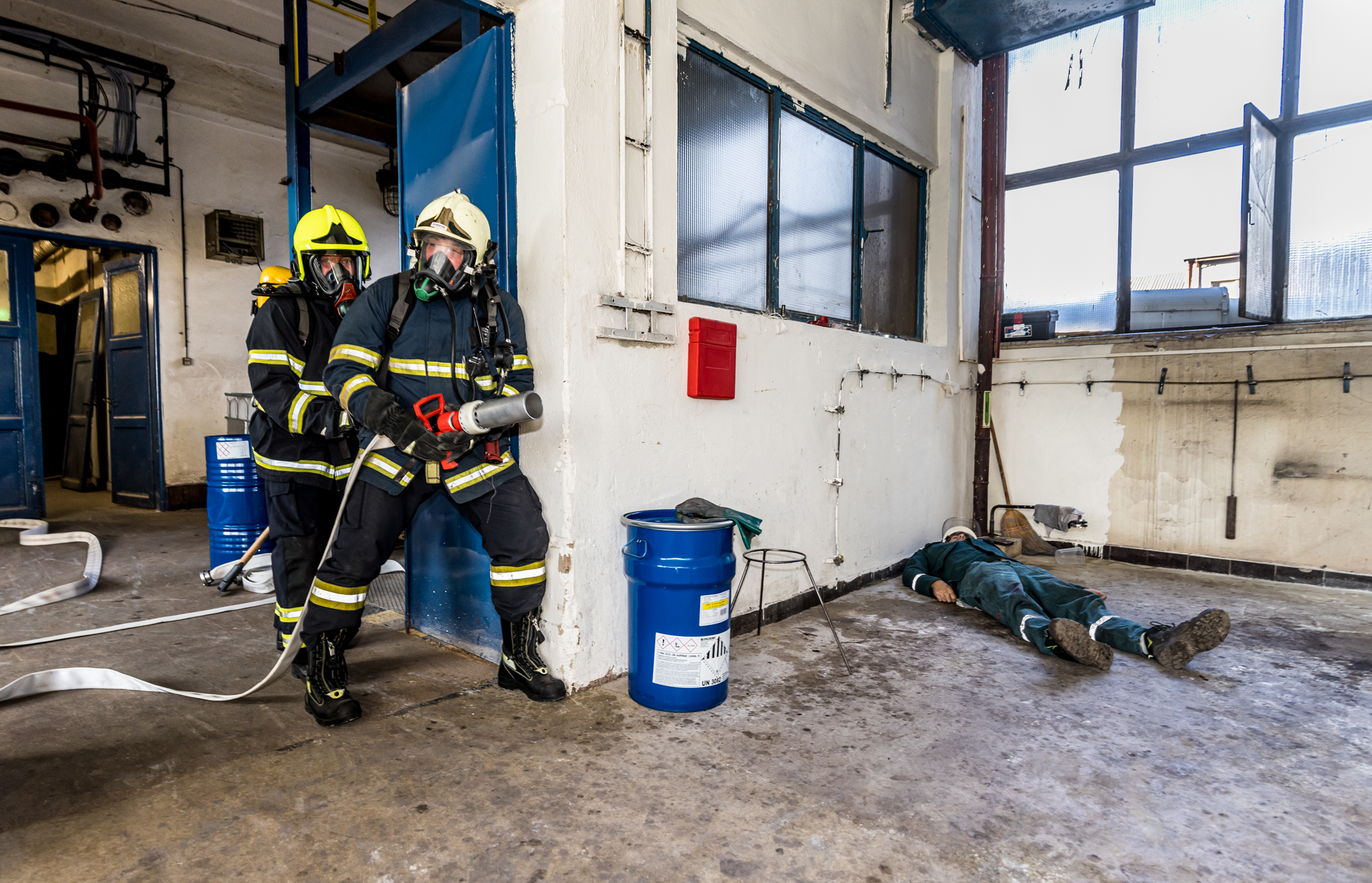 Jeden pracovník se nachází poblíž dissolveru v 2.NP a další pracovník se zraní při kontrole filtrační jednotky ventilace v 3.NP.