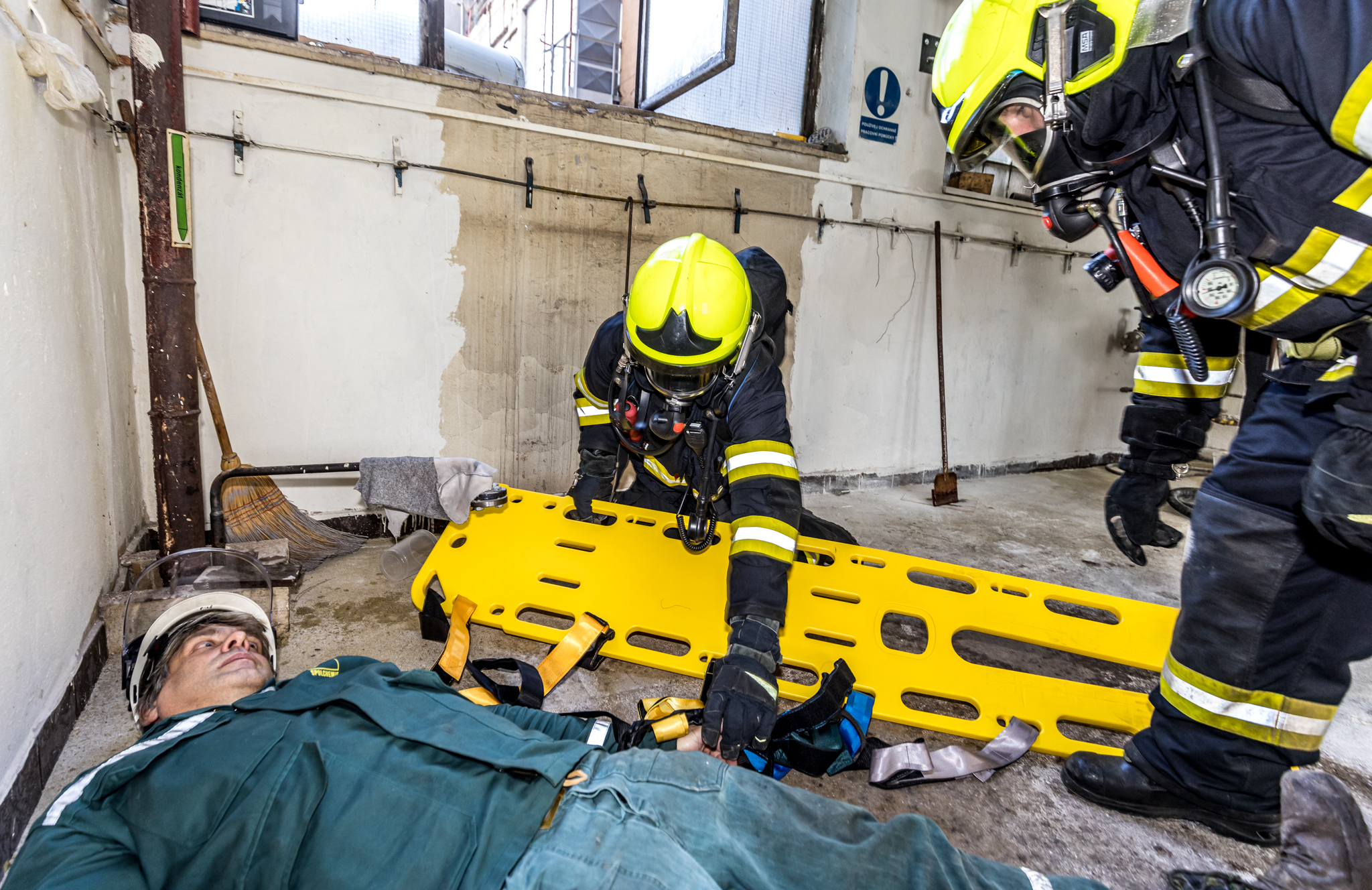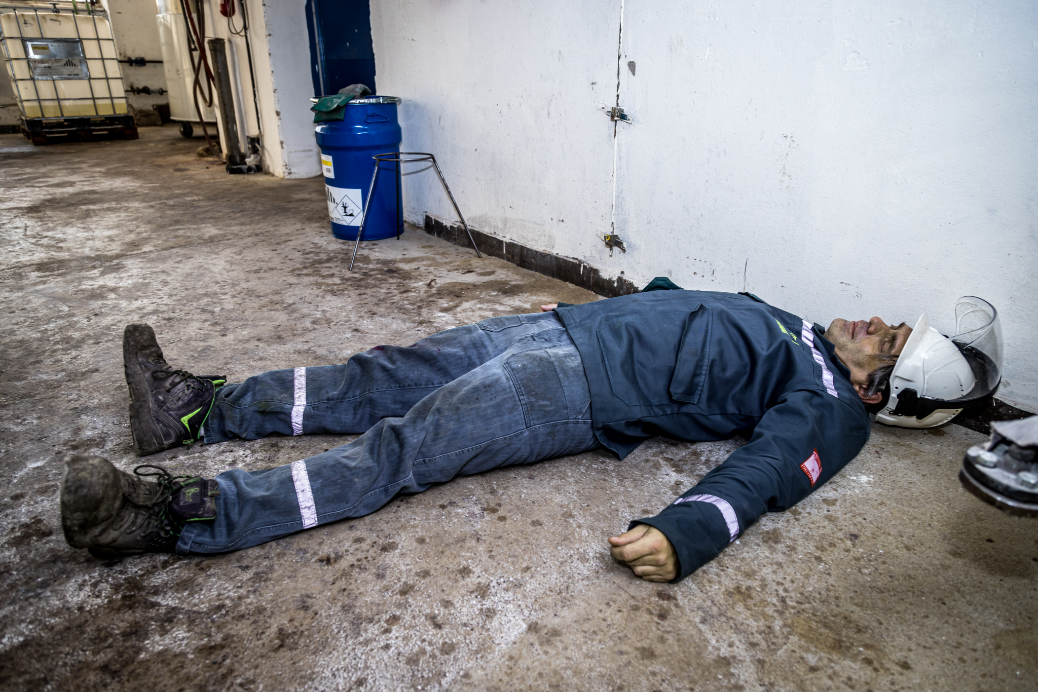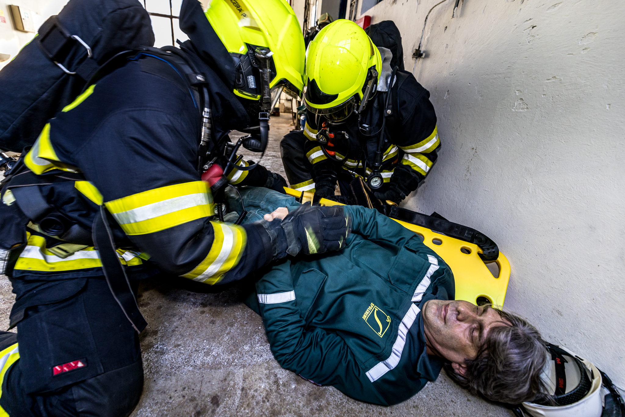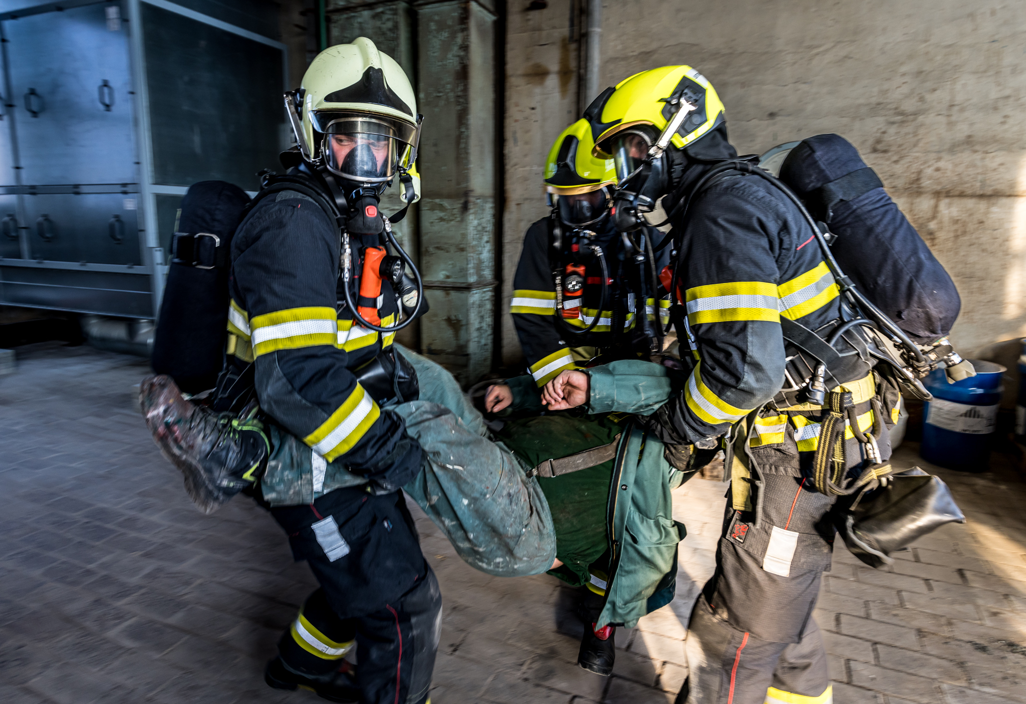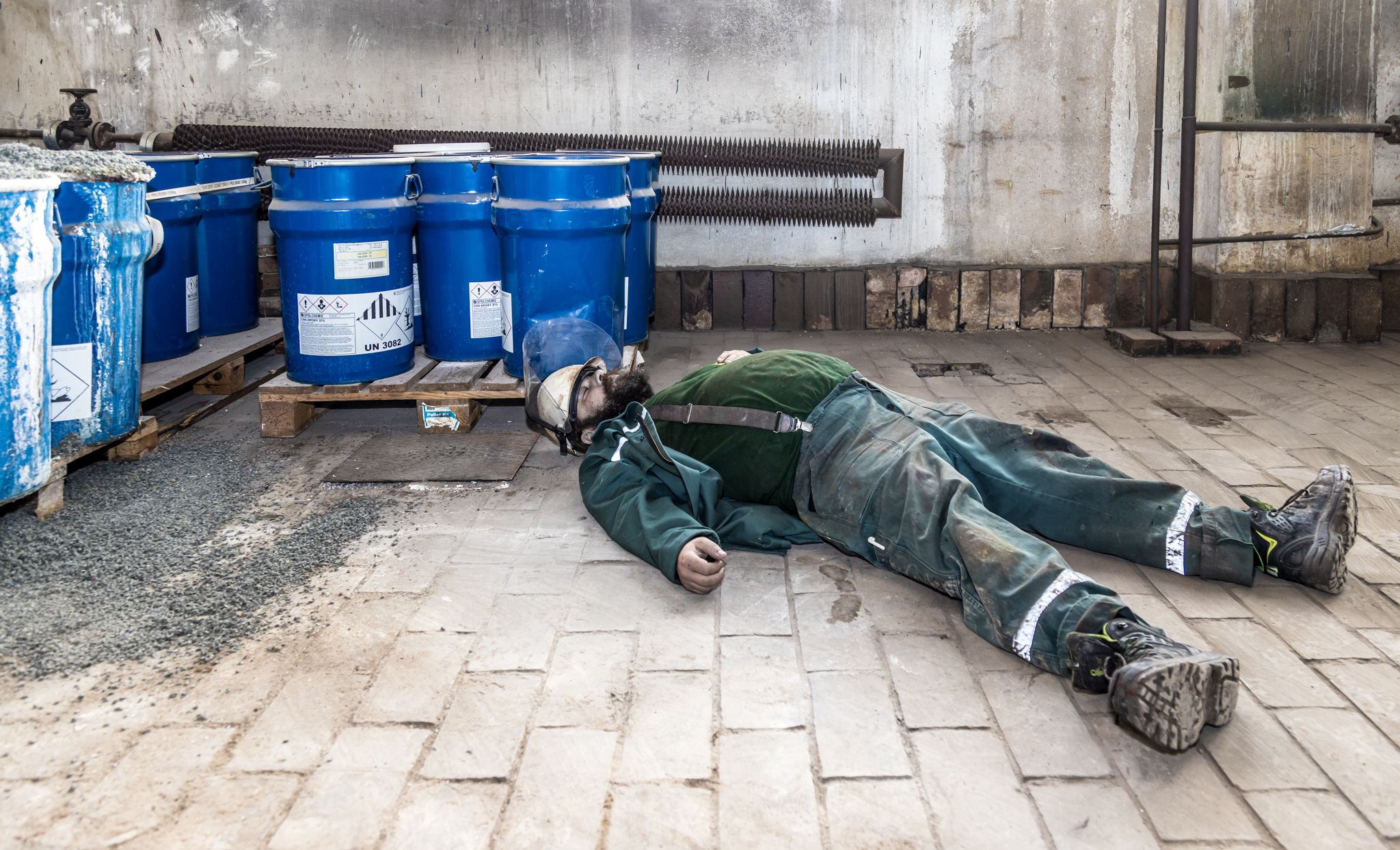 Jeden pracovník se nachází poblíž dissolveru v 2.NP a další pracovník se zraní při kontrole filtrační jednotky ventilace v 3.NP.