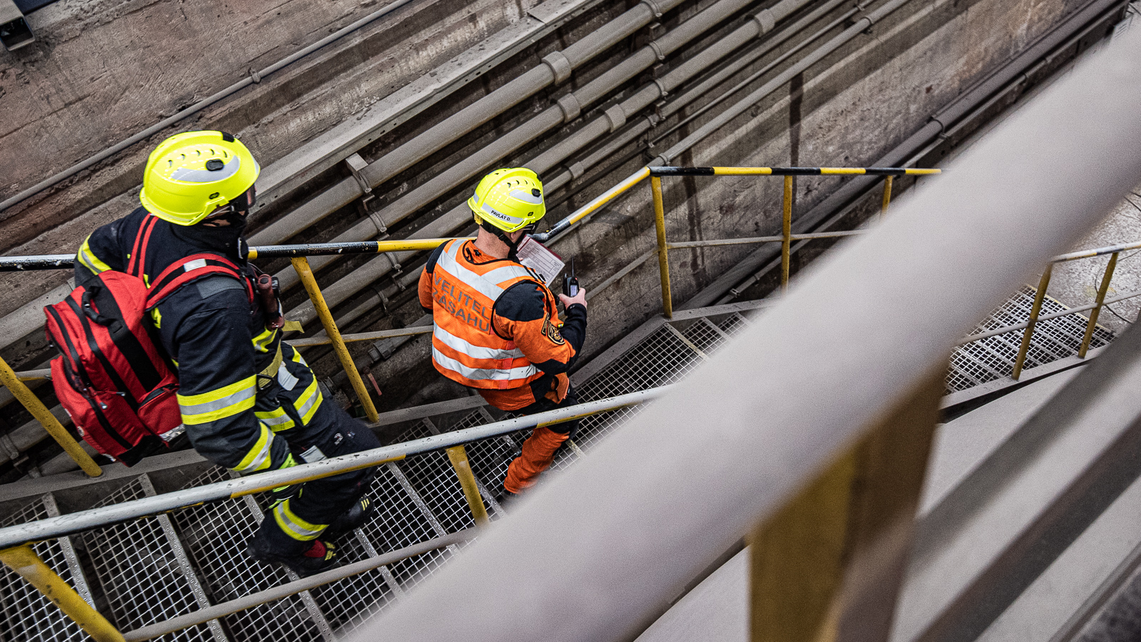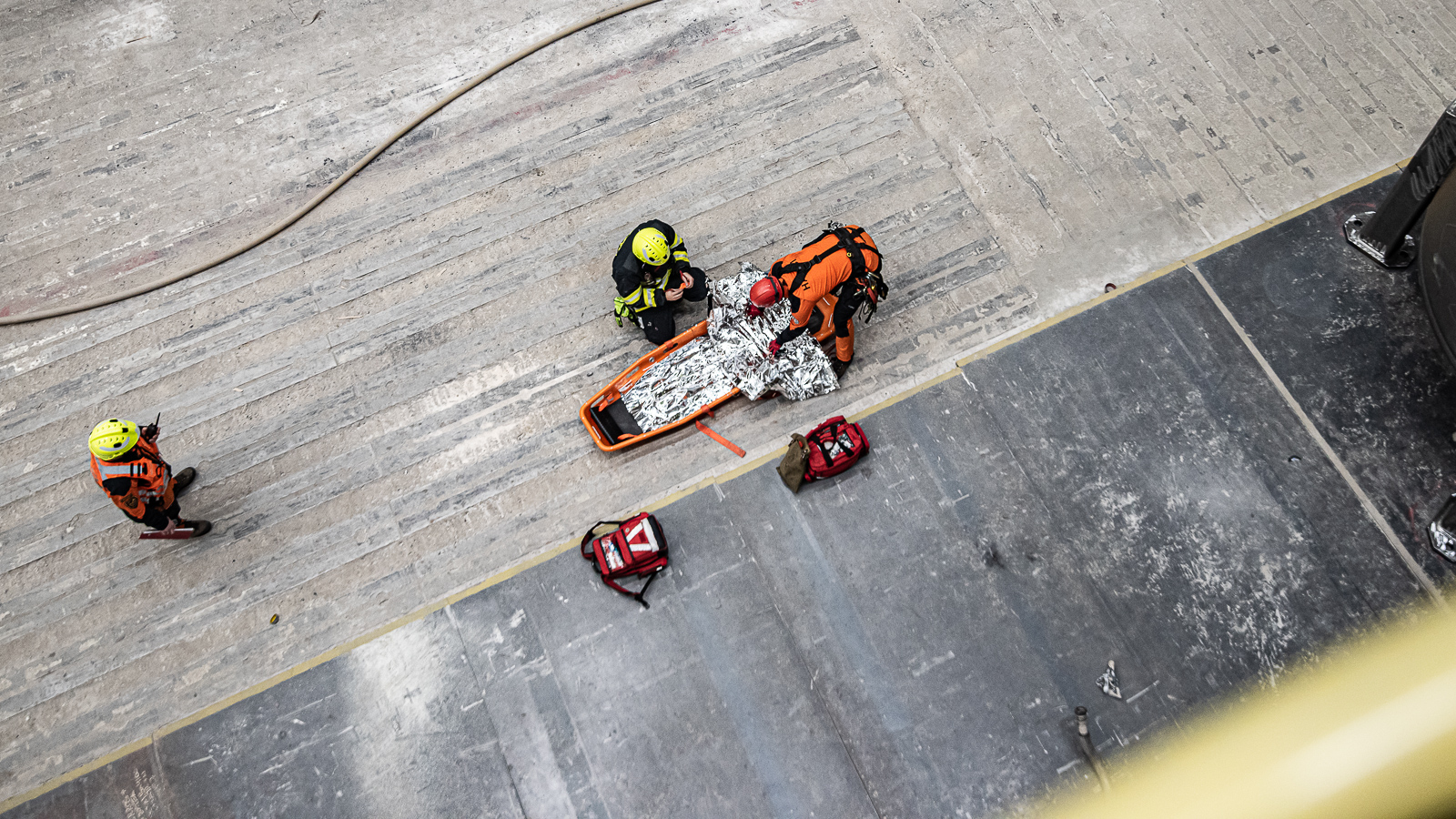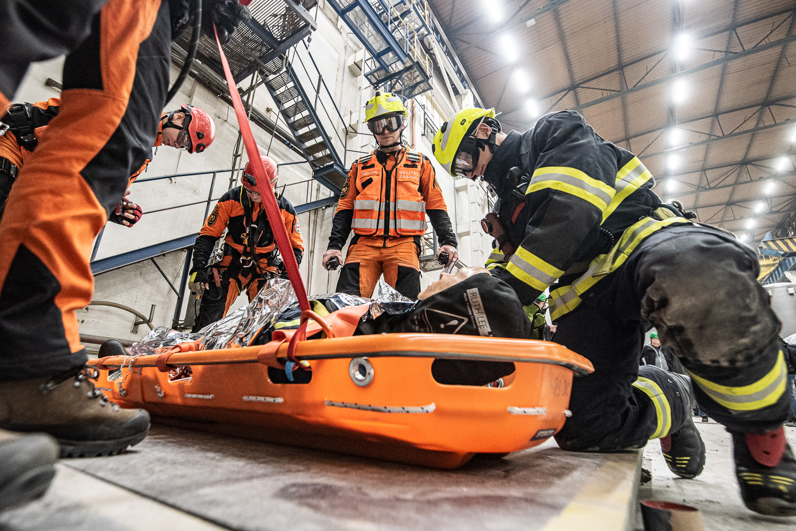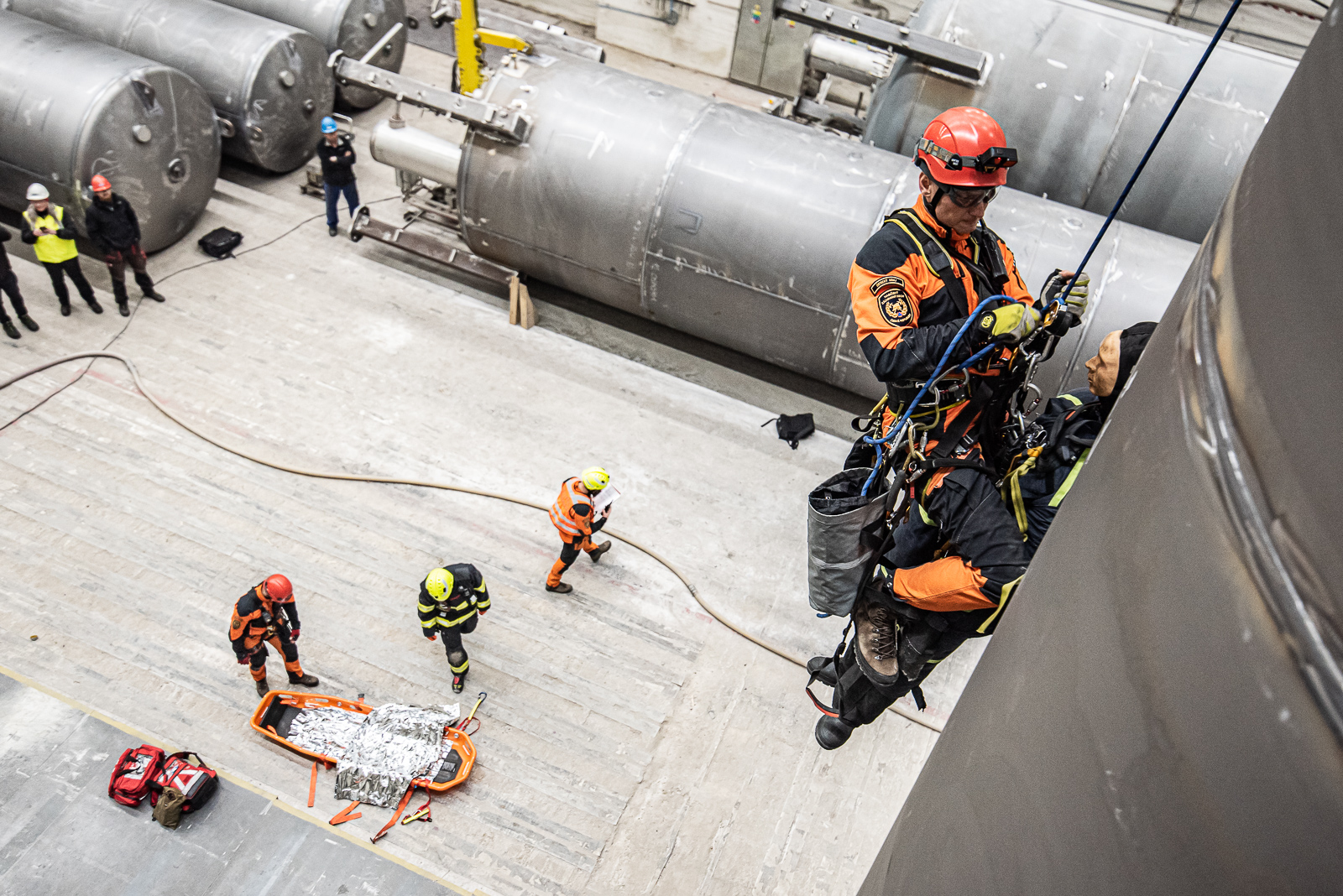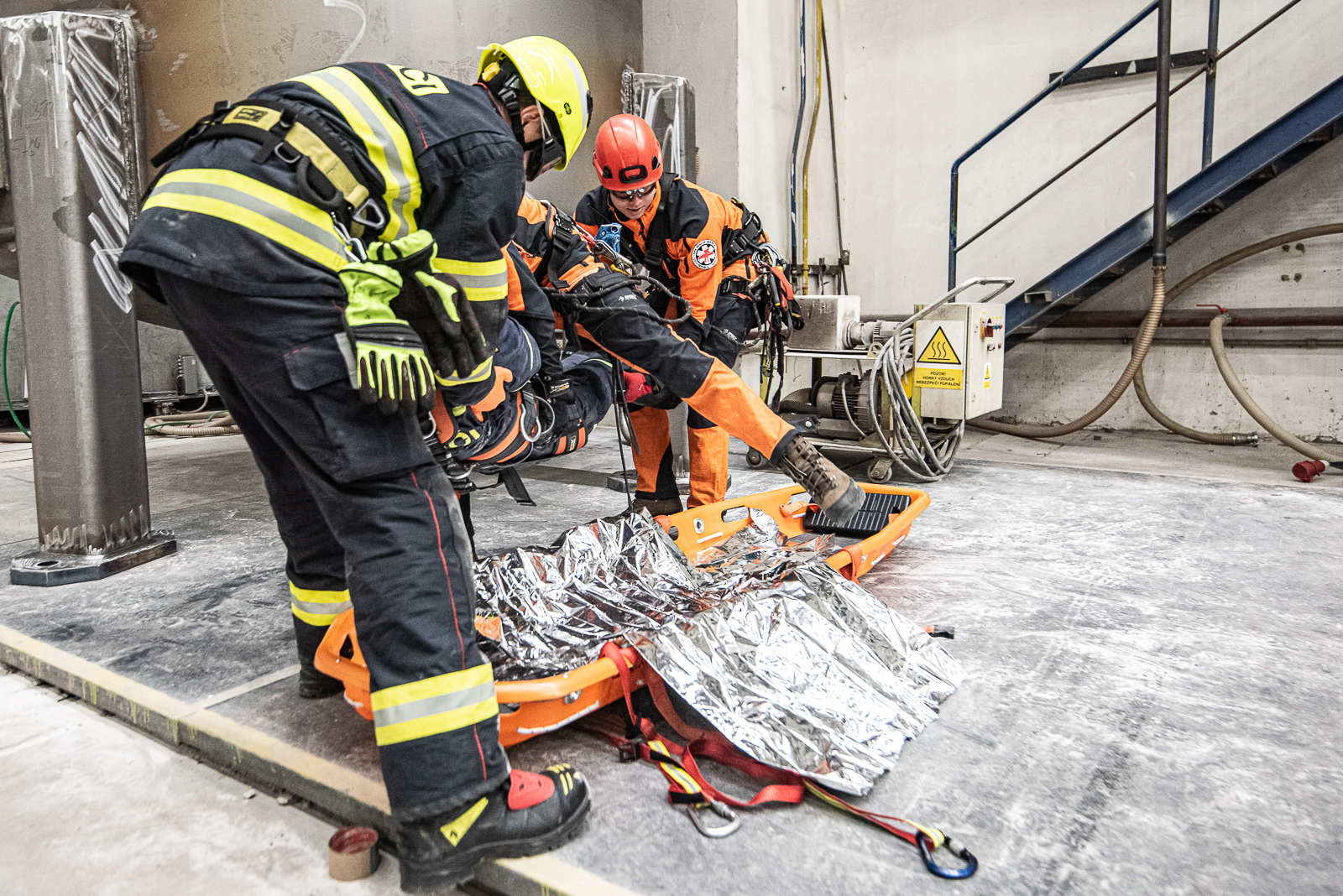Dva členové lezecké skupiny vytvořili kotevní bod a provedli bezpečnou záchranu osoby na zem k připraveným nosítkům, kde jí byla poskytnuta předlékařská pomoc s důrazem na možný vznik crush syndromu.Po uložení a zafixování do nosítek byla zraněná osoba transportována přes výrobní halu na určené místo k simulovanému ošetření zdravotnickou záchrannou službou.Po ukončení taktického cvičení provedl velitel stanice
