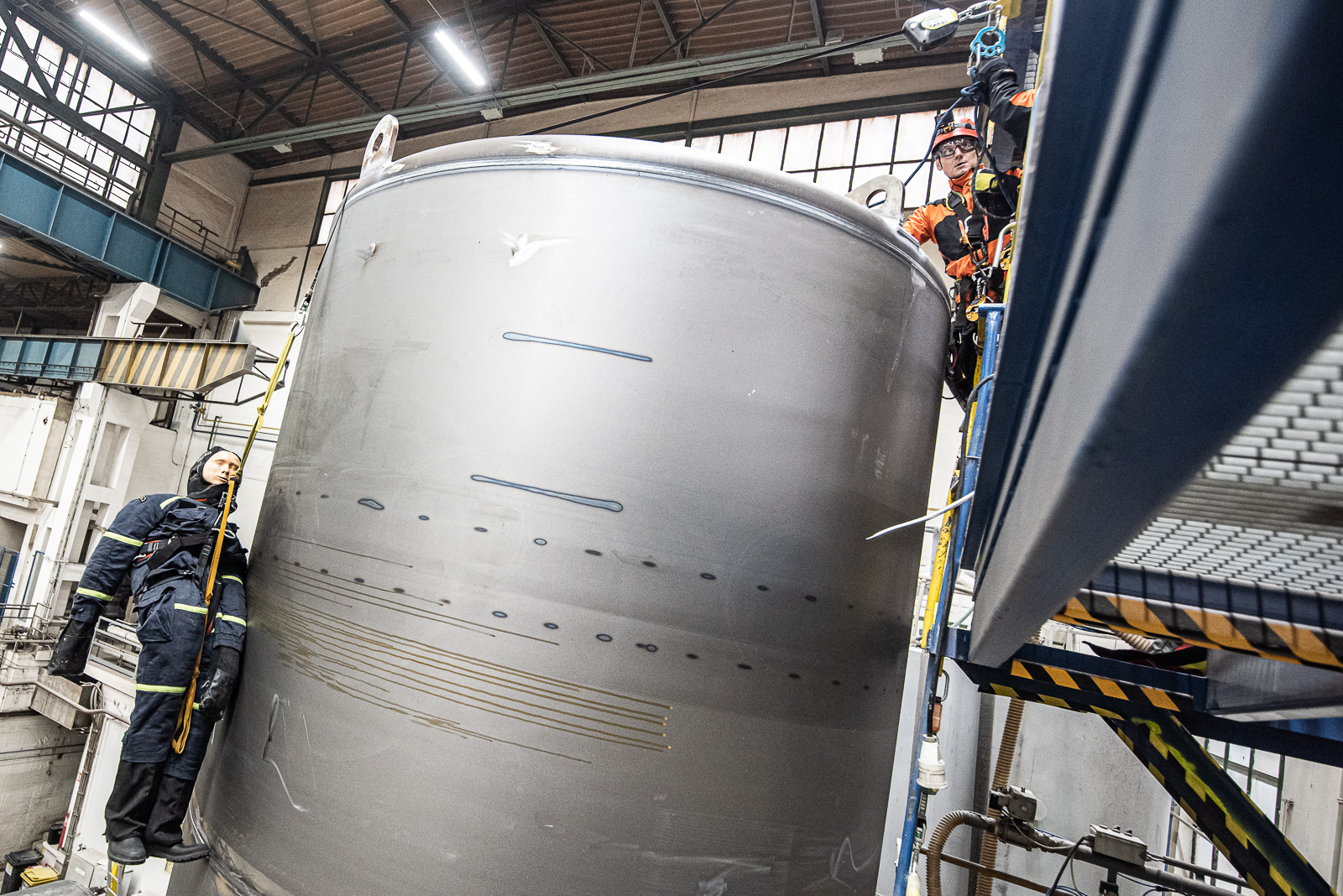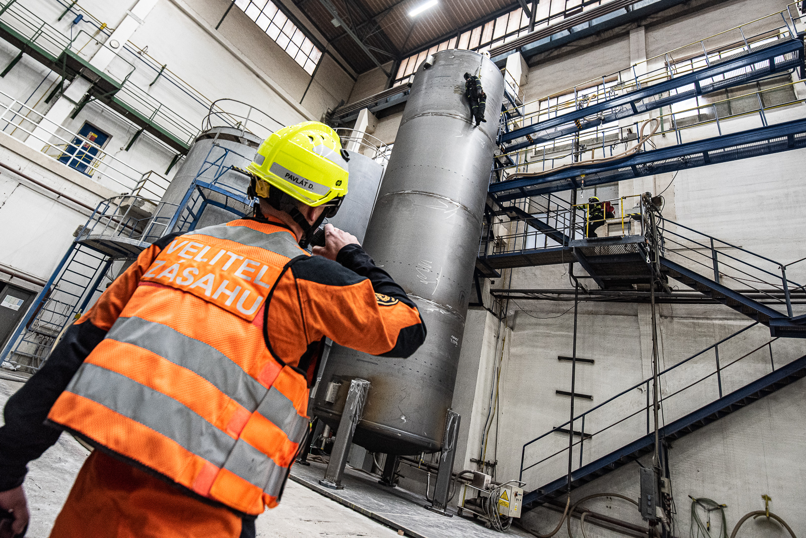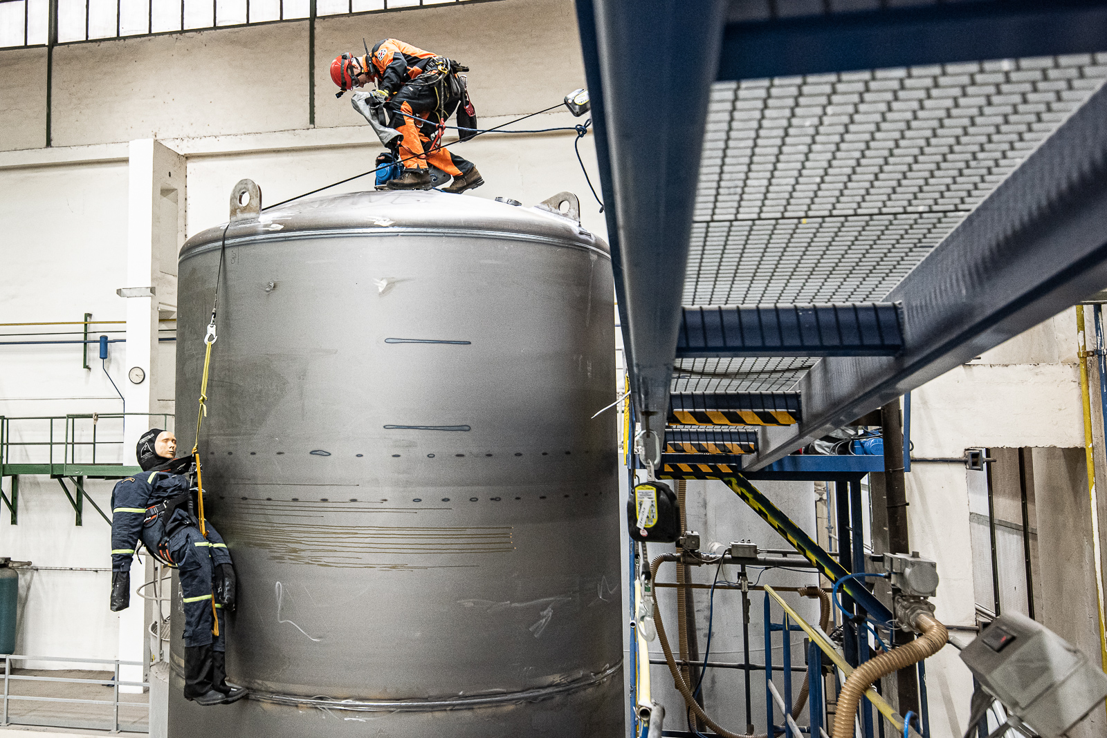 Pracovník provádějící plnění velkokapacitní nádrže otvorem umístěným ve vrchní části uklouzl a spadl přes okraj nádrže. Díky zádržnému systému zůstal zachycen v postroji – bohužel, ale v takové výšce, že nebyl schopen se svépomocí dostat bezpečně na zem.Prvotním průzkumem hasiči zjistili, že zaměstnanec je v bezprostředním ohrožení života.