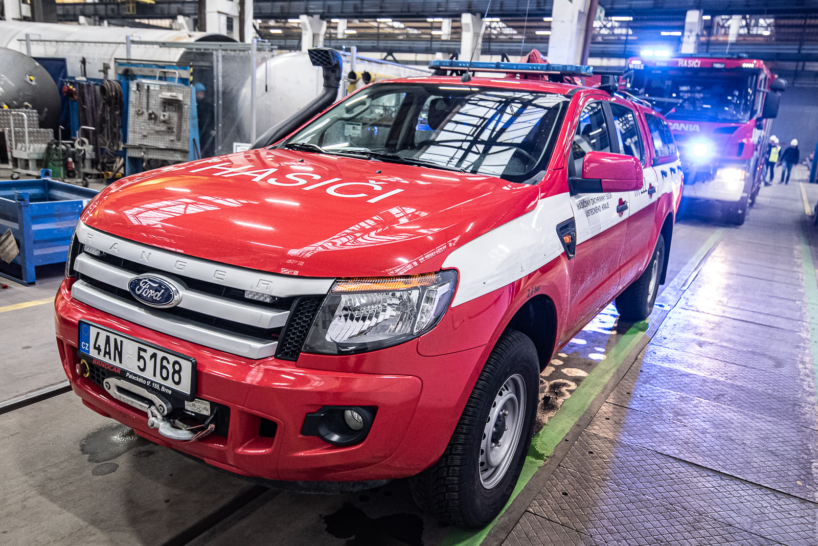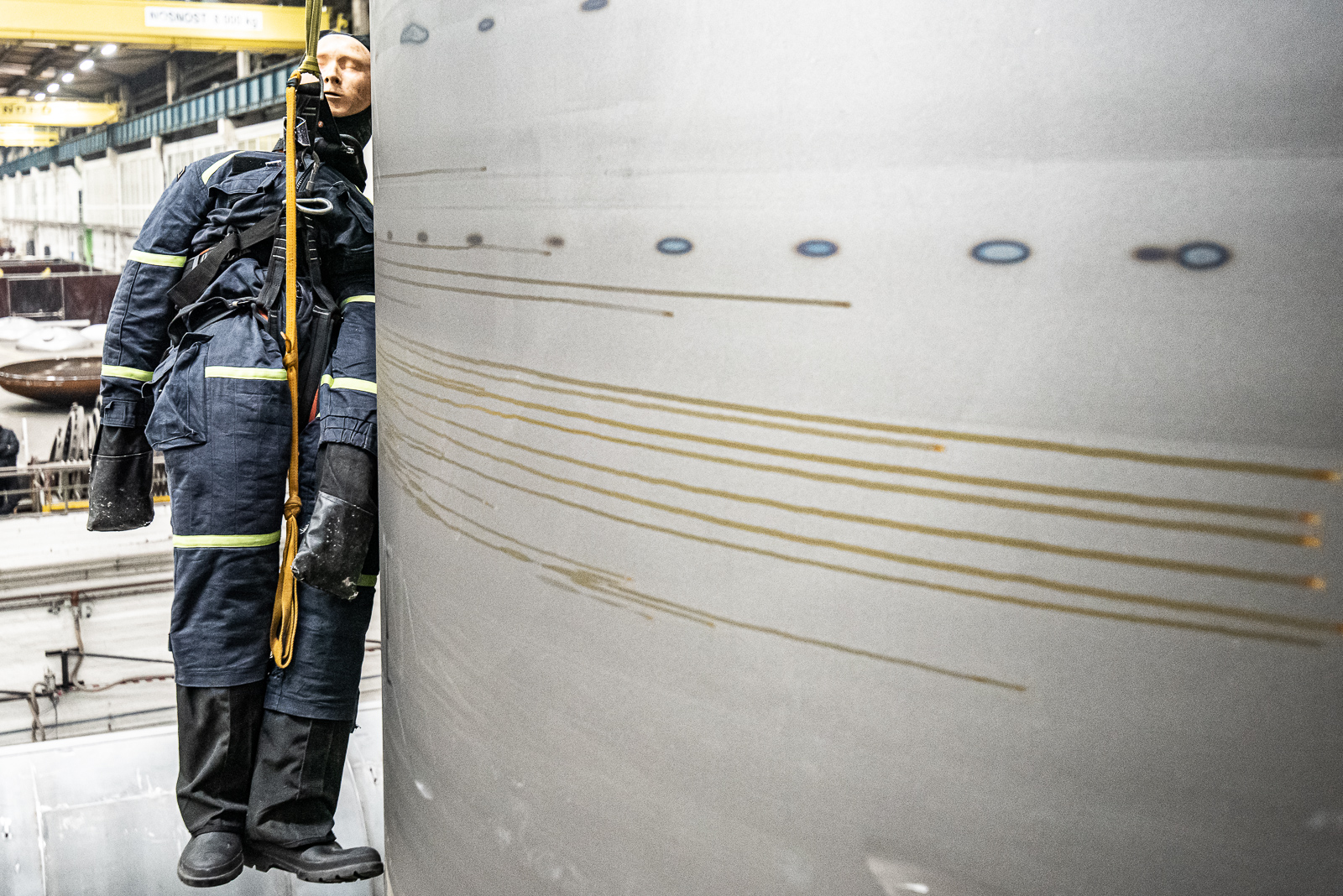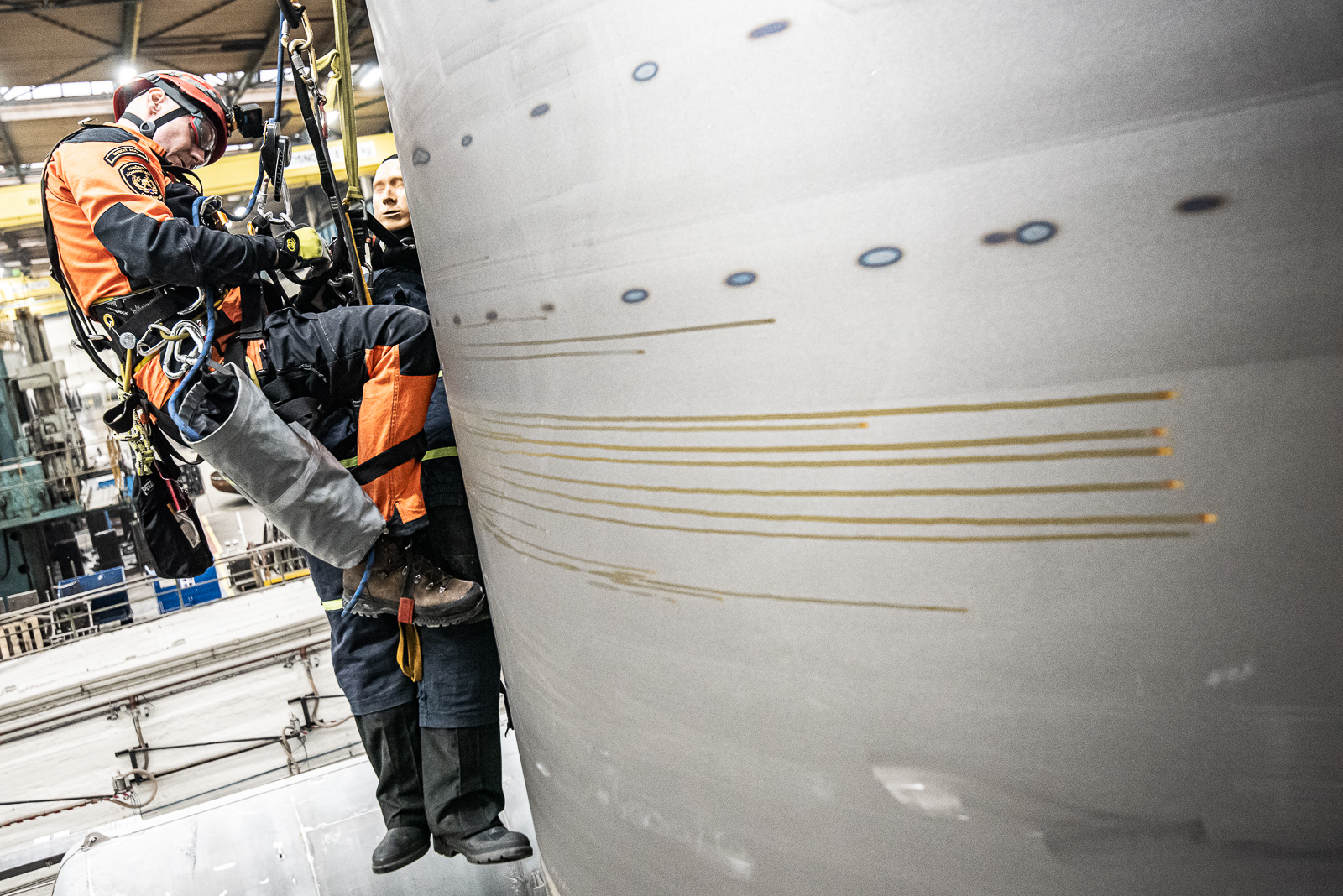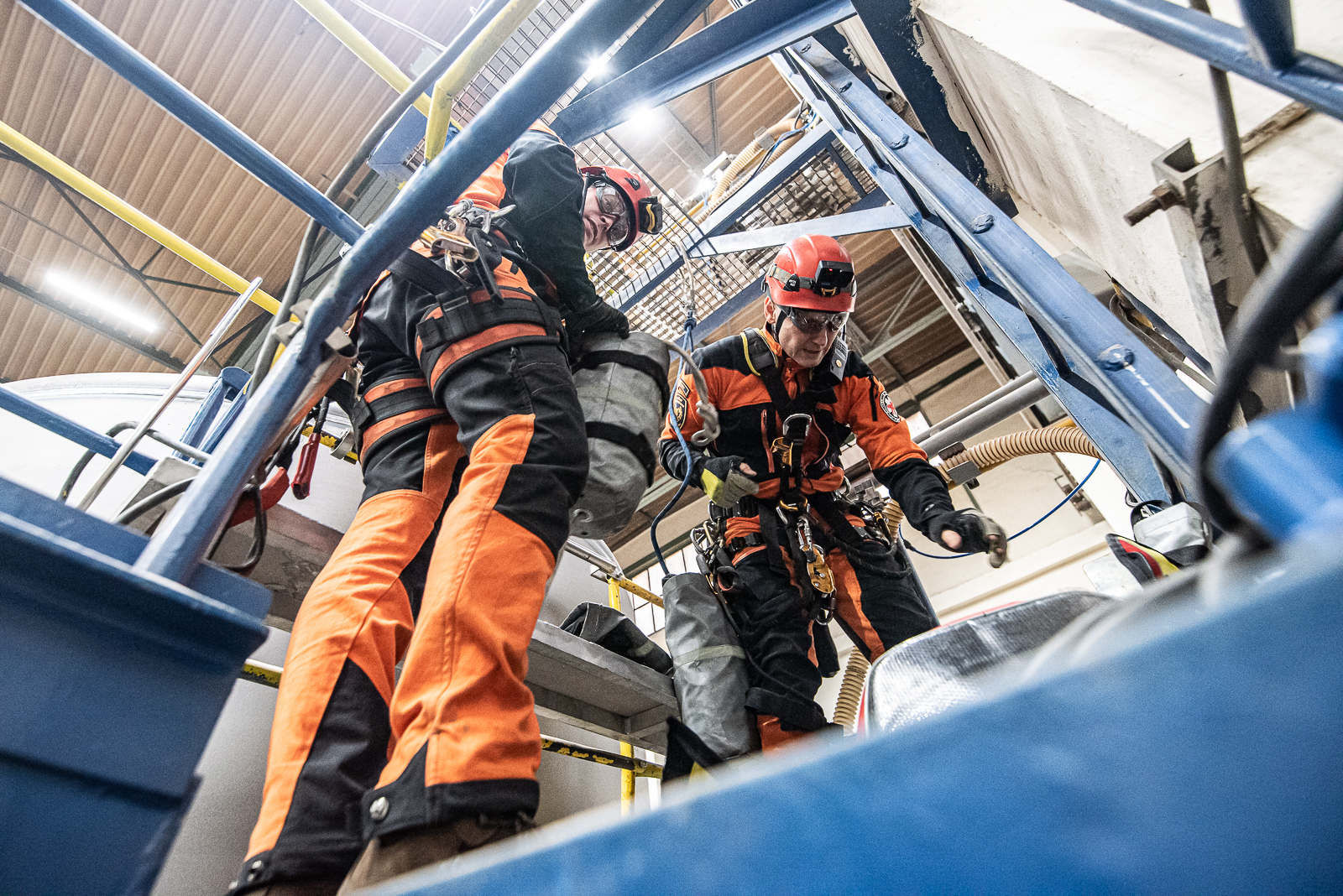 Pracovník provádějící plnění velkokapacitní nádrže otvorem umístěným ve vrchní části uklouzl a spadl přes okraj nádrže. Díky zádržnému systému zůstal zachycen v postroji – bohužel, ale v takové výšce, že nebyl schopen se svépomocí dostat bezpečně na zem.Prvotním průzkumem hasiči zjistili, že zaměstnanec je v bezprostředním ohrožení života.