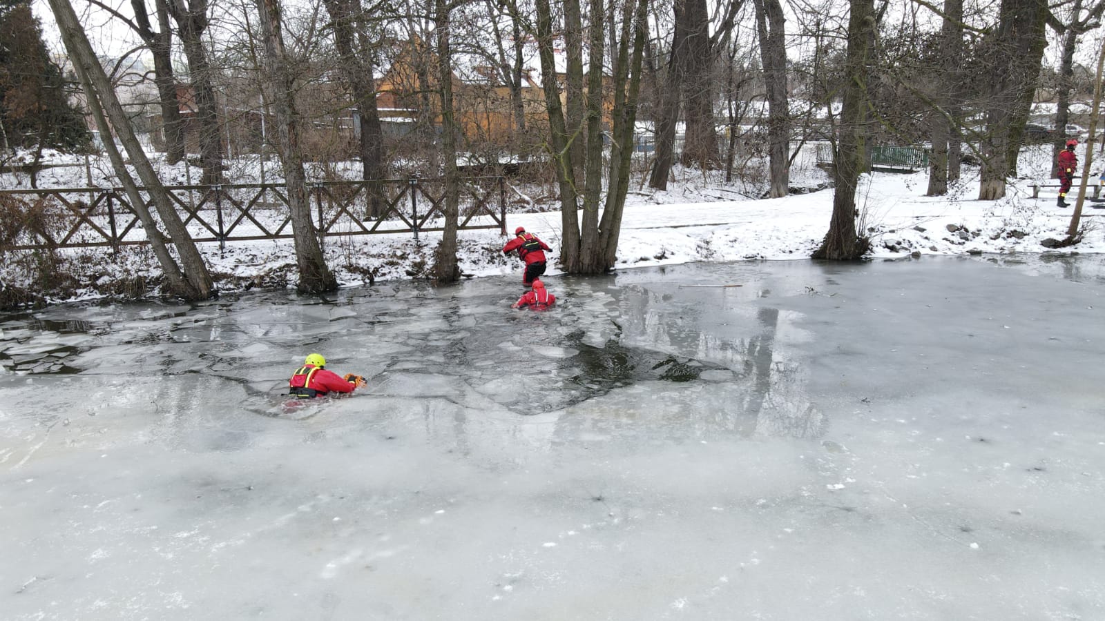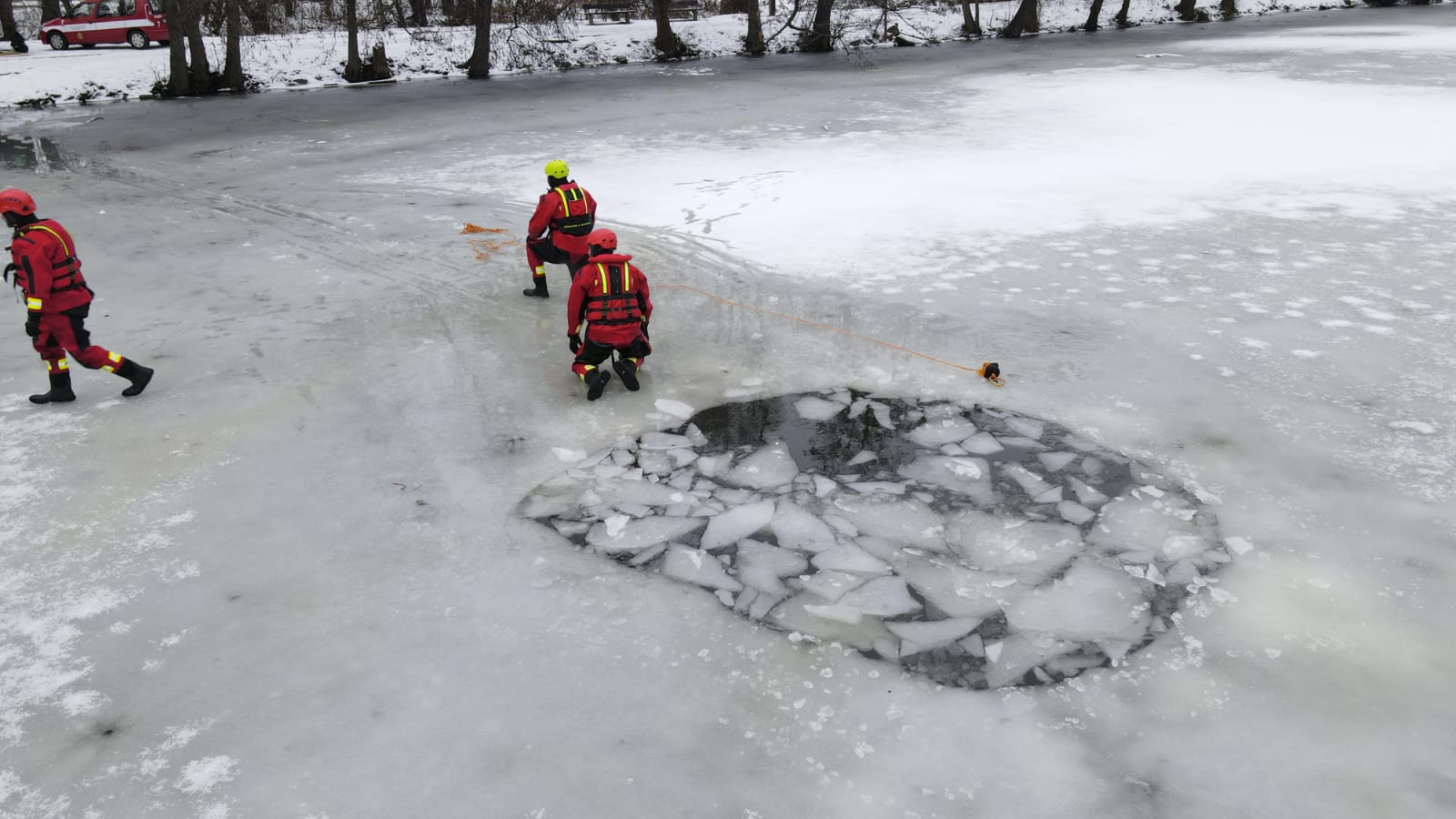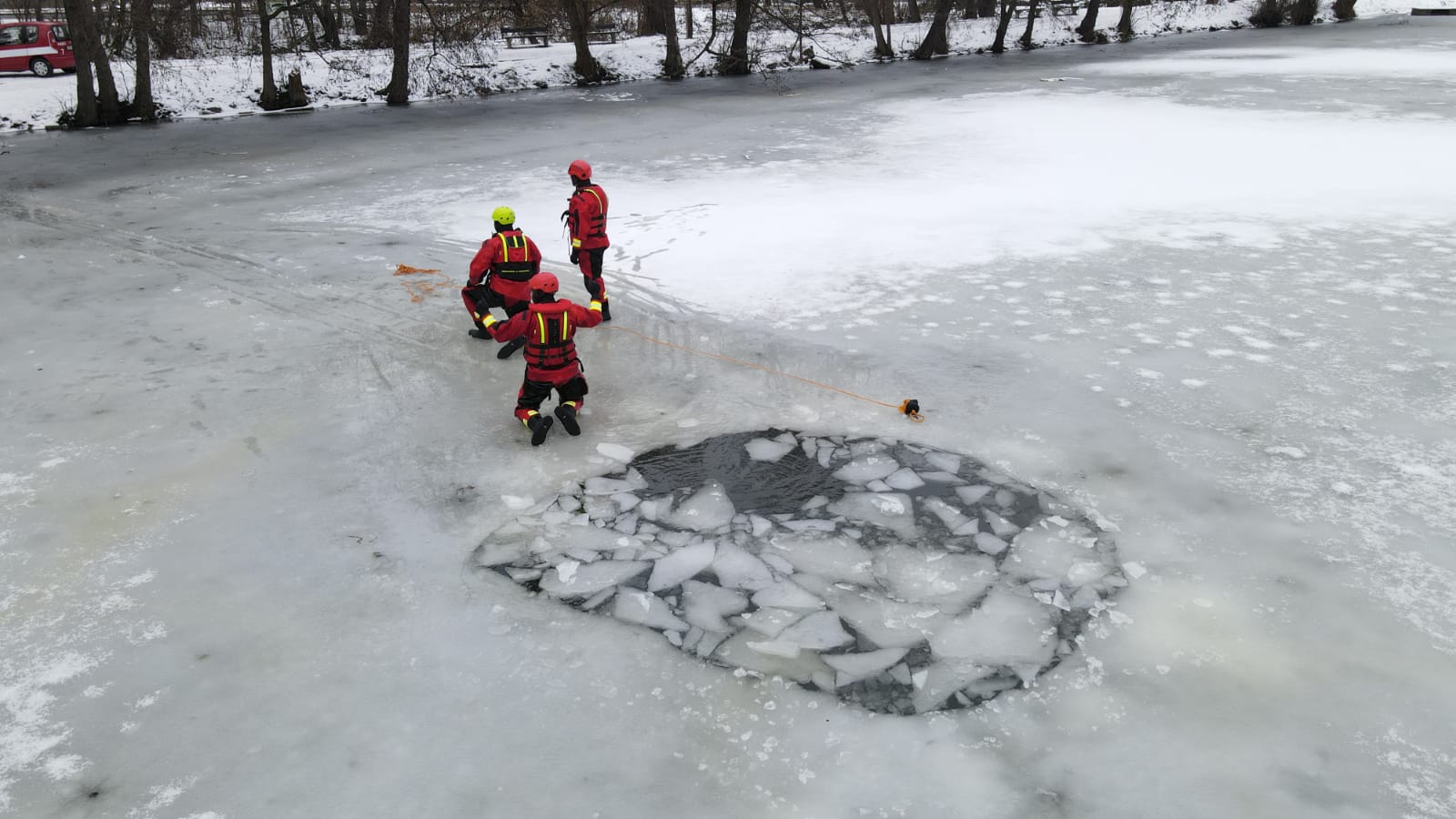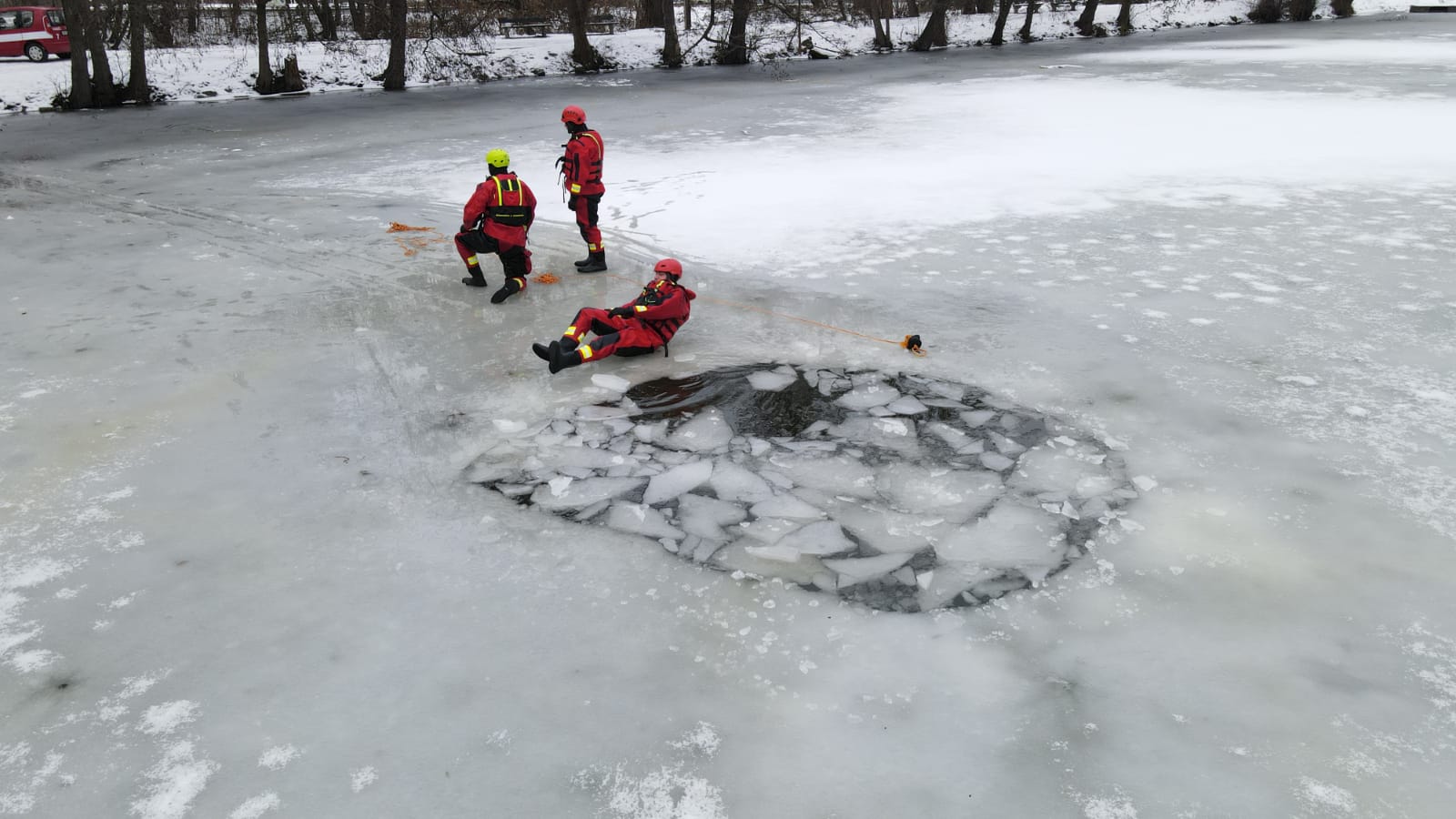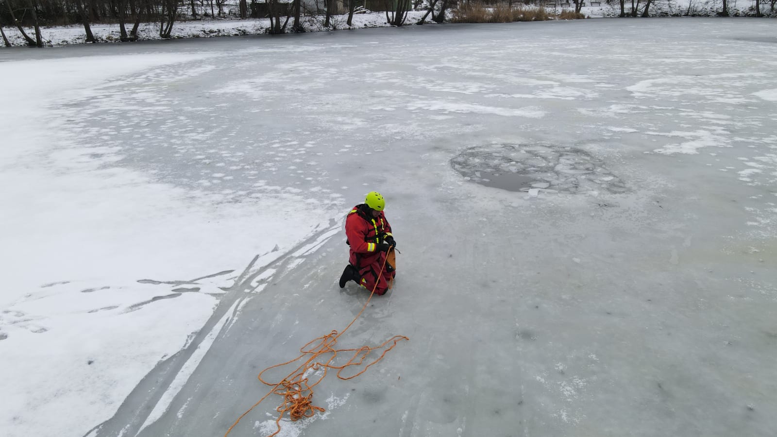 V případě potřeby záchrany osoby z vody se vždy volají na místo hasiči. A klimatické podmínky byly v posledních dnech natolik příznivé, že bylo možné si procvičit sebezáchranu a záchranu osob pomocí různých pomůcek ze zamrzlé vodní hladiny.