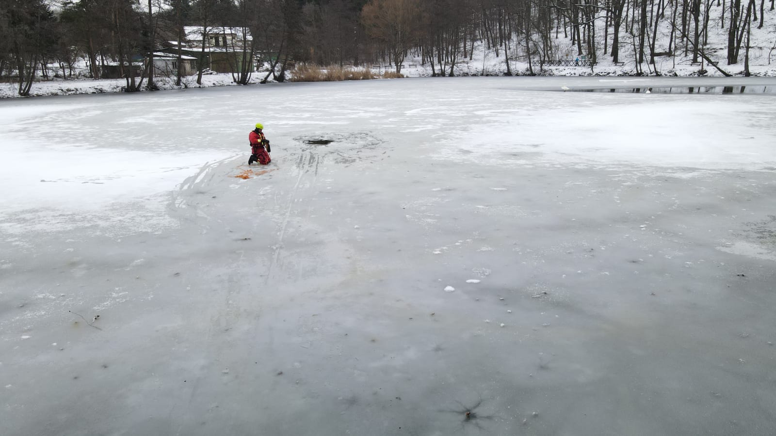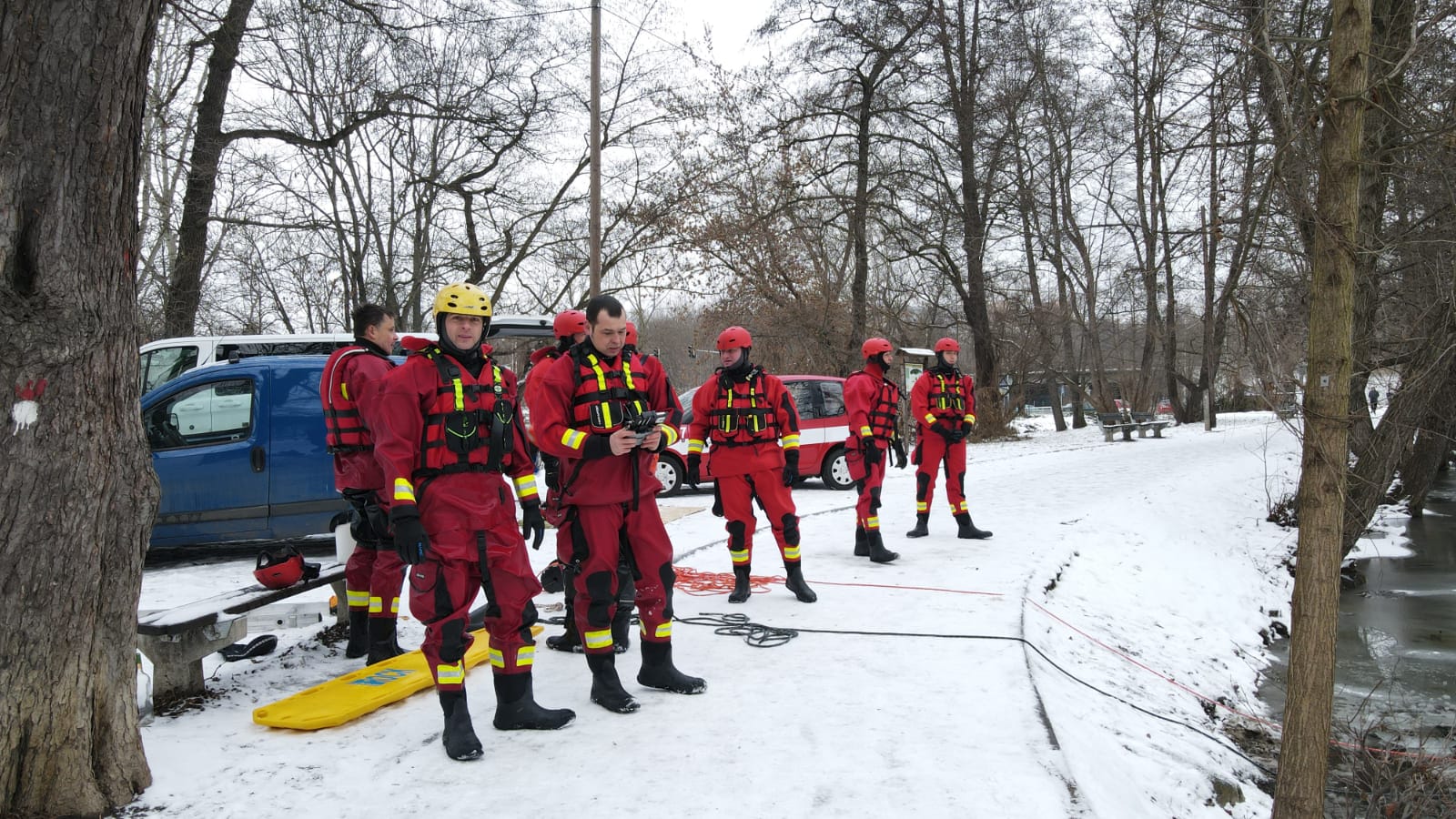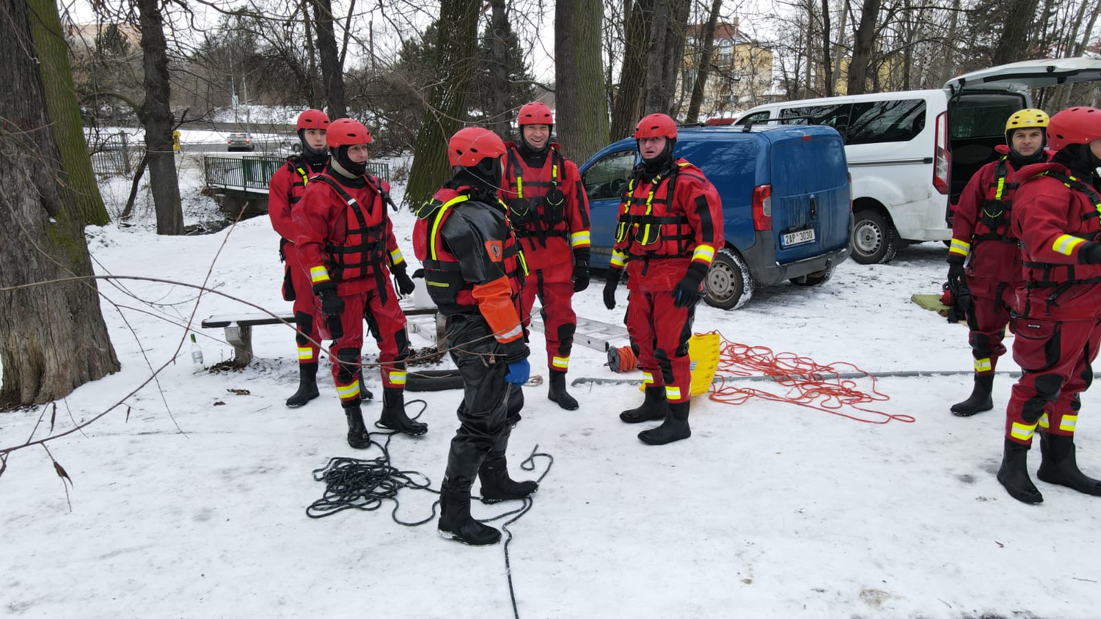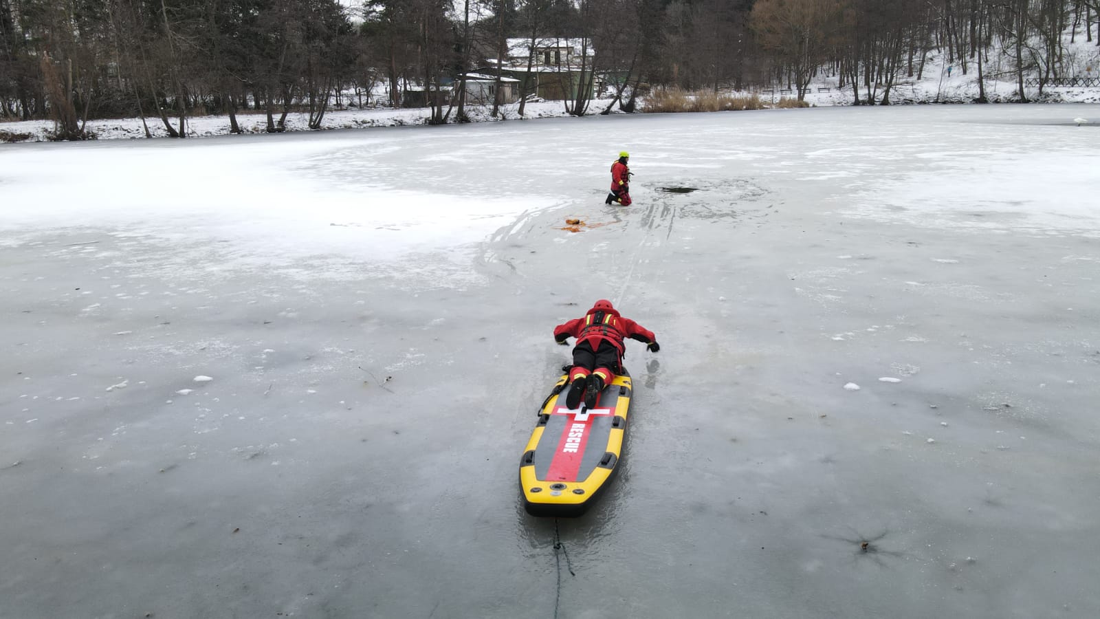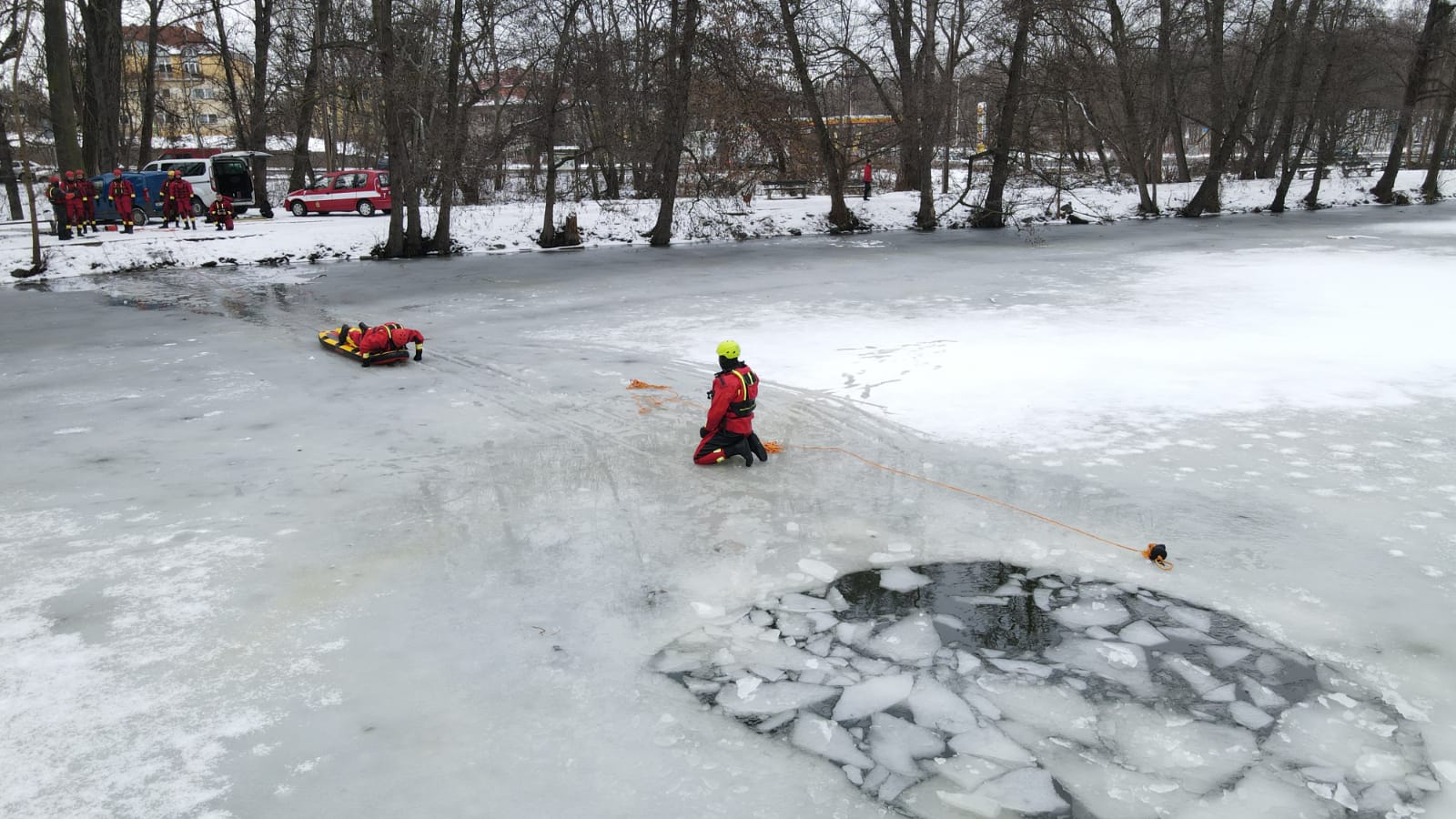 V případě potřeby záchrany osoby z vody se vždy volají na místo hasiči. A klimatické podmínky byly v posledních dnech natolik příznivé, že bylo možné si procvičit sebezáchranu a záchranu osob pomocí různých pomůcek ze zamrzlé vodní hladiny.