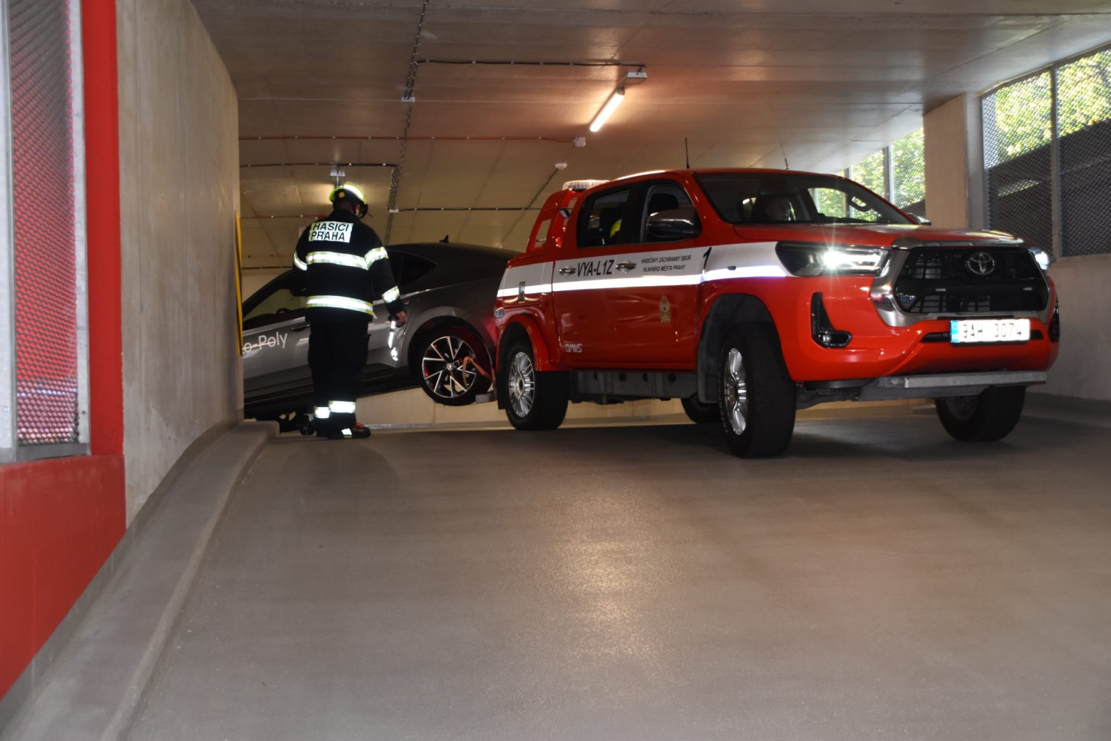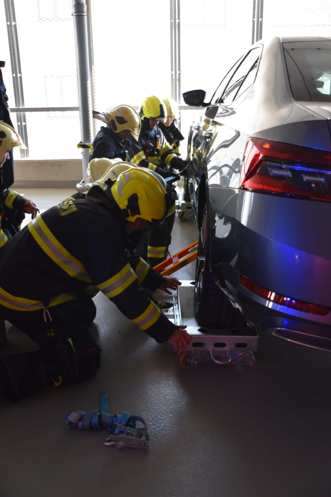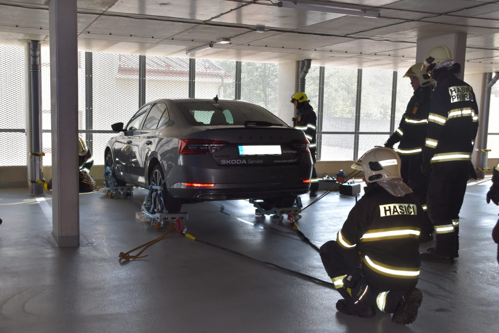 Po uhašení požáru, kontrole teploty baterie termokamerou a odvětrání kouře jednotky přesunuly automobil ven z budovy pomocí speciálních vozíčků pro nouzový odtah vozidel, které má příbramská stanice ve výbavě od letošního jara. Ke cvičení byli přizváni kolegové z HZS hlavního města Prahy, kteří přijeli se speciálním vyprošťovacím automobilem a předvedli možnosti jeho využití pro transport vozidel z nadzemního nebo podzemního podlaží parkovacího domu.