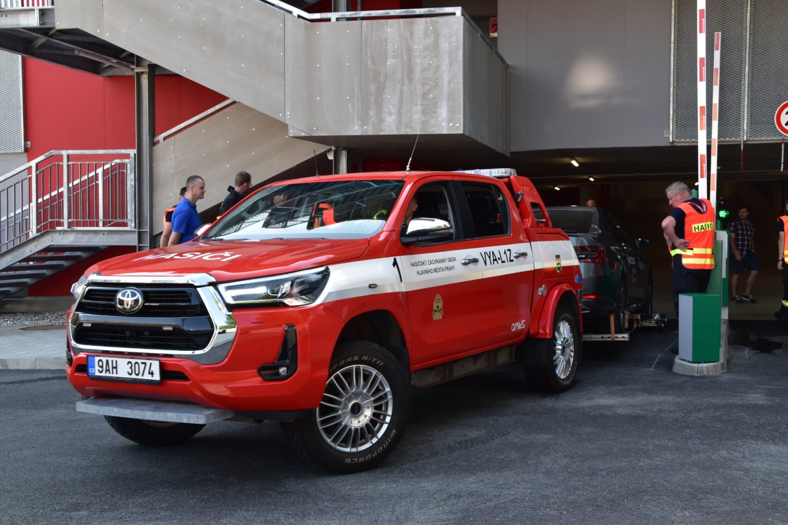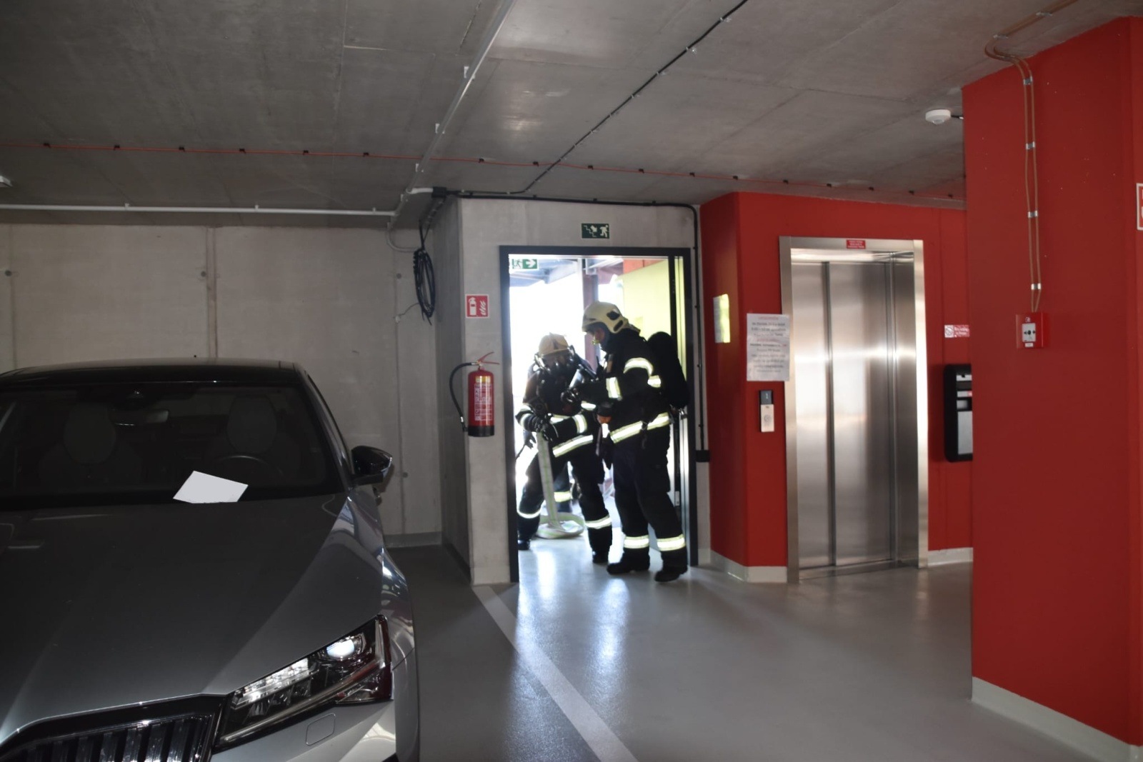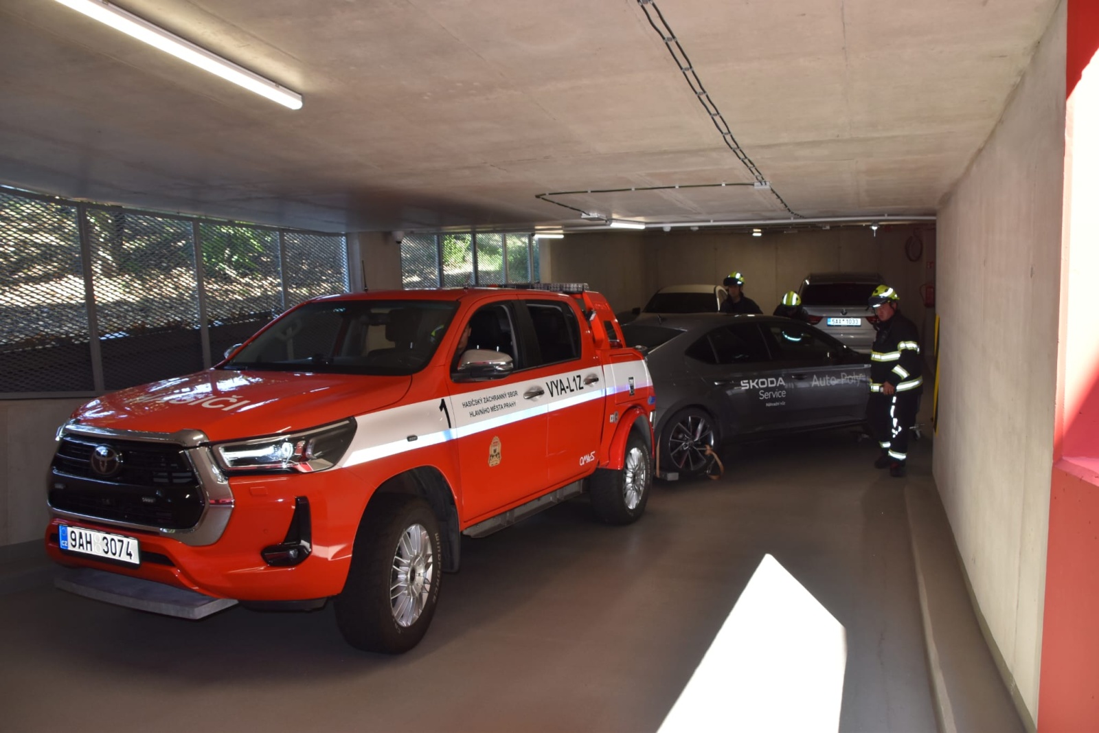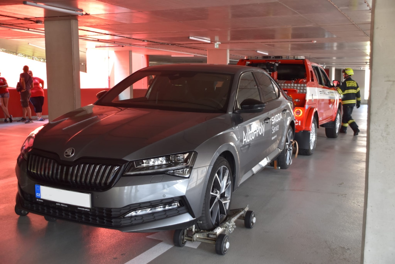 Po uhašení požáru, kontrole teploty baterie termokamerou a odvětrání kouře jednotky přesunuly automobil ven z budovy pomocí speciálních vozíčků pro nouzový odtah vozidel, které má příbramská stanice ve výbavě od letošního jara. Ke cvičení byli přizváni kolegové z HZS hlavního města Prahy, kteří přijeli se speciálním vyprošťovacím automobilem a předvedli možnosti jeho využití pro transport vozidel z nadzemního nebo podzemního podlaží parkovacího domu.