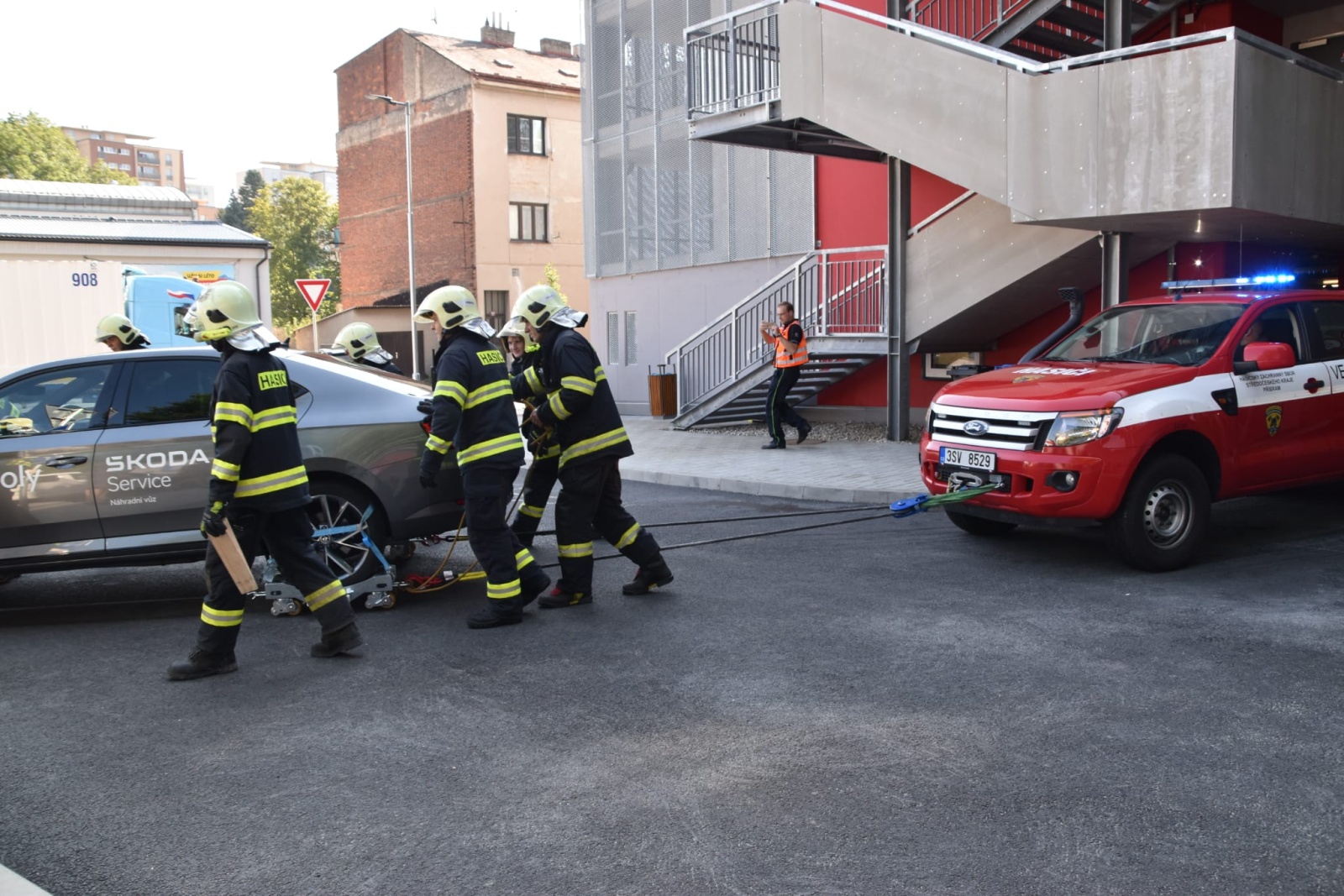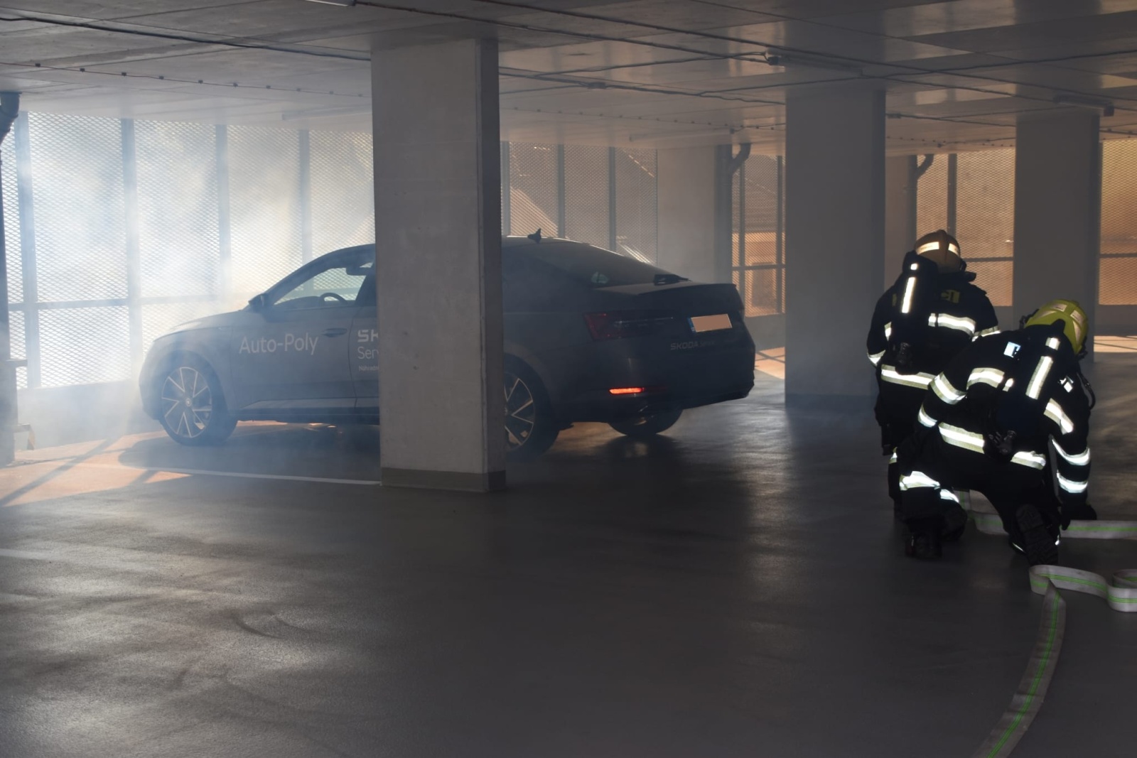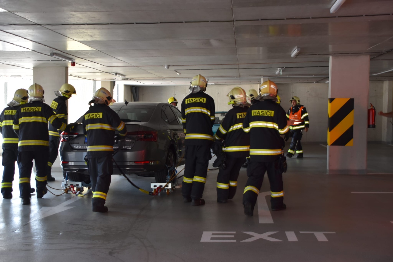 Požár byl simulován pomocí výrobníku mlhy. Po příjezdu na místo hasiči vytvořili s využitím suchovodu instalovaného na budově až k „hořícímu“ vozidlu útočné vedení hadicemi, které bylo vzápětí doplněno o speciální hasicí a řezací zařízení Cobra, pomocí něhož lze proniknout vodním paprskem s příměsí abraziva do vnitřku baterie a ochladit ji.