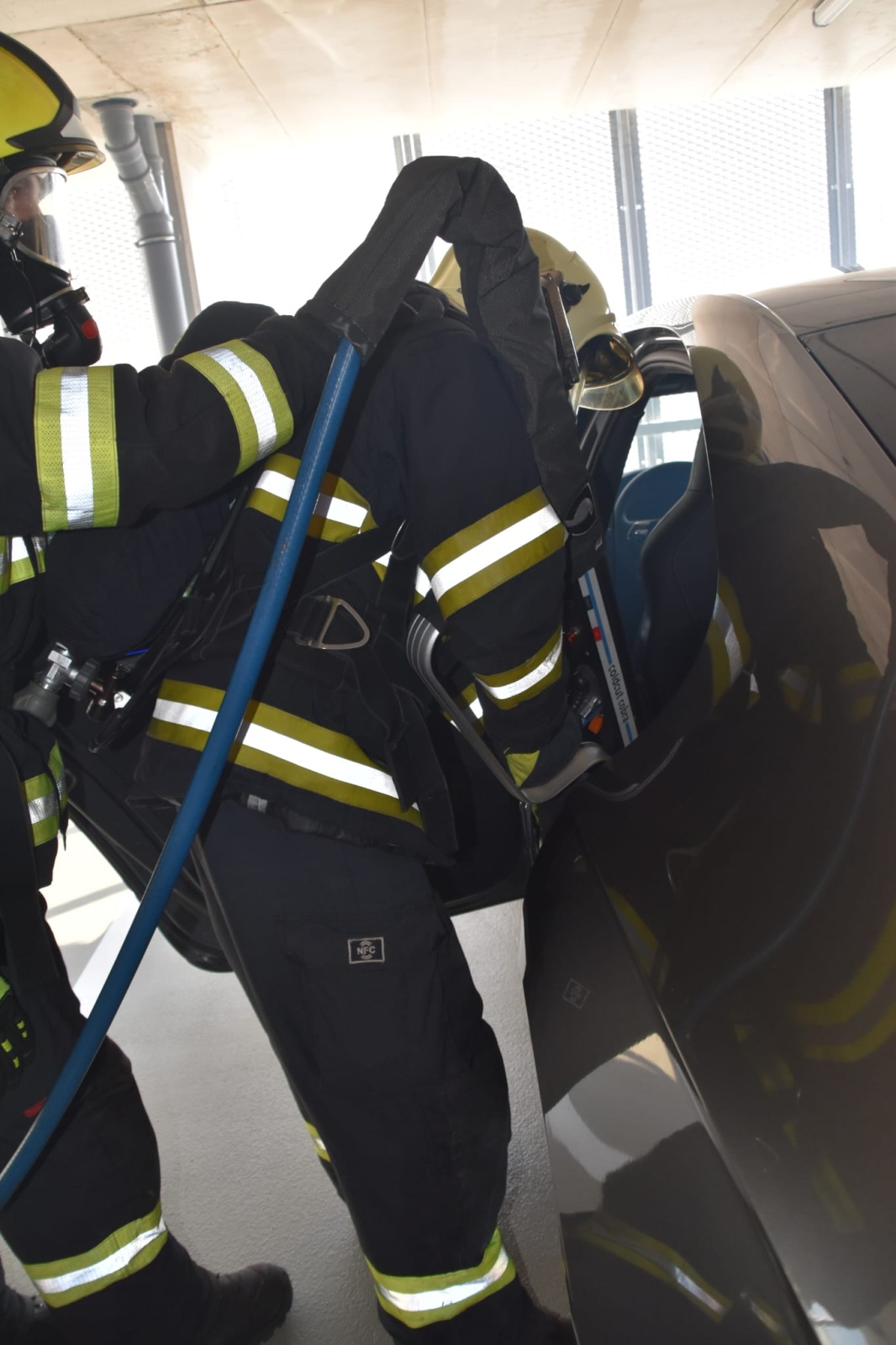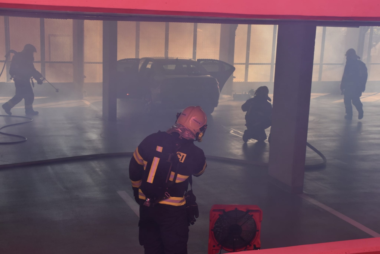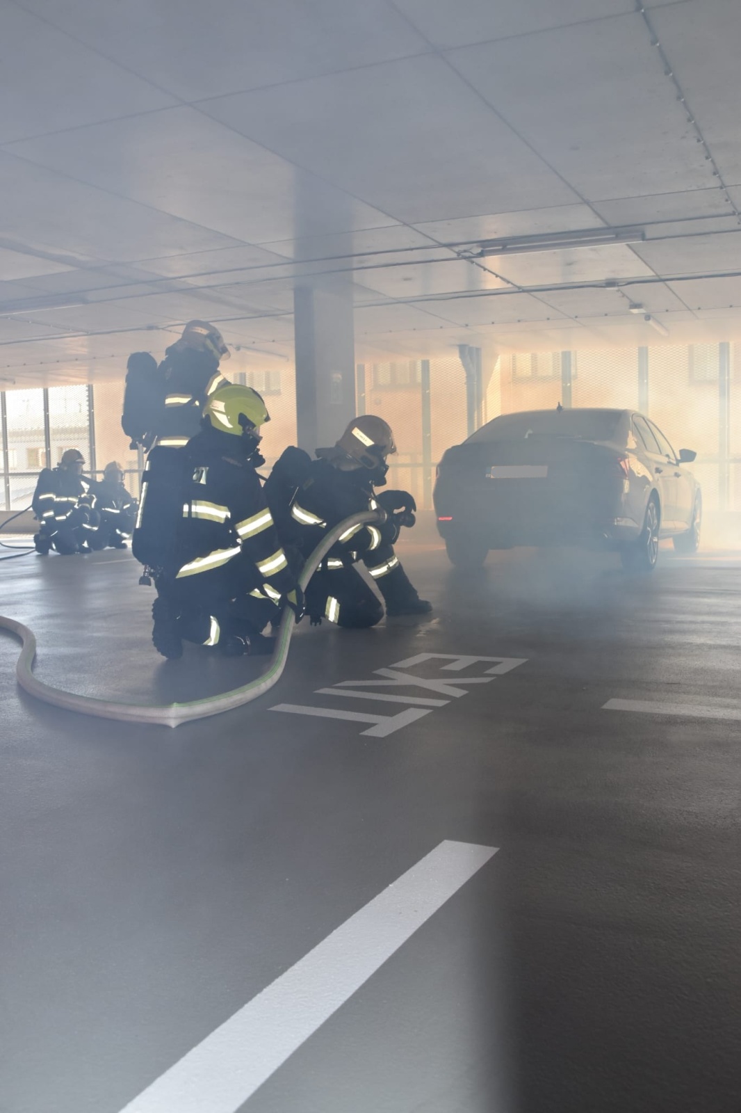 Požár byl simulován pomocí výrobníku mlhy. Po příjezdu na místo hasiči vytvořili s využitím suchovodu instalovaného na budově až k „hořícímu“ vozidlu útočné vedení hadicemi, které bylo vzápětí doplněno o speciální hasicí a řezací zařízení Cobra, pomocí něhož lze proniknout vodním paprskem s příměsí abraziva do vnitřku baterie a ochladit ji.