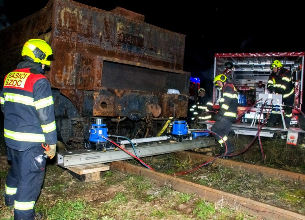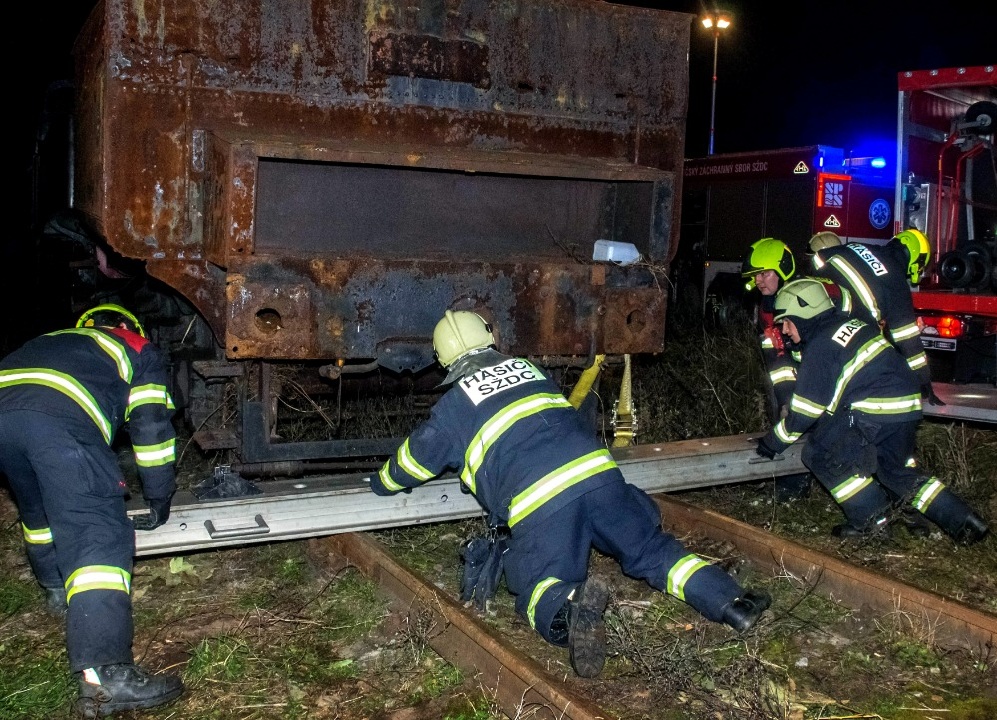Poslední částí cvičení, bylo zpětné nakolejení vykolejeného tendru. Tohoto úkolu se ujala jednotka SŽDC, která si po svém příjezdu na místo zásahu převzala velení.