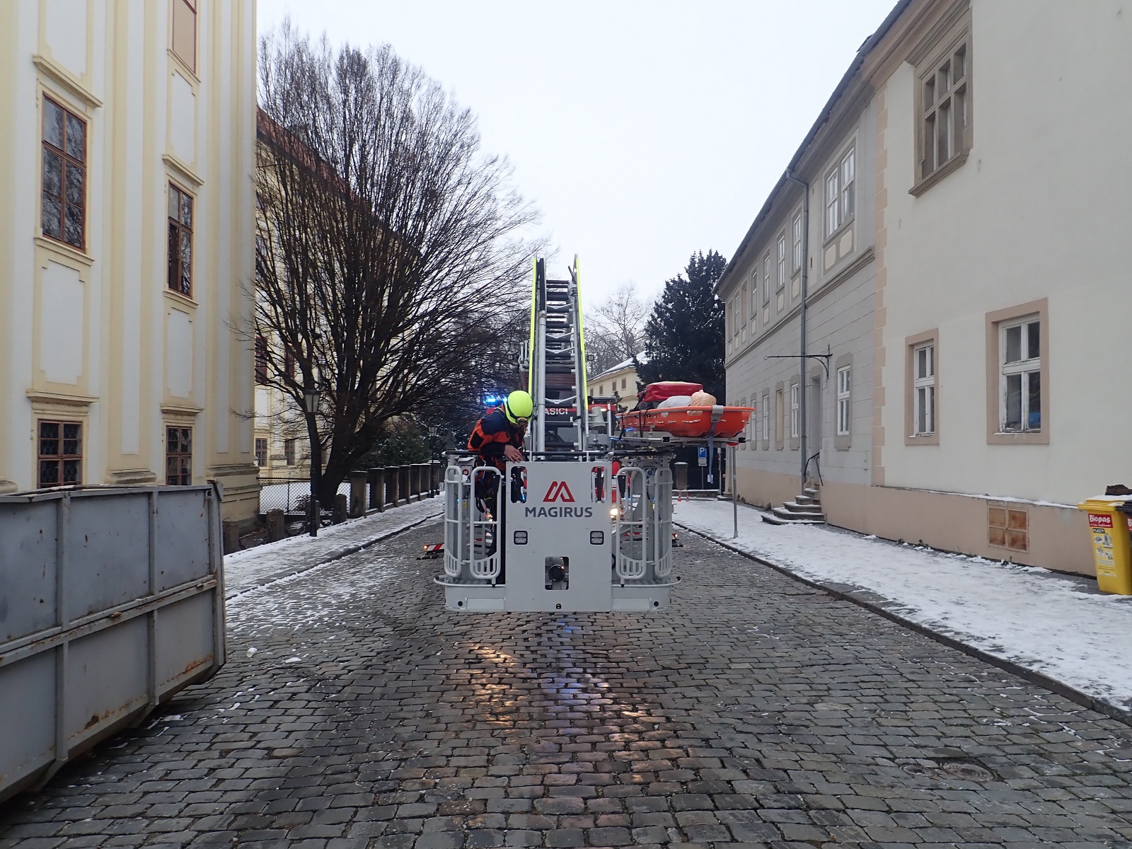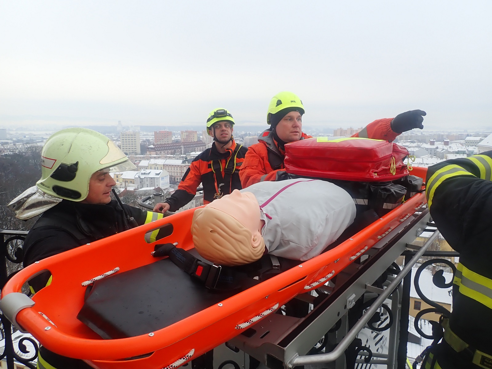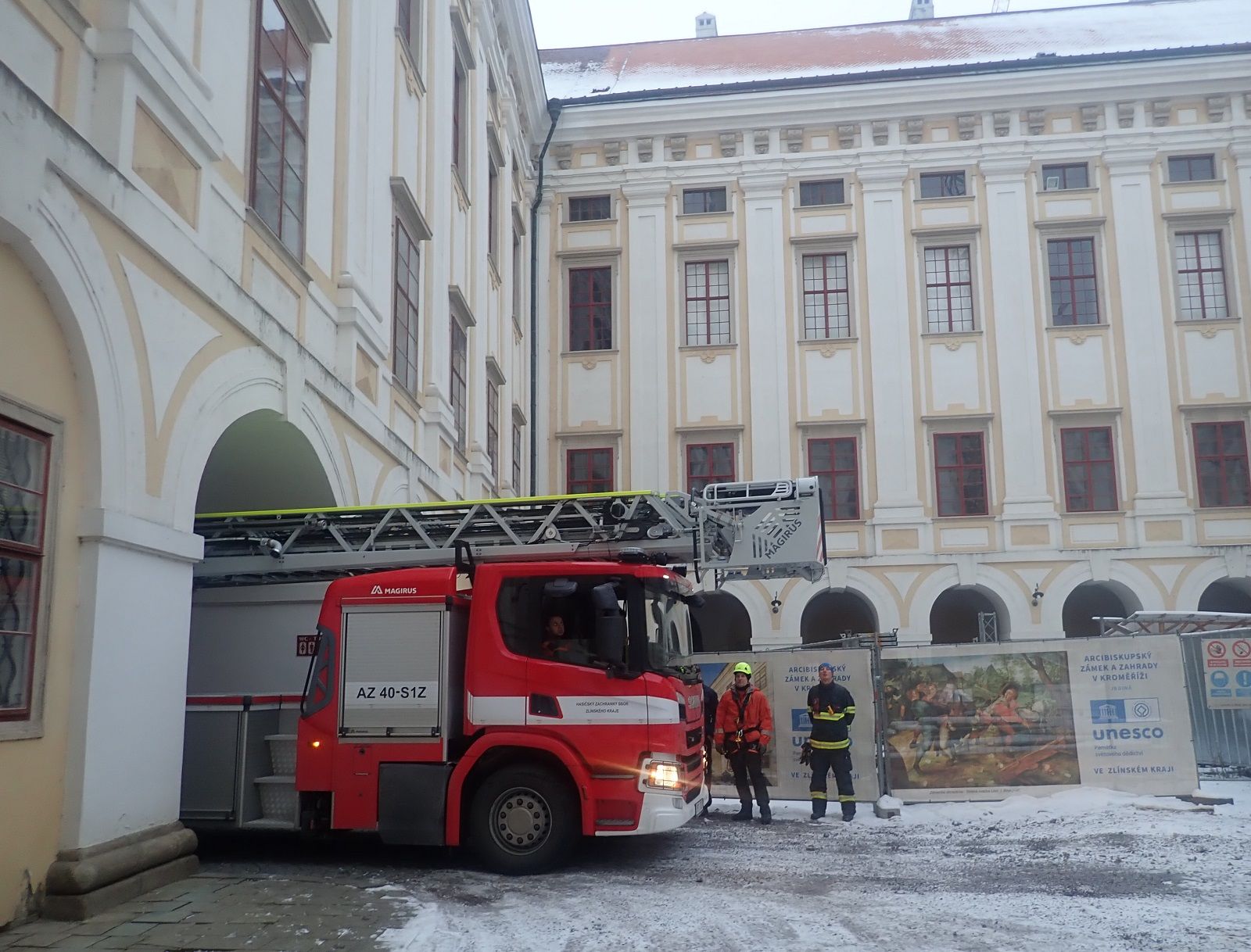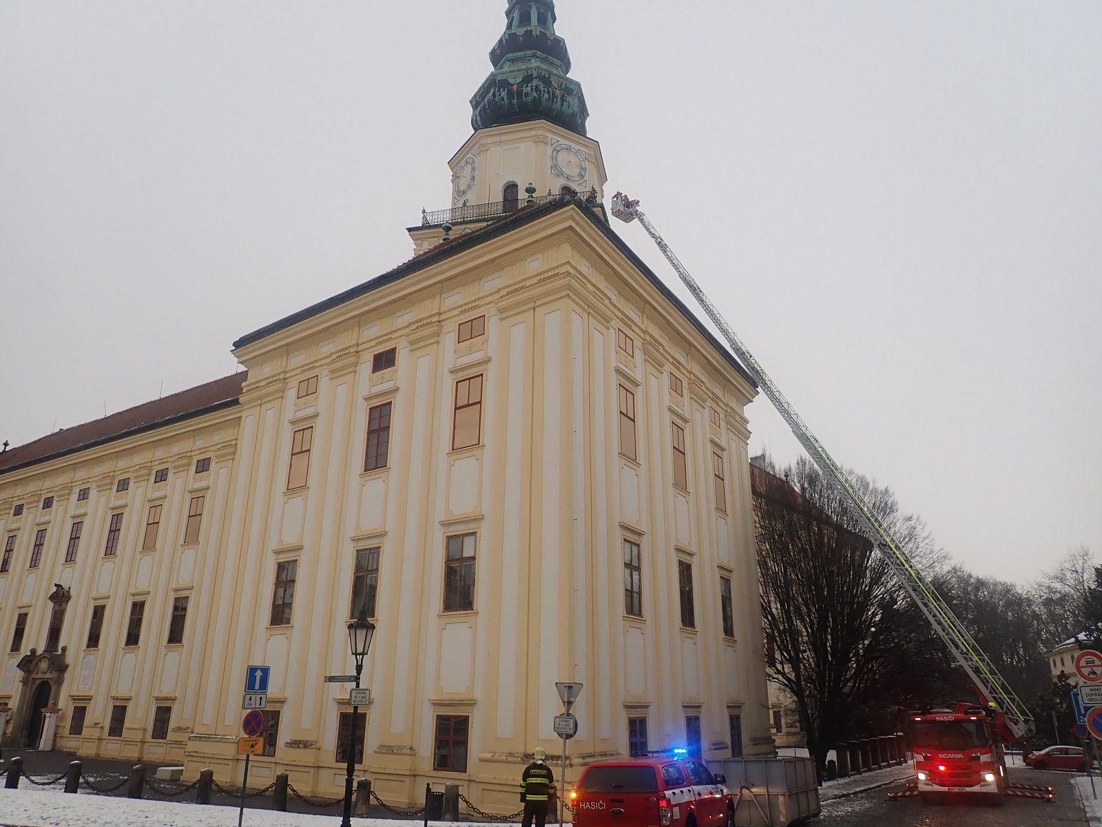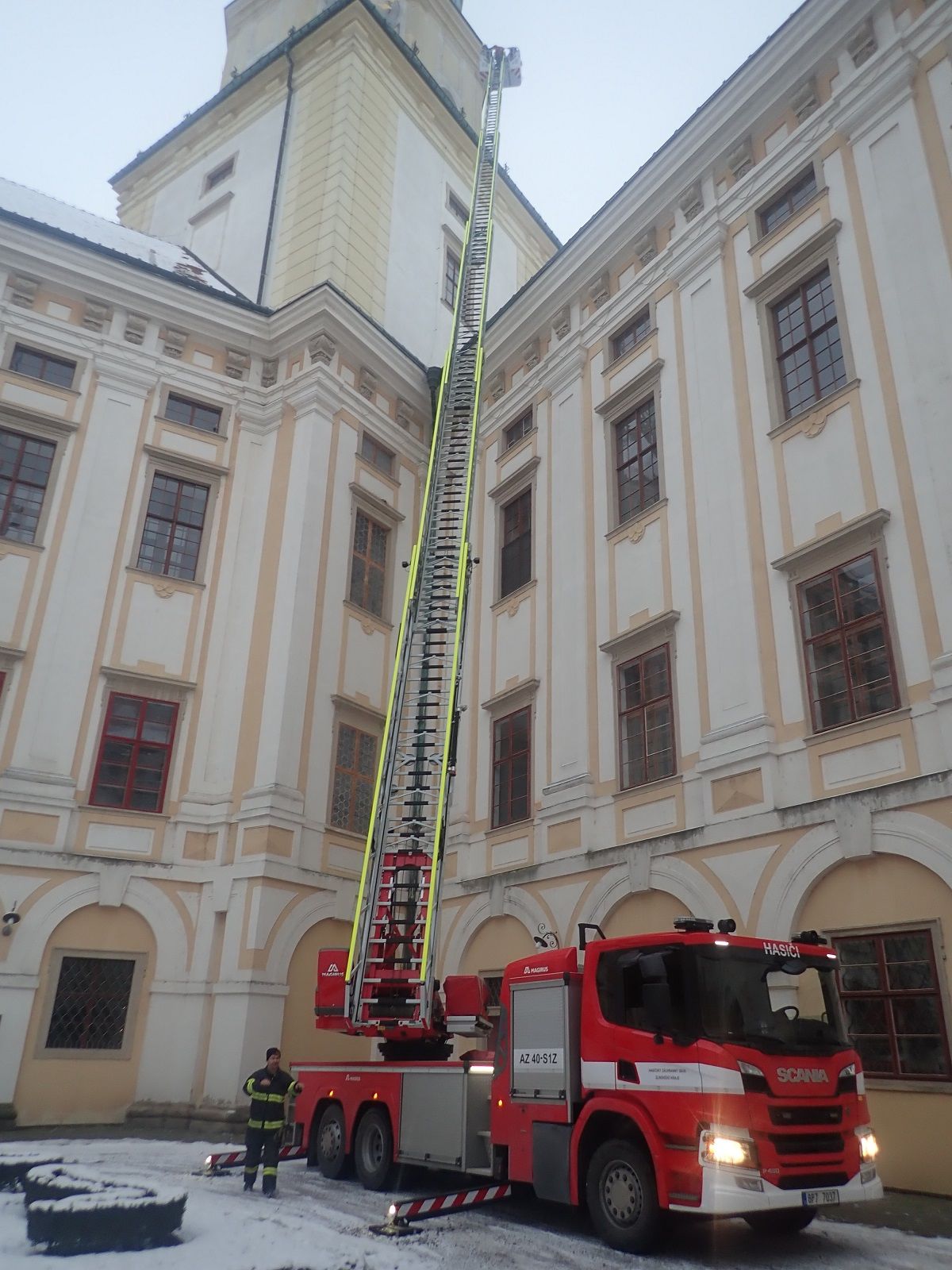 (14. 12. 2022) Dnes v odpoledních hodinách byla na věži arcibiskupského zámku v Kroměříži v rámci cvičení prověřena akceschopnost jednotky HZS Zlínského kraje stanice Kroměříž při záchraně osoby z výšky 40 metrů a také prověření zásahu na památkově chráněném objektu za dodržení všech doporučovaných postupů a metodik při tomto typu události.