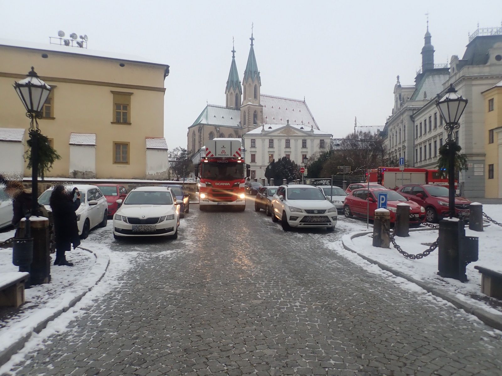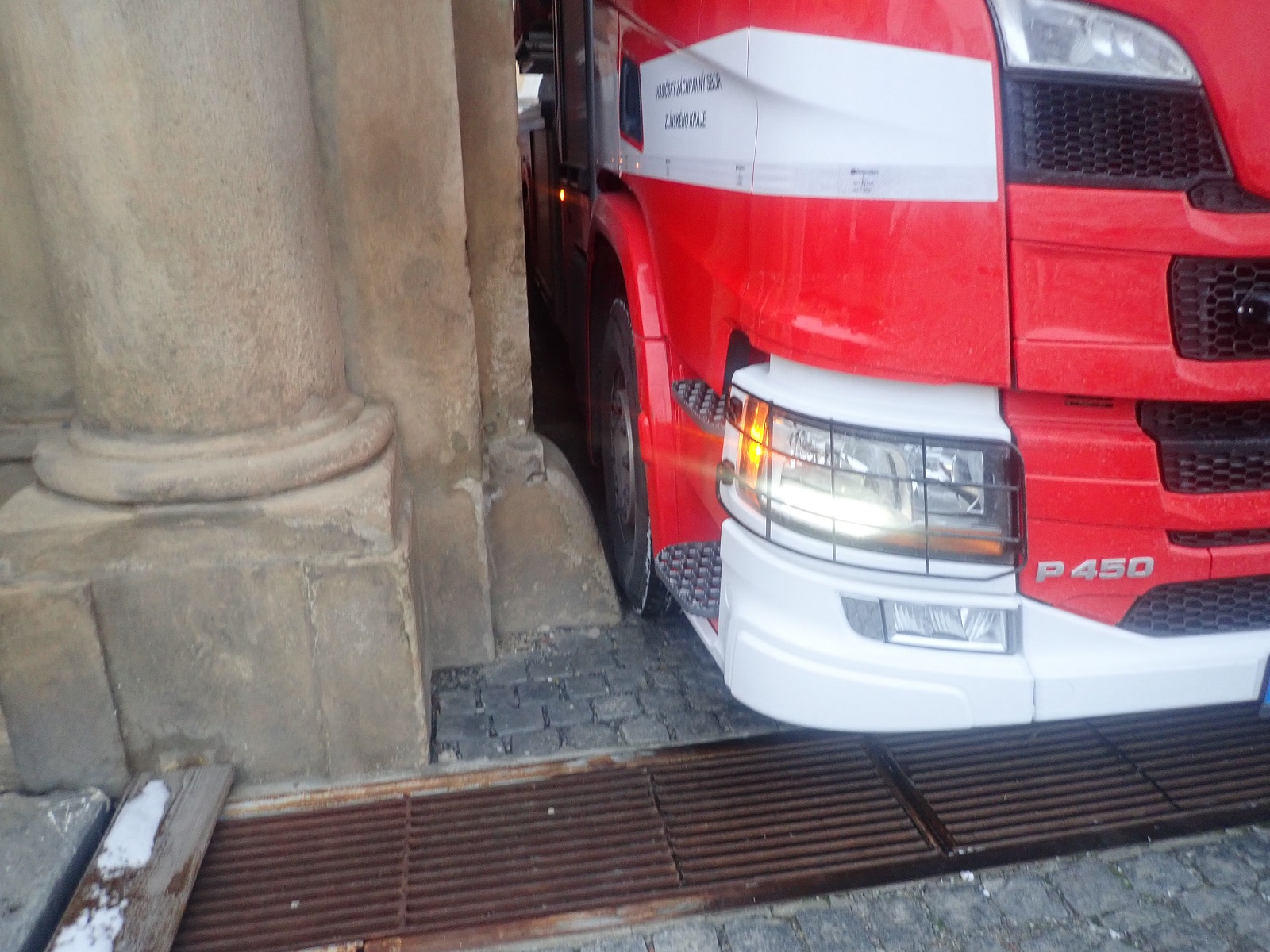 Průjezd výškové techniky hlavní vstupní bránou arcibiskupského zámku