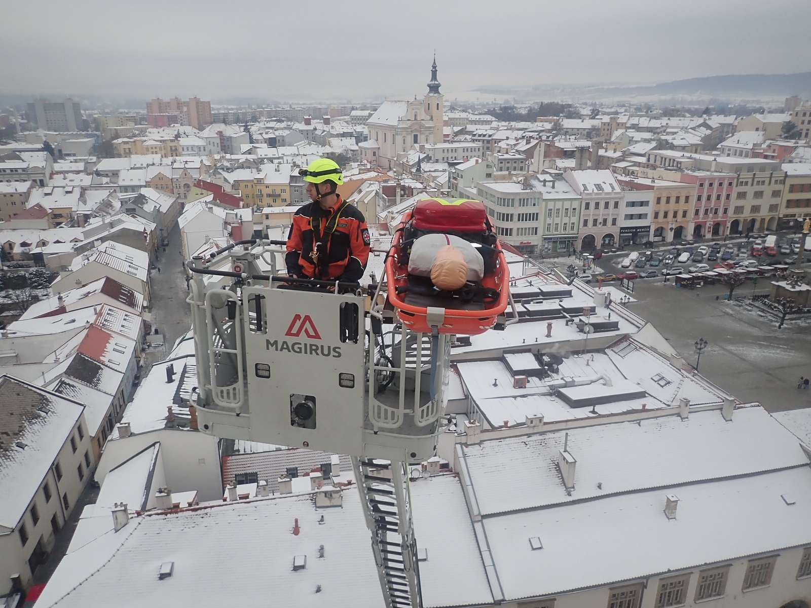 Nosítka s figurínou na koši výškové techniky