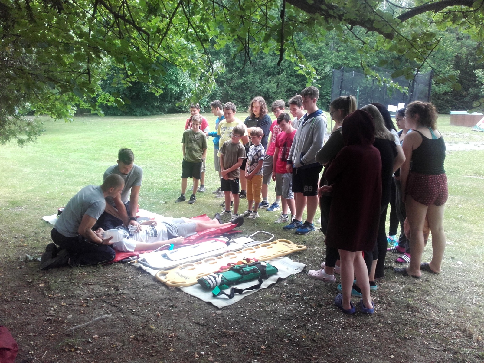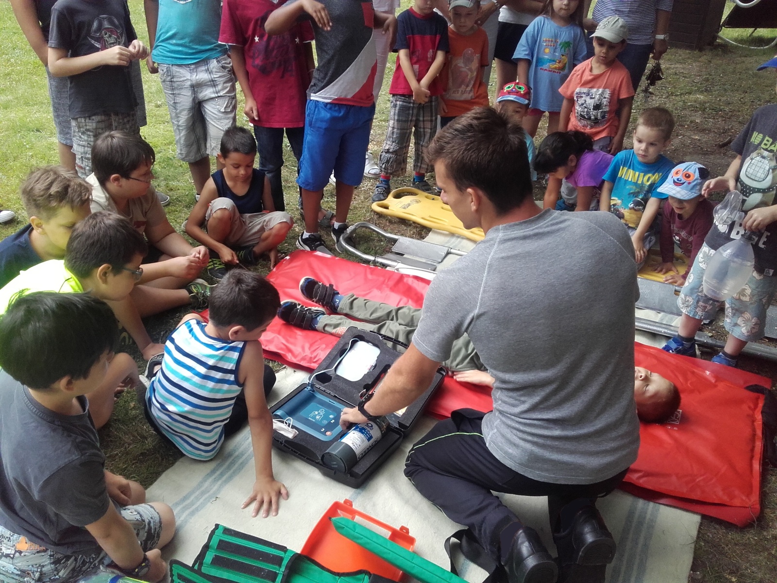 Na dalším stanovišti byli klienti seznámeni s první laickou pomocí za použití zdravotnických pomůcek a materiálů. Na několika „dobrovolnících“ byly předvedeny fixační pomůcky jako krční límec, celotělová vakuová matrace a různé druhy transportních nosítek. Hasiči přítomným ukázali i hydraulické vyprošťovací zařízení používané při vyprošťování osob z havarovaných vozidel, které je umístěno v rychlém zásahovém automobilu.