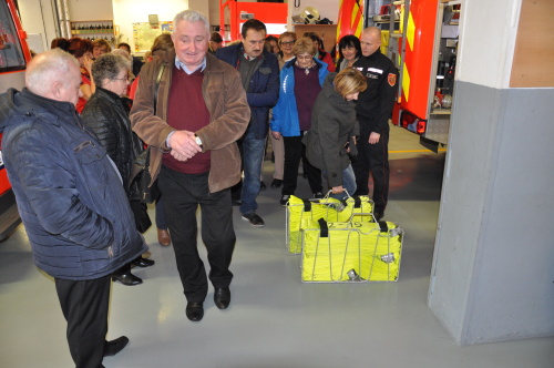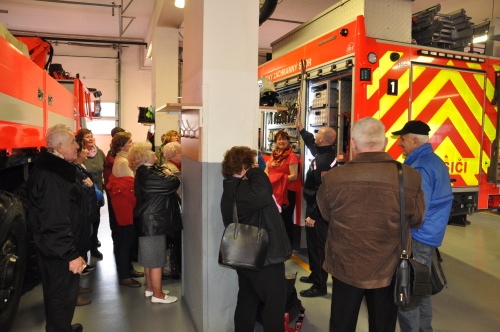 Skupinka seniorů se prostřídala v garážích, kde pro ně byla připravena prohlídka zásahových vozidel s vybavením pro požární a technické zásahy, např. vyprošťovací zařízení při dopravních nehodách, prostředky první pomoci a dále zásahových obleků. Senioři si mohli vyzkoušet přenášení hadic v drátěném koši i zásahový oblek.