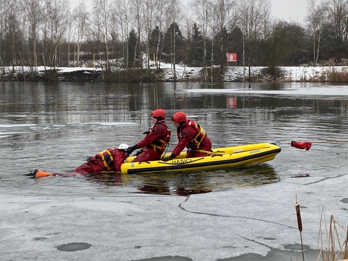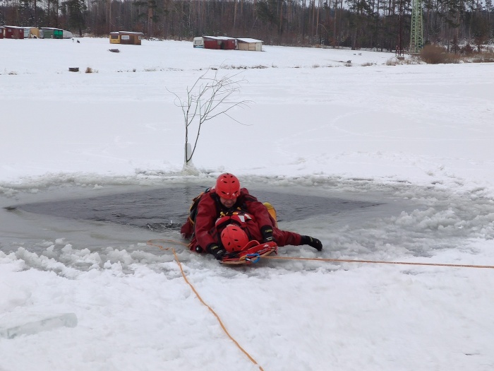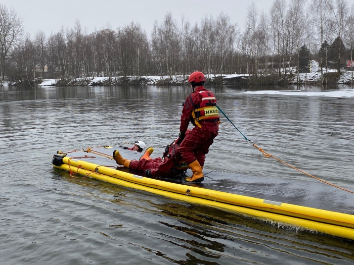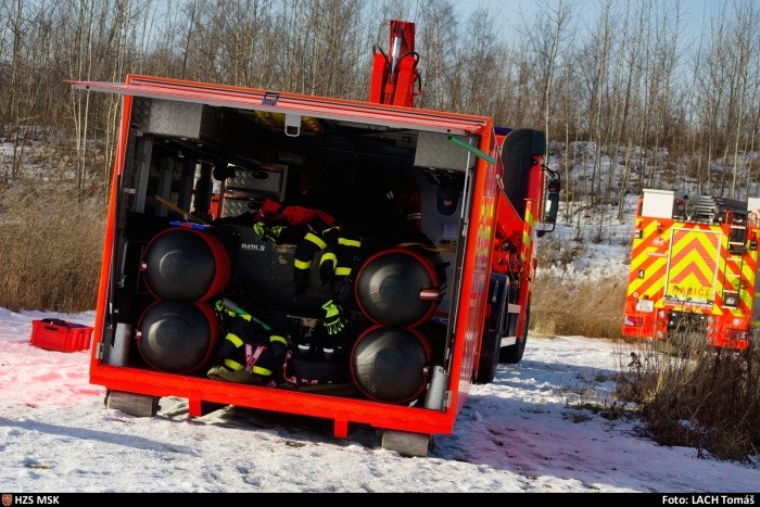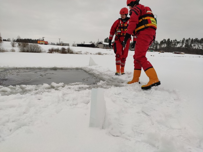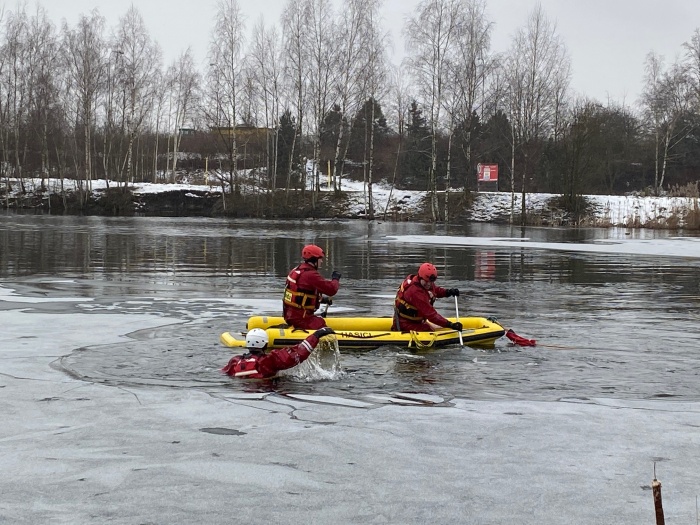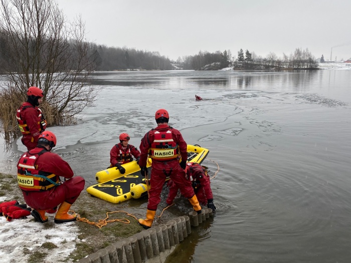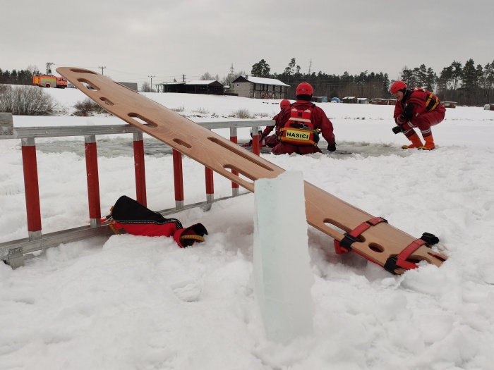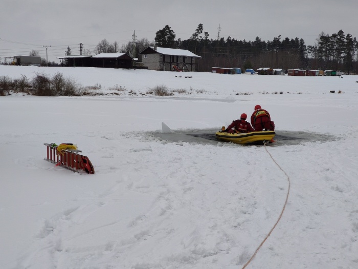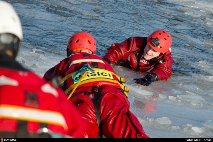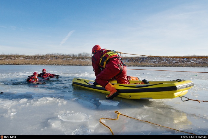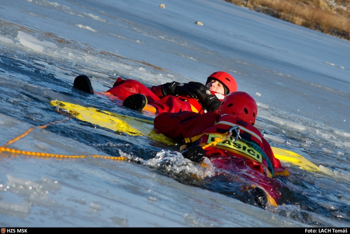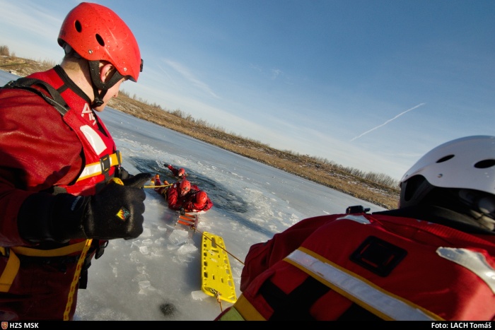 Ostravští hasiči trénovali na jezeře uplynulý týden dvakrát různé postupy záchrany osob, topících se v ledové vodě, například pouze hasičem, přivázaným k lanu, pak pomocí žebříku, hasičské hadice, páteřní desky a také pomocí nafukovacích záchranných saní RS5. Třetí výcvik absolvovali v pondělí 25.1. odpoledne: V plánu do konce ledna je celkem 6 výcviků (tedy čekají ještě tři), aby se zde mohli vystřídat hasiči ze všech šesti ostravských stanic HZS MSK.