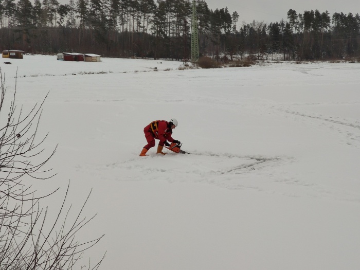 Na Balatonu asi 2,5 km jihovýchodně od Vítkova se minulý týden celkem cvičilo třikrát, aby se vystřídaly všechny tři směny hasičů ze zdejší stanice HZS MSK. Mezi použitými technickými prostředky byl házecí pytlík (s plovacím lanem), páteřní deska, jeden díl nastavovacího žebříku, nafukovací saně RS5, provizorně byl vyzkoušen i polohovací pás. Na západě Opavska bylo minulý týden asi trochu chladněji než v Ostravě, hasiči museli v úterý 19.1. vyřezat „výcvikový“ otvor do ledu (tehdy o tloušťce asi 10 cm) pomocí motorové řetězové pily.