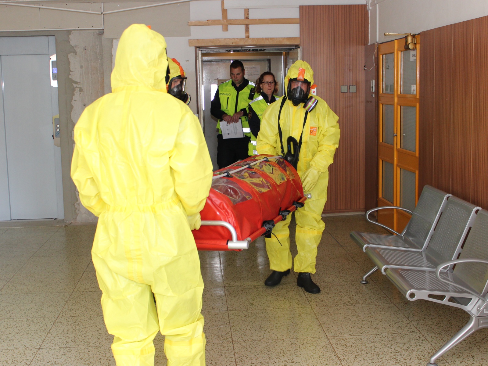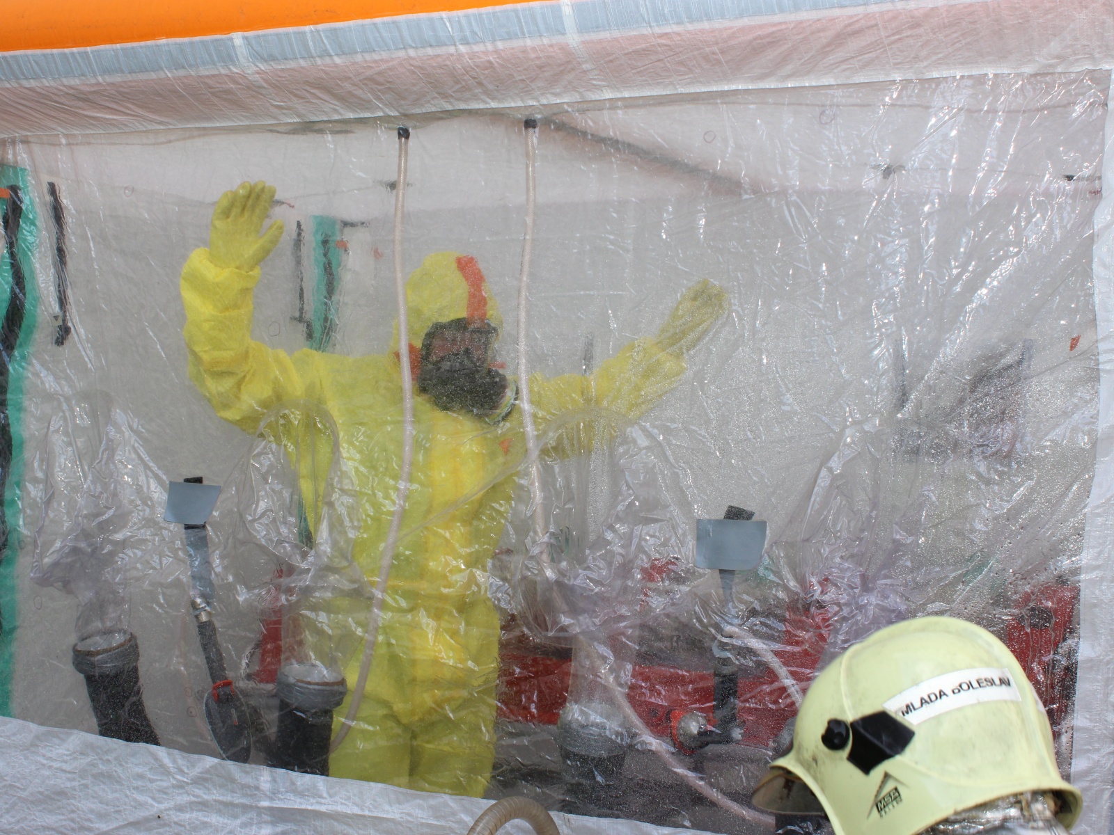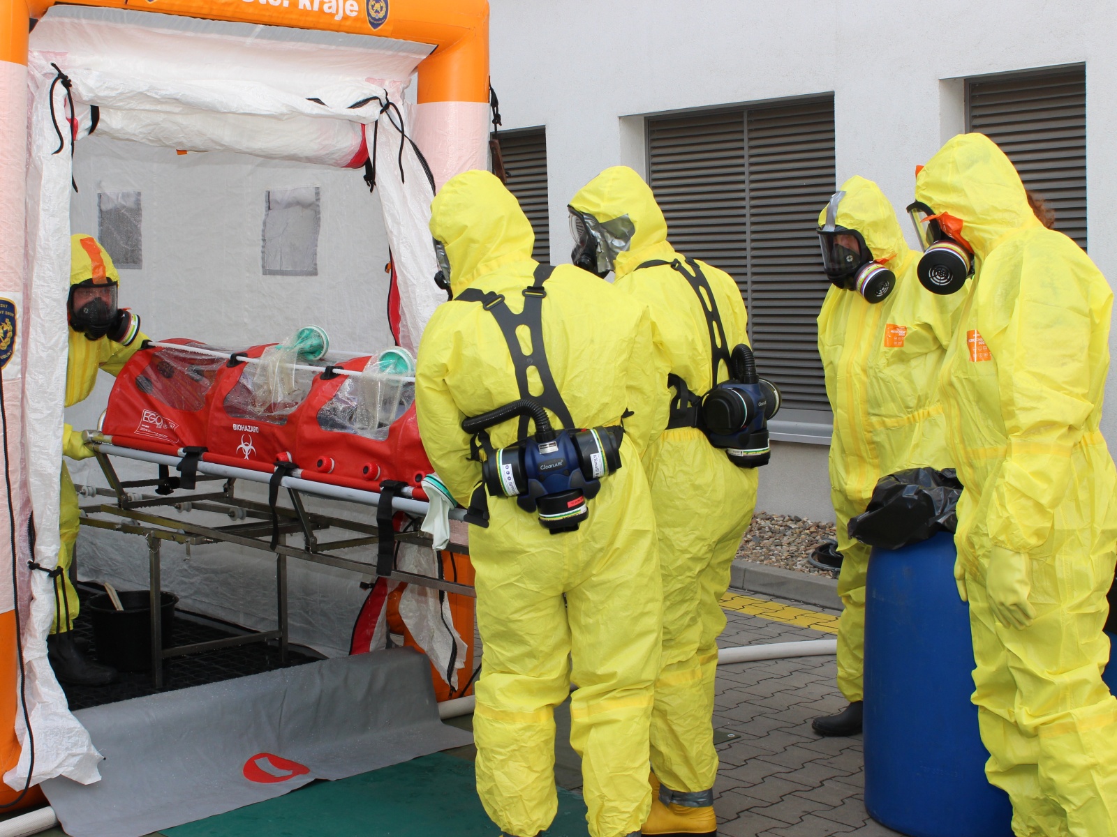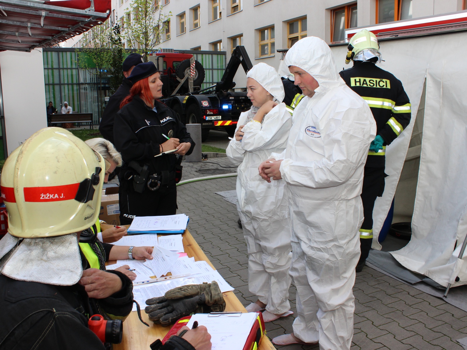 Po ustavení dekontaminačního stanoviště se jednotliví hasiči oblékli do ochranných obleků a vydali se do ordinace, odkud nejprve odvedli osoby z čekárny a následně i zdravotnický personál, který se zasaženou osobou přišel do styku. Nakonec vynesli ve speciálním biovaku nakaženého muže, kterého v tomto vaku také dekontaminovali a následně předali k transportu do cílového zařízení.